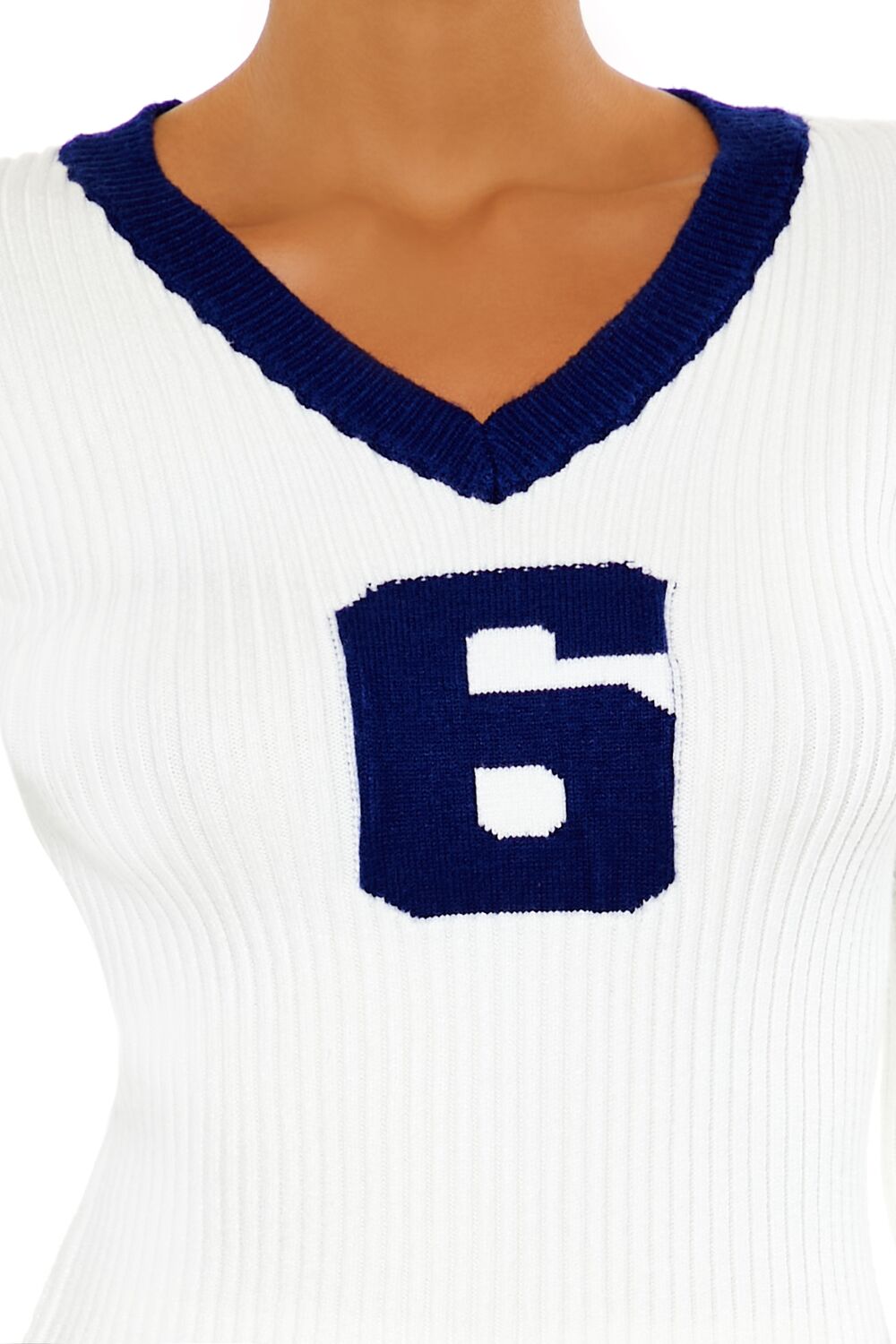 A ribbed knit sweater featuring contrasting trim. long sleeves. a V-neckline. and front ‘6’ graphic.