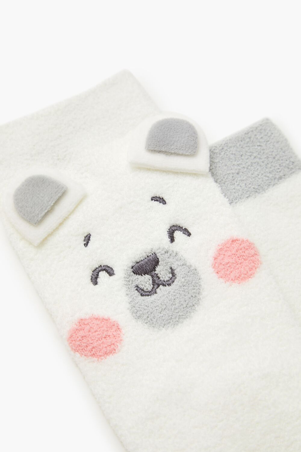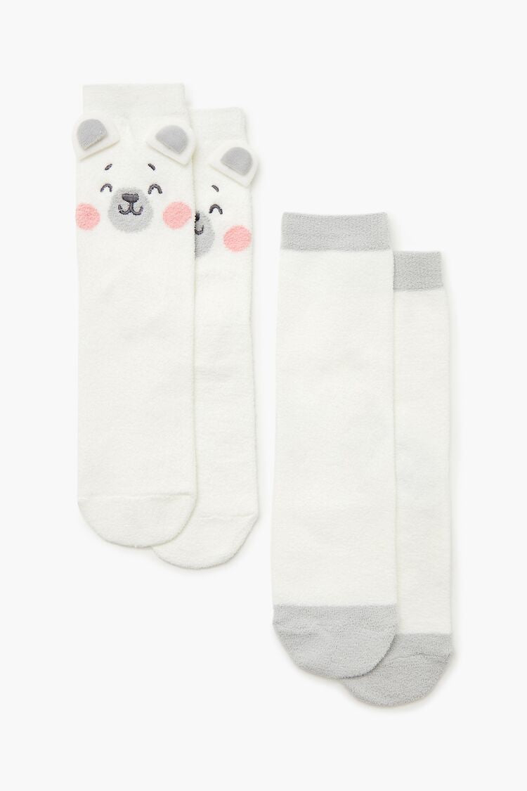 A set of knit crew socks featuring a pair with a bear face design and protruding ears. as well as a pair with contrasting trim.
