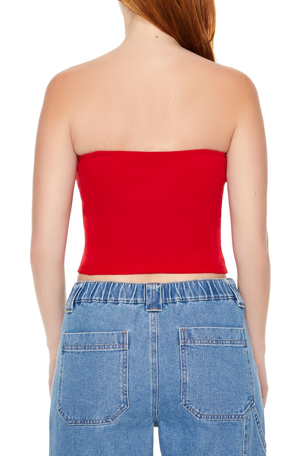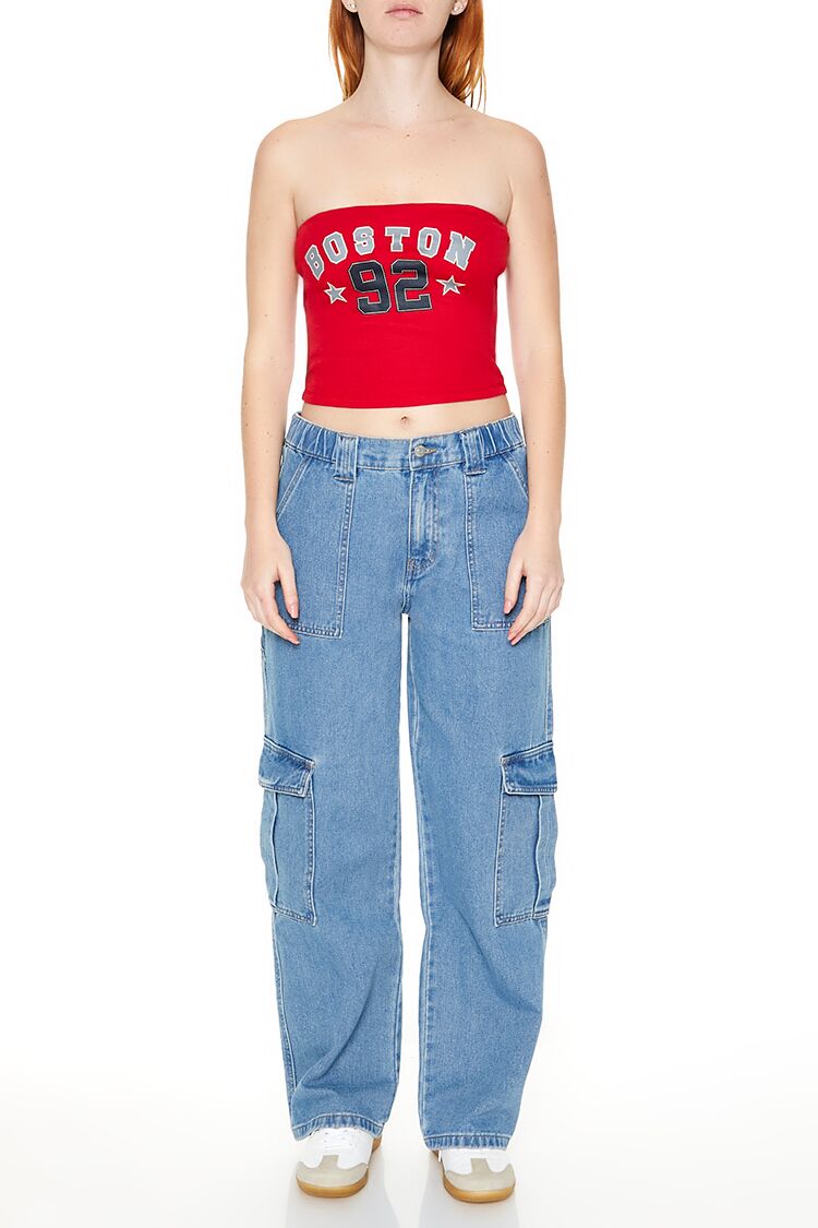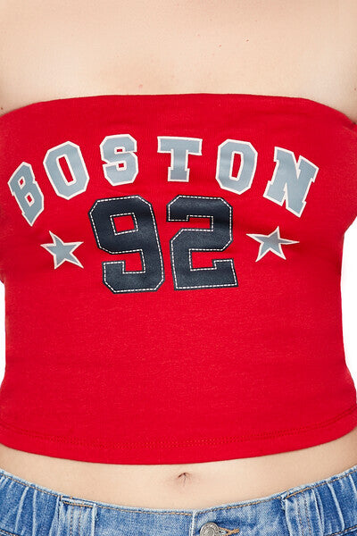 A ribbed knit tube top featuring front ‘Boston’ and ’92’ text with accompanying star graphics. straight-cut neckline and back. and cropped hem.