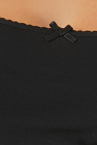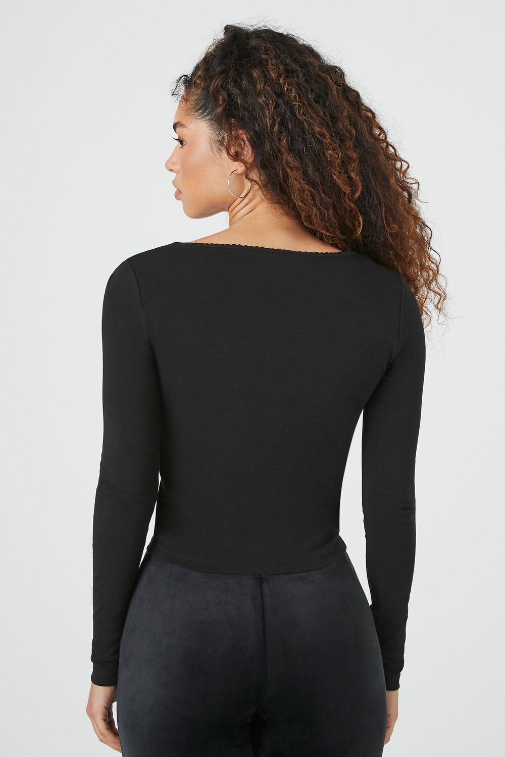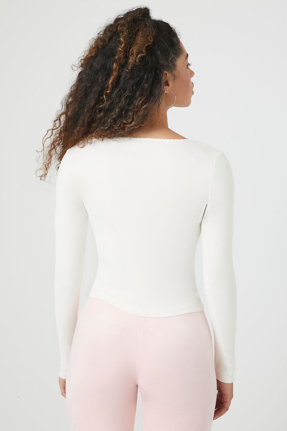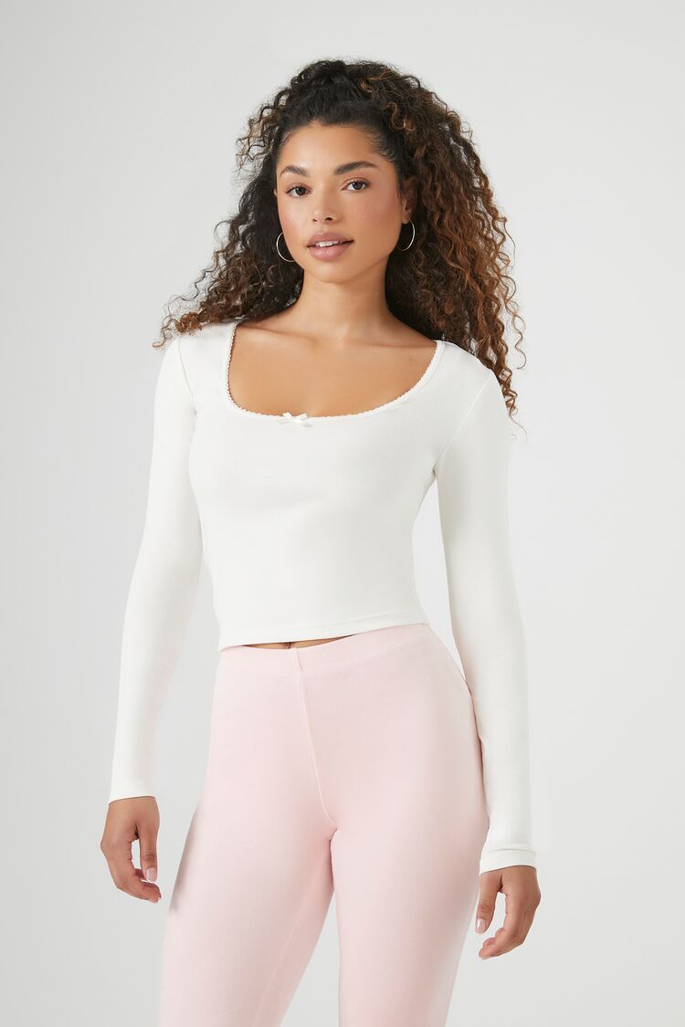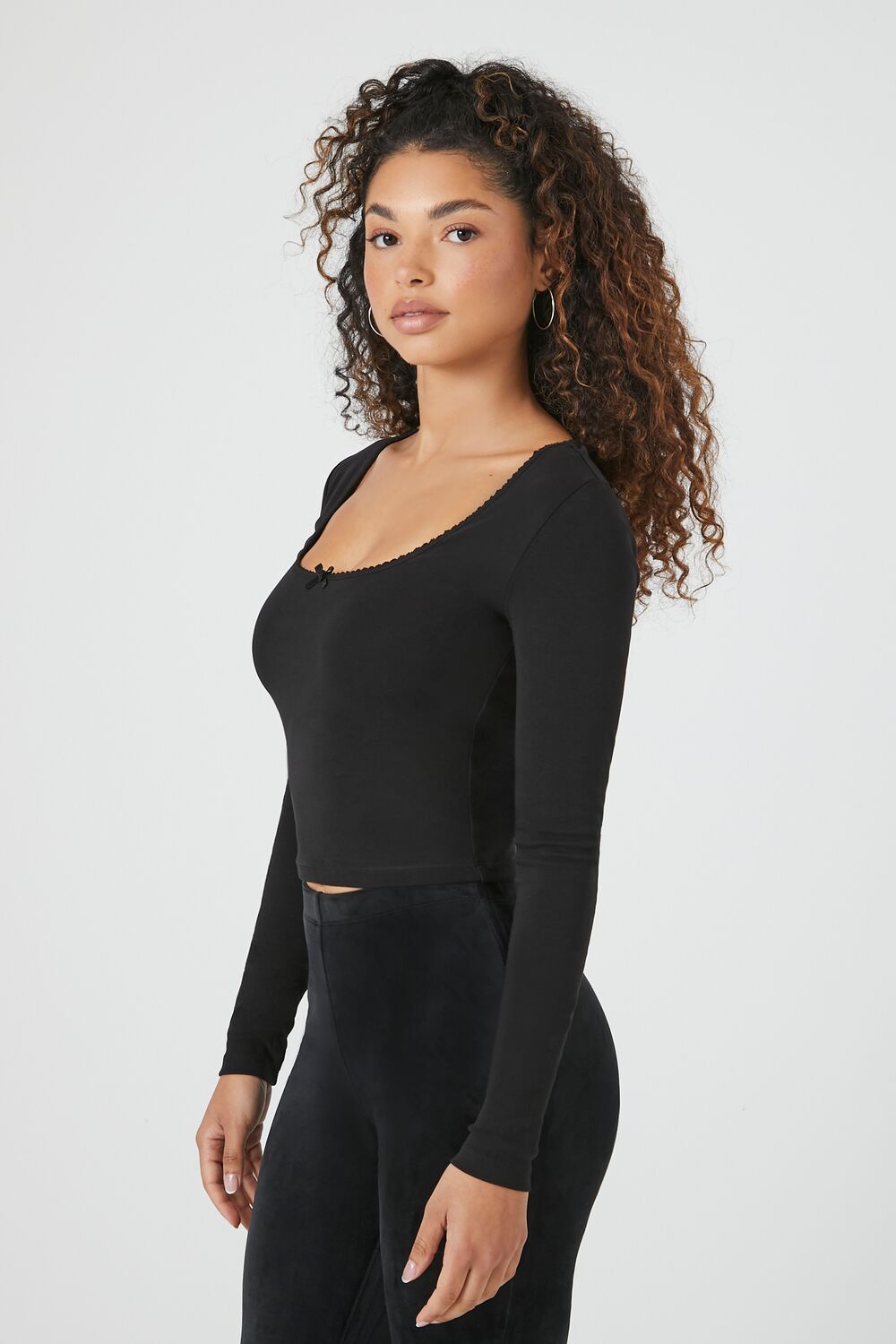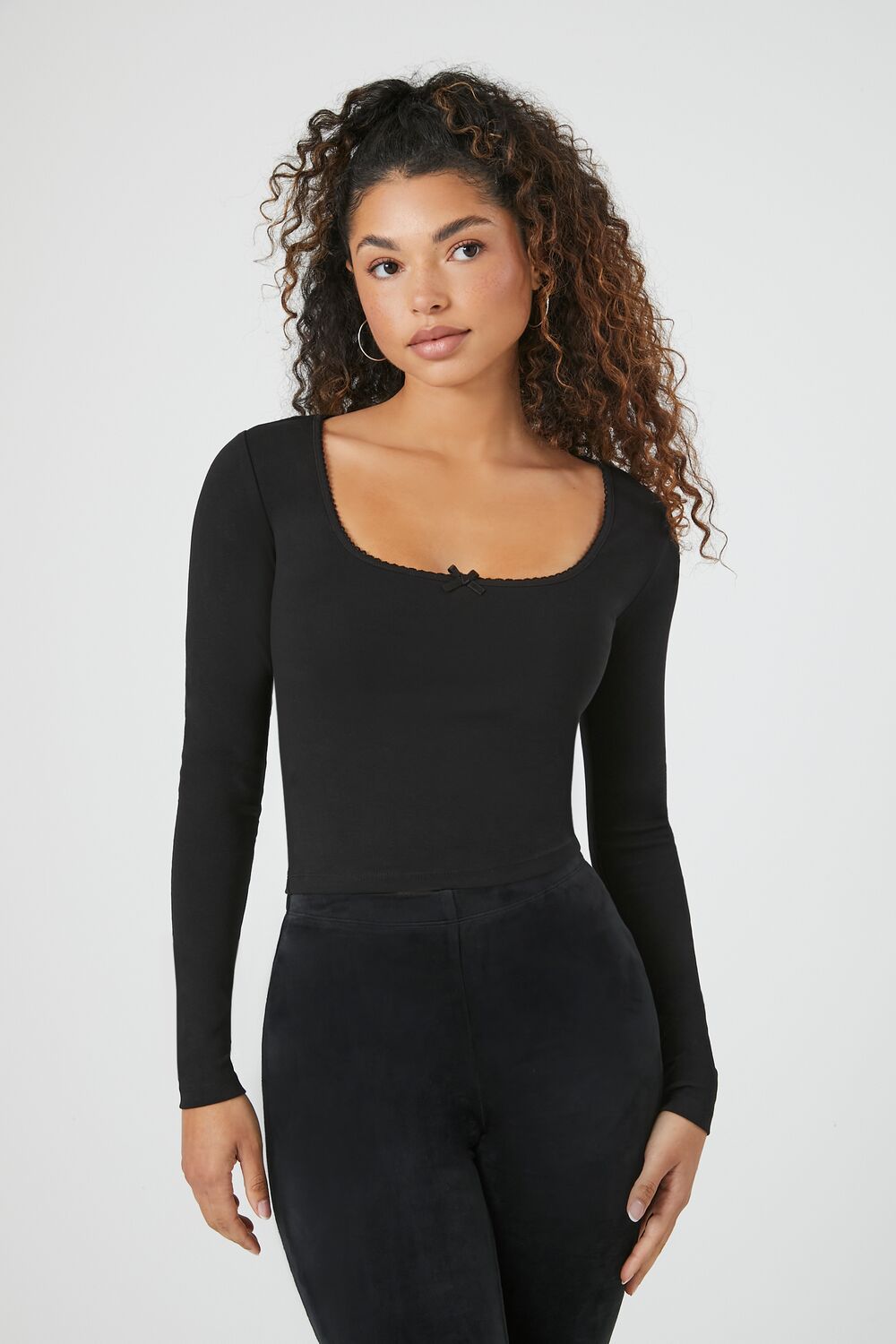 A knit top featuring a scoop neckline. front bow applique. picot trim. and long sleeves.