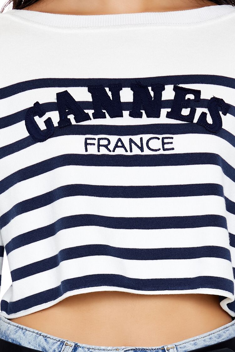 A knit sweater featuring a partial striped pattern. ‘Cannes’ and ‘France’ text. dropped long sleeves. a boat neckline. and cropped hem.