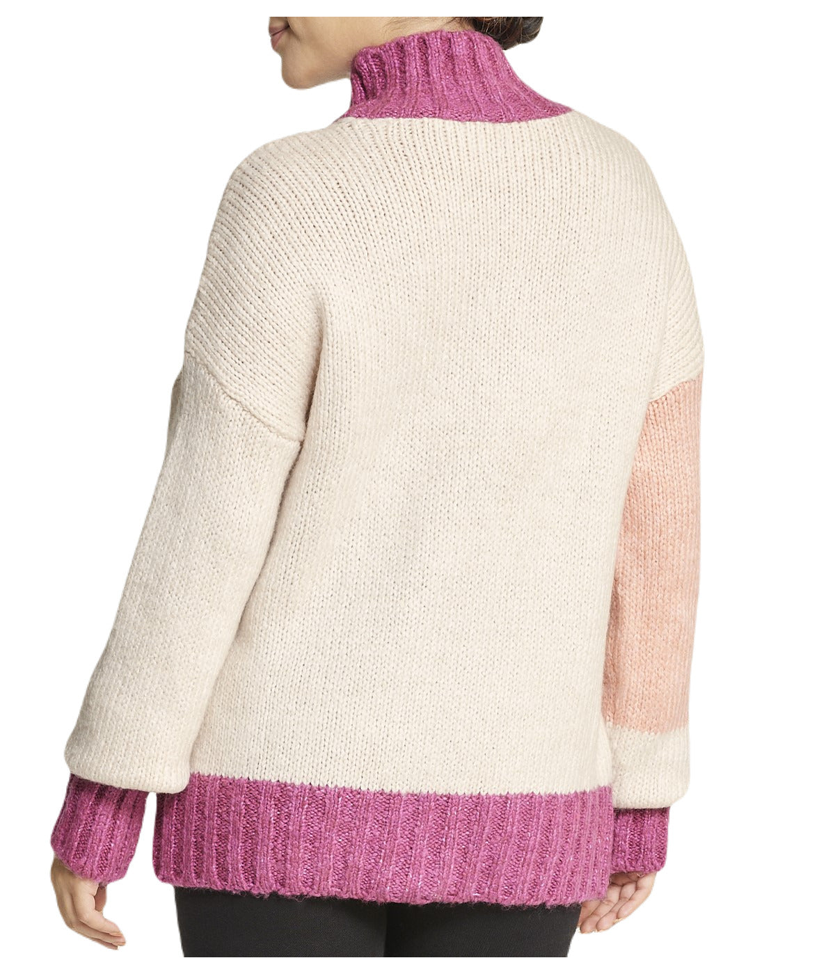 In addition to its comfort. this mock neck tunic sweater features a trend right color block pattern. This garment runs small. please size up.