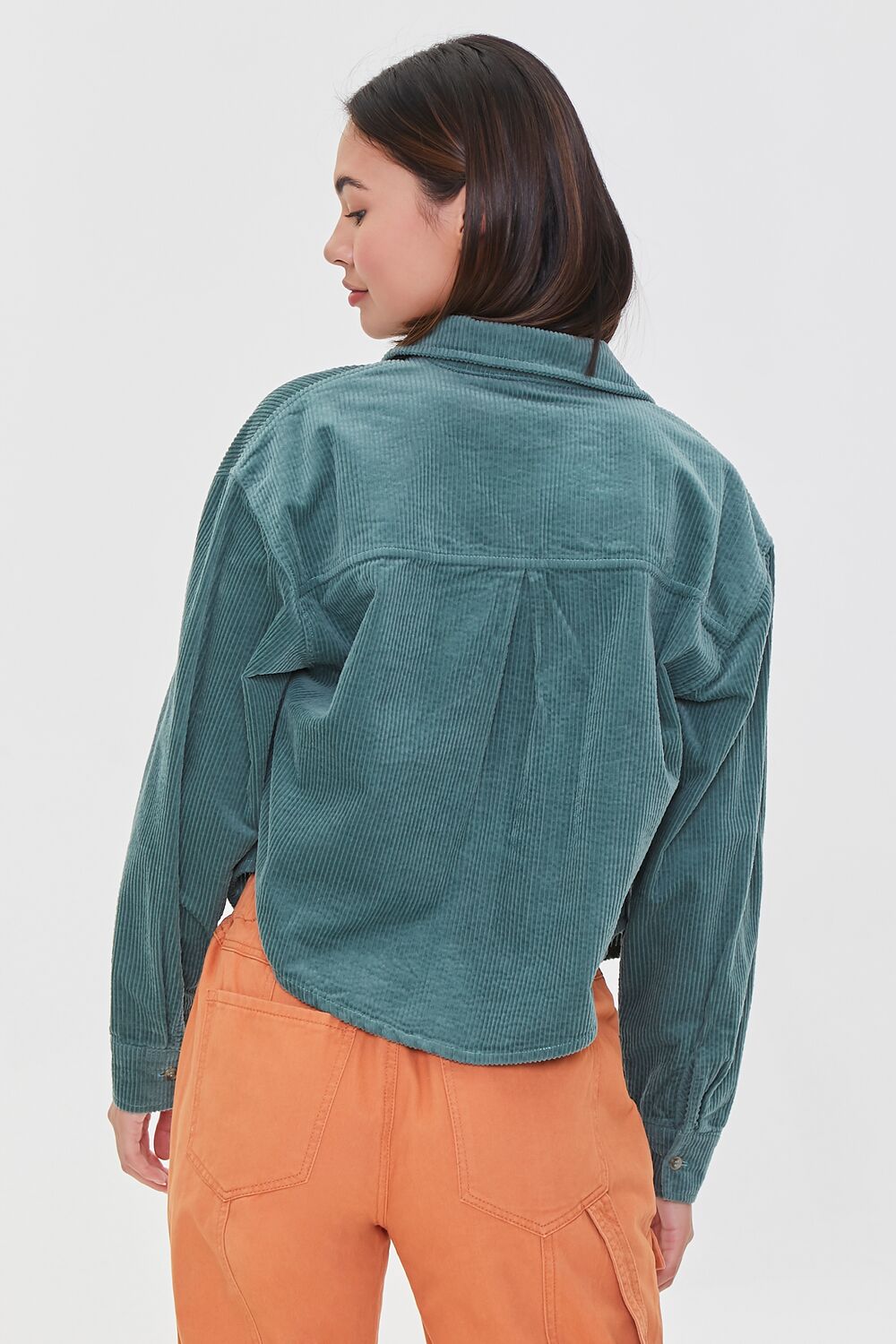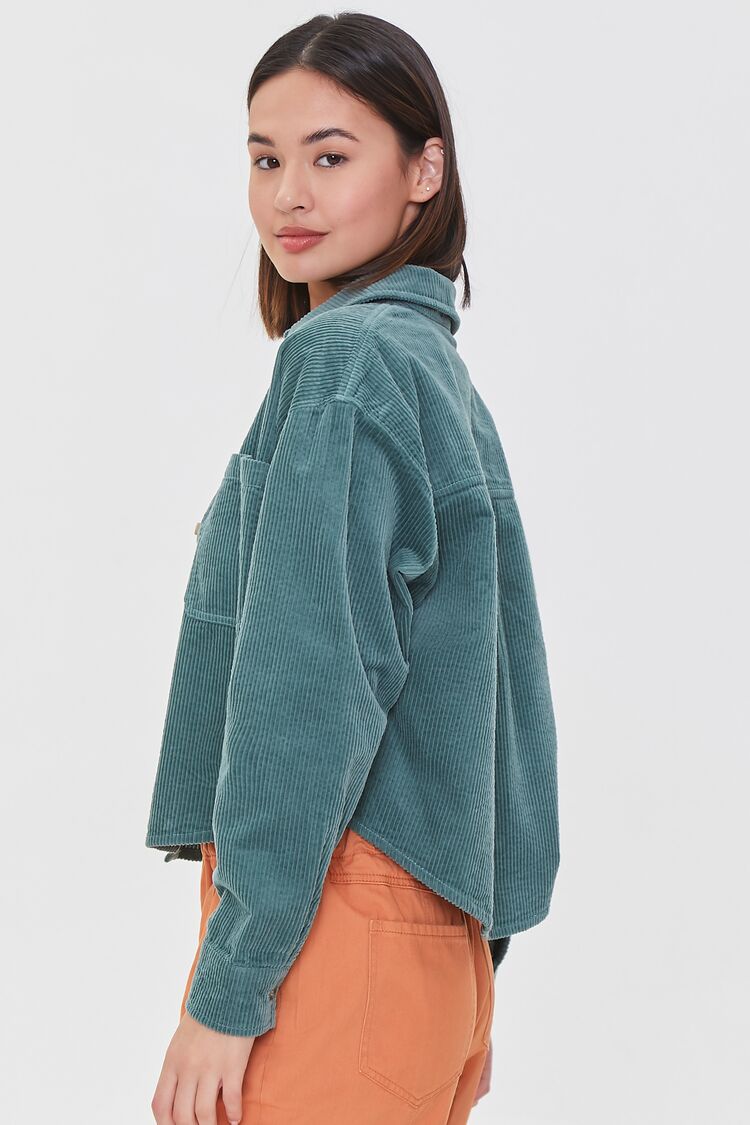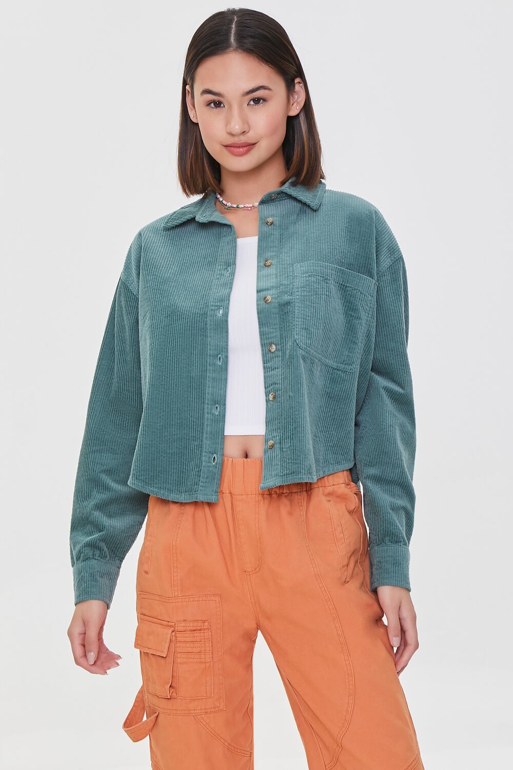 Style Deals – A corduroy shacket featuring button-front closures. a high-low curved hem. long sleeves. a basic collar. and chest patch pocket.