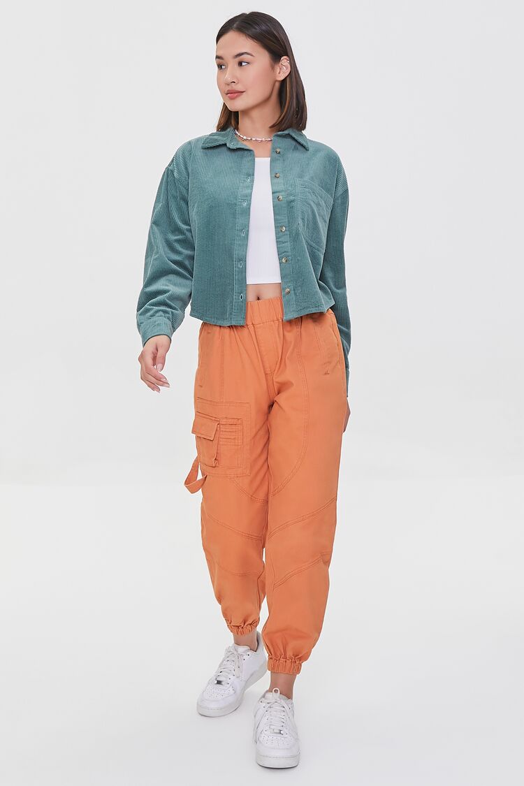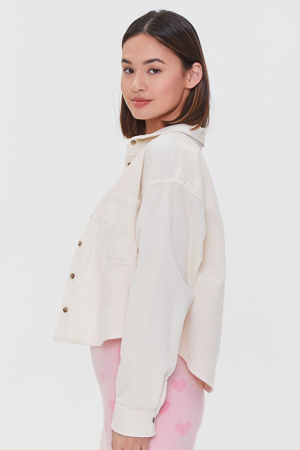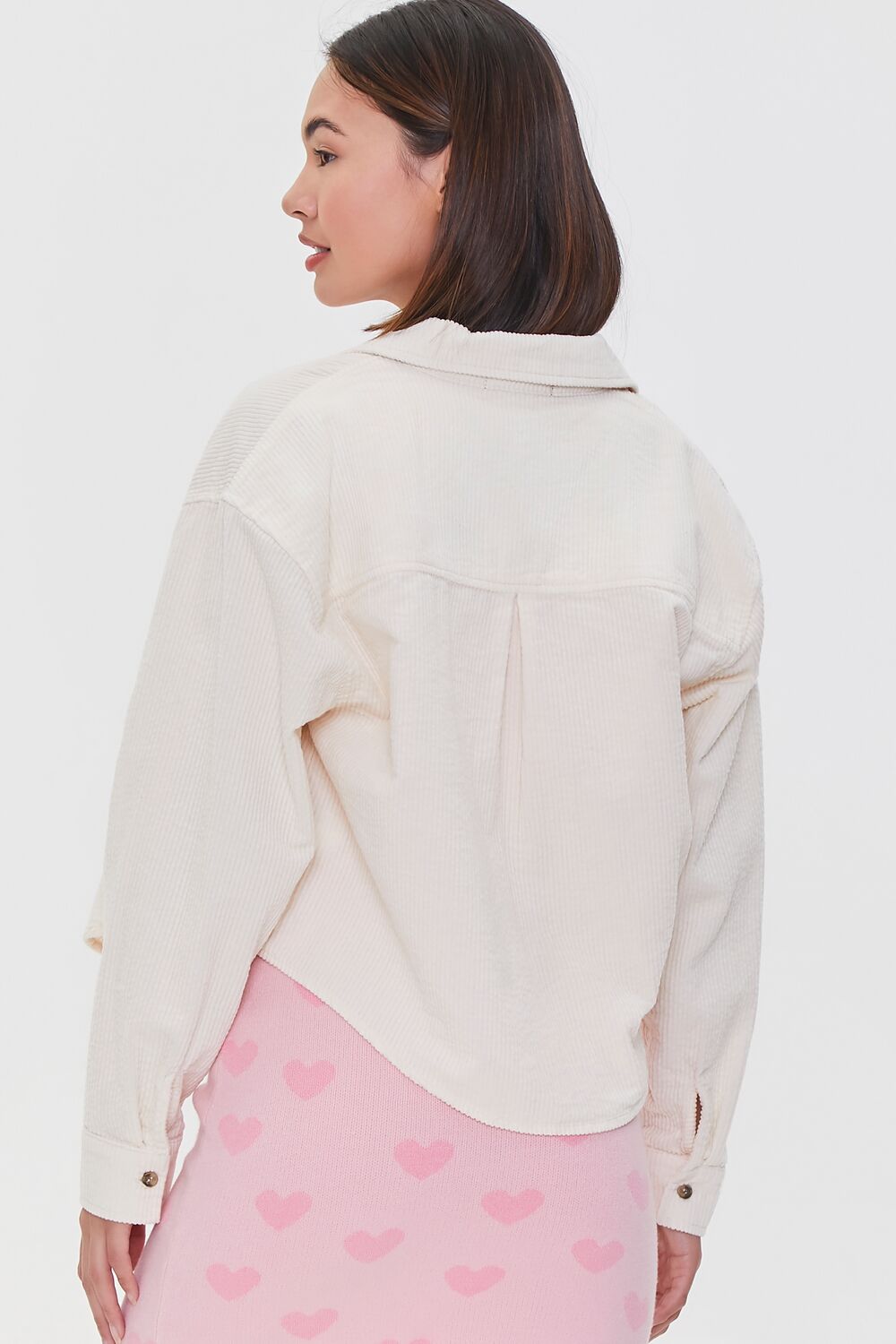 Style Deals – A corduroy shacket featuring button-front closures. a high-low curved hem. long sleeves. a basic collar. and chest patch pocket.