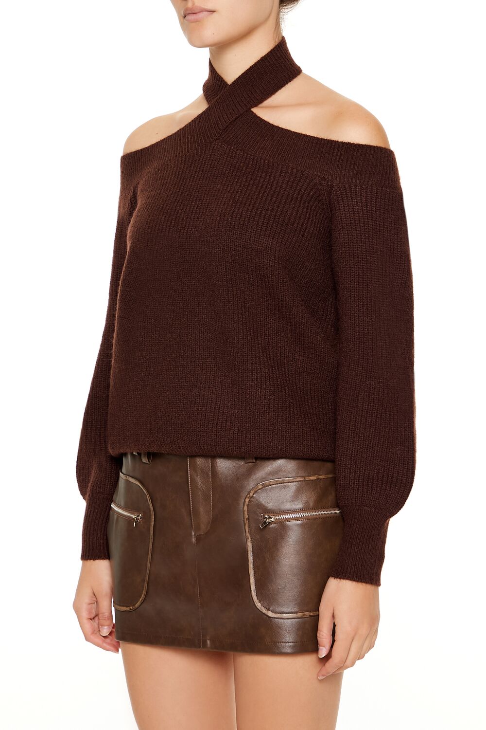 A ribbed knit sweater featuring a halter off-the-shoulder neckline. long balloon sleeves. and open back.