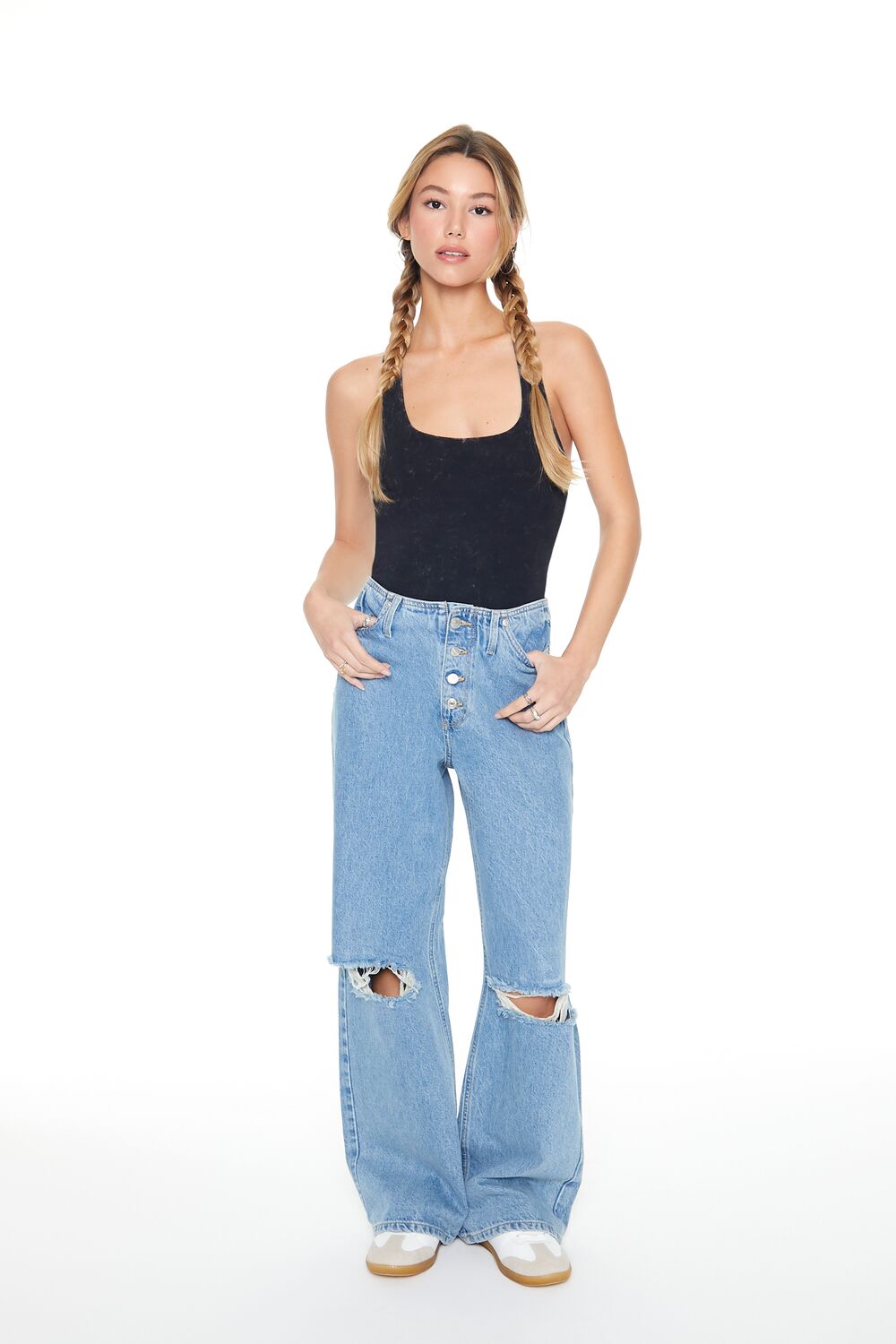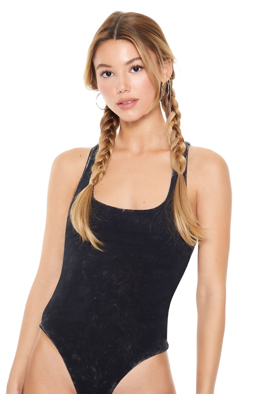 A knit tank bodysuit featuring an allover mineral wash. square neckline. and crisscross back straps.