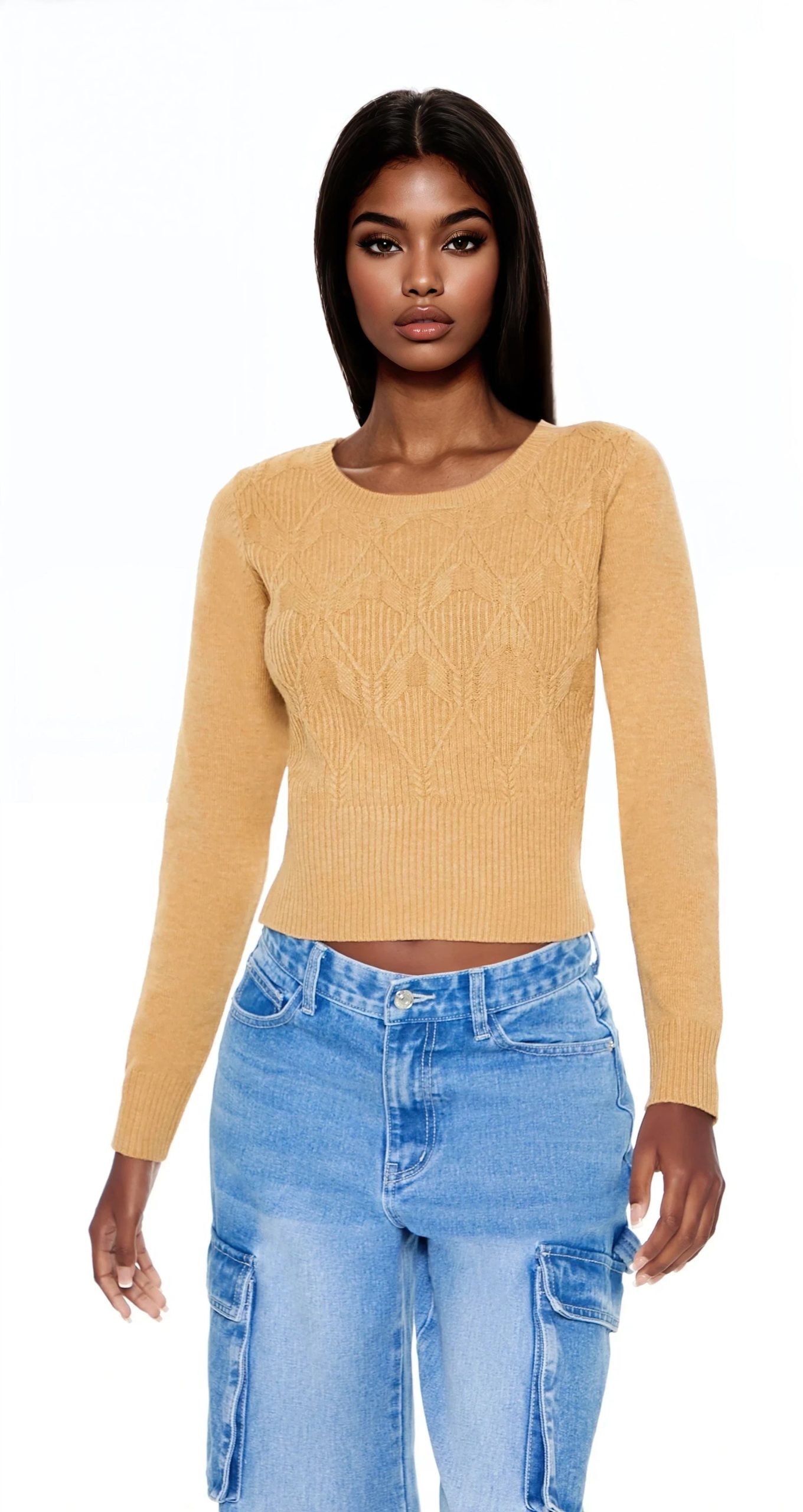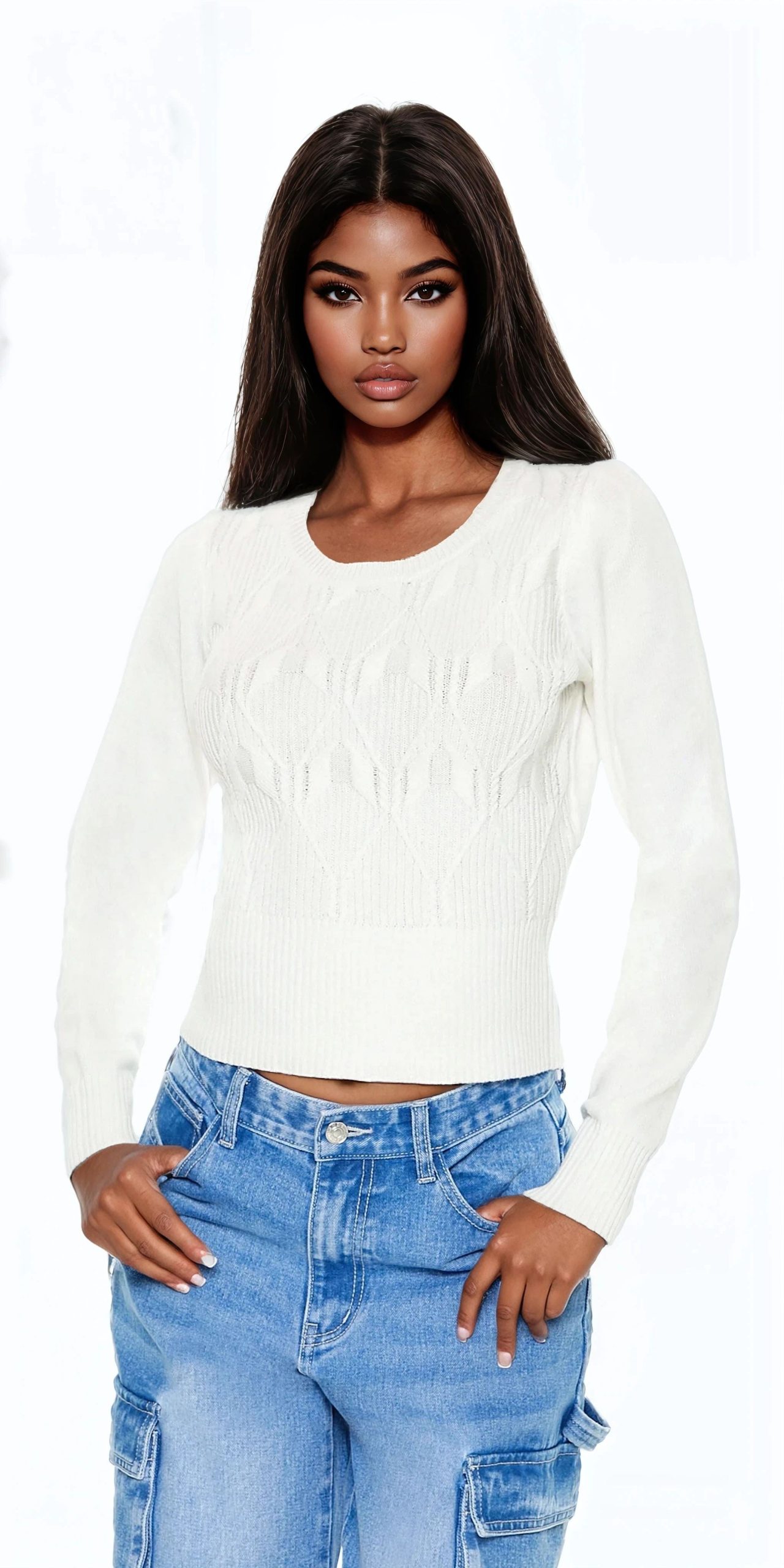 A knit sweater featuring a round neckline. long sleeves. front lattice pattern. ribbed trim. and a cropped hem.