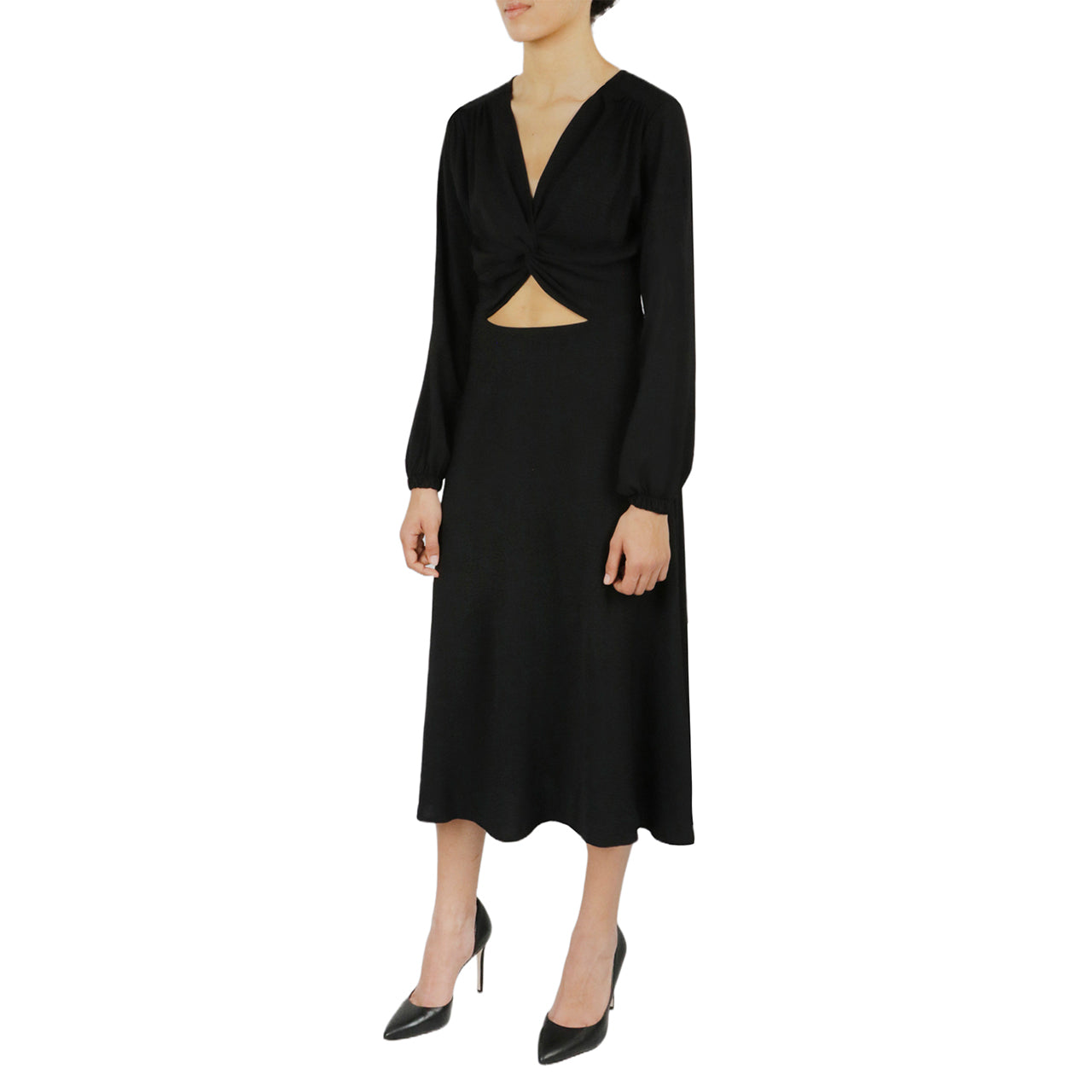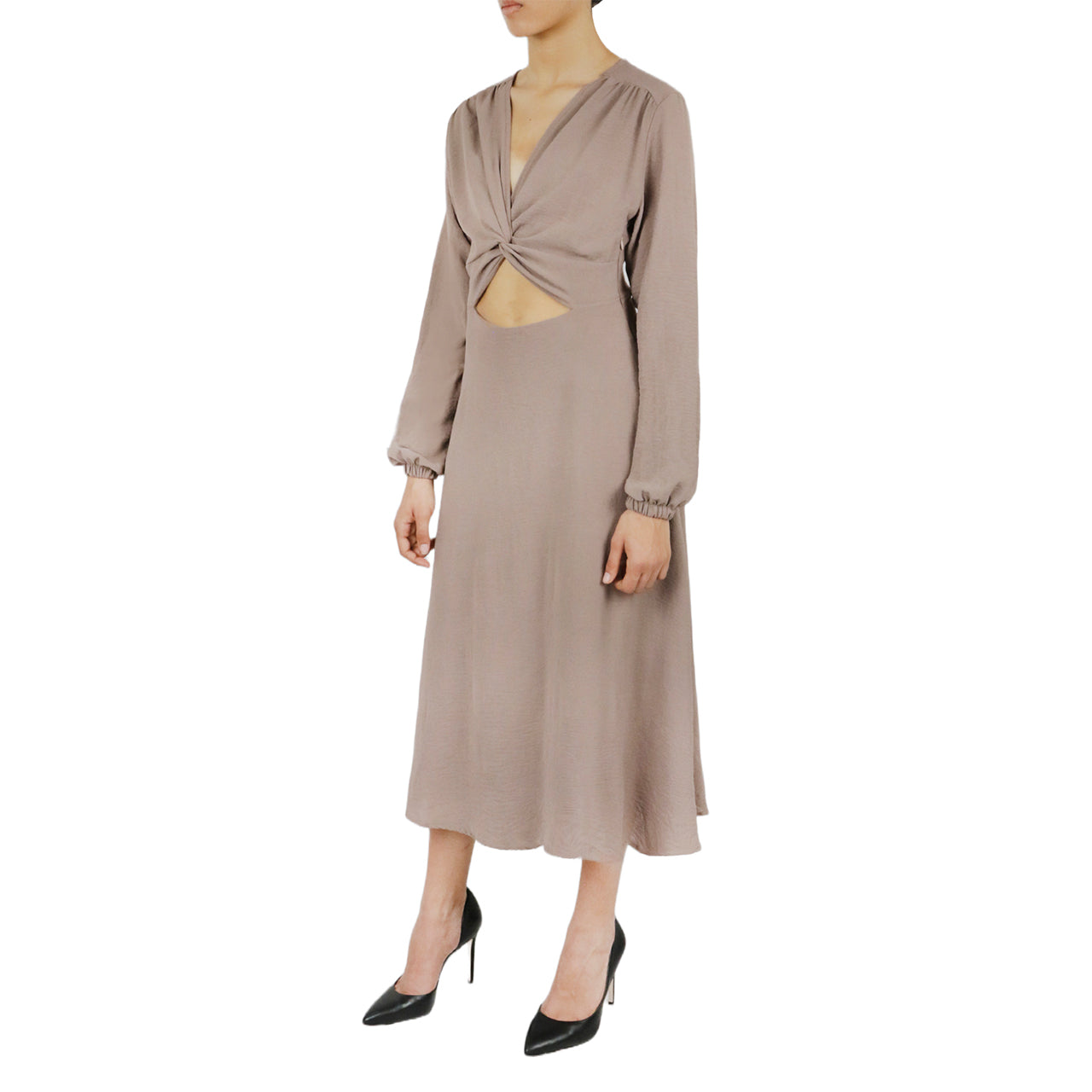 This dress features a cut-out design and romantic puff sleeves. This garment runs small. please size up.