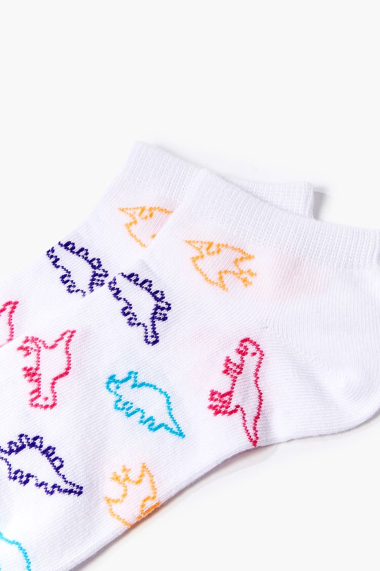 A pair of knit ankle socks featuring an allover multicolored dinosaur print and ribbed trim.