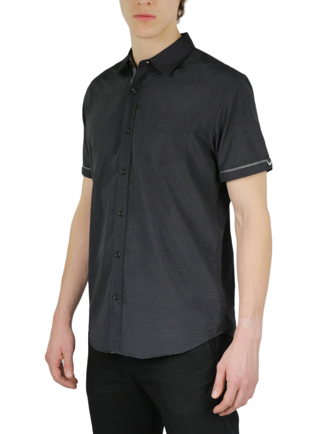 The collared short sleeve button front shirt features a ditsy print. straight hem and 1 chest patch pocket
