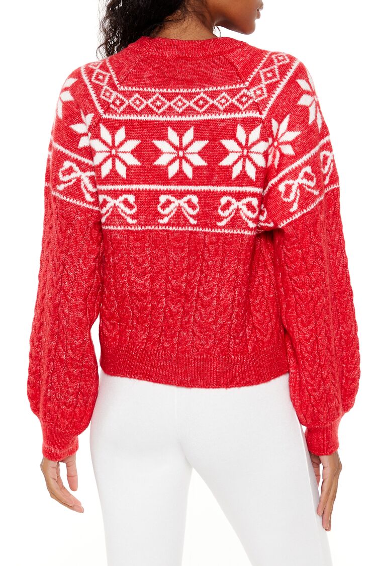 A cable knit sweater featuring a partial Fair Isle and bow pattern. round neckline. and long sleeves.