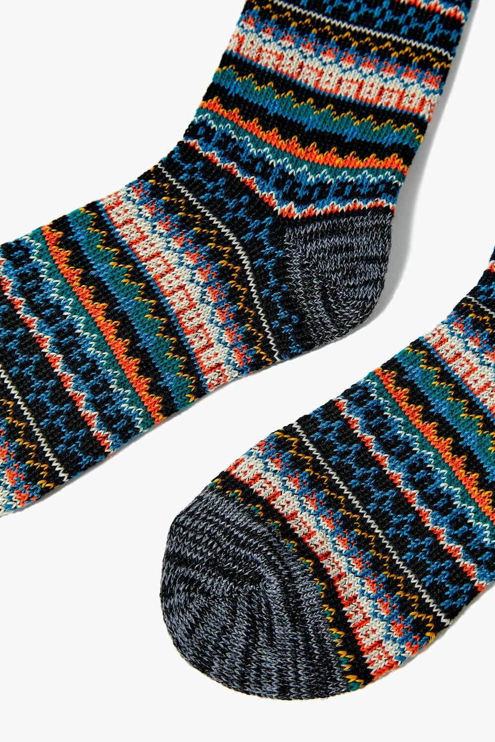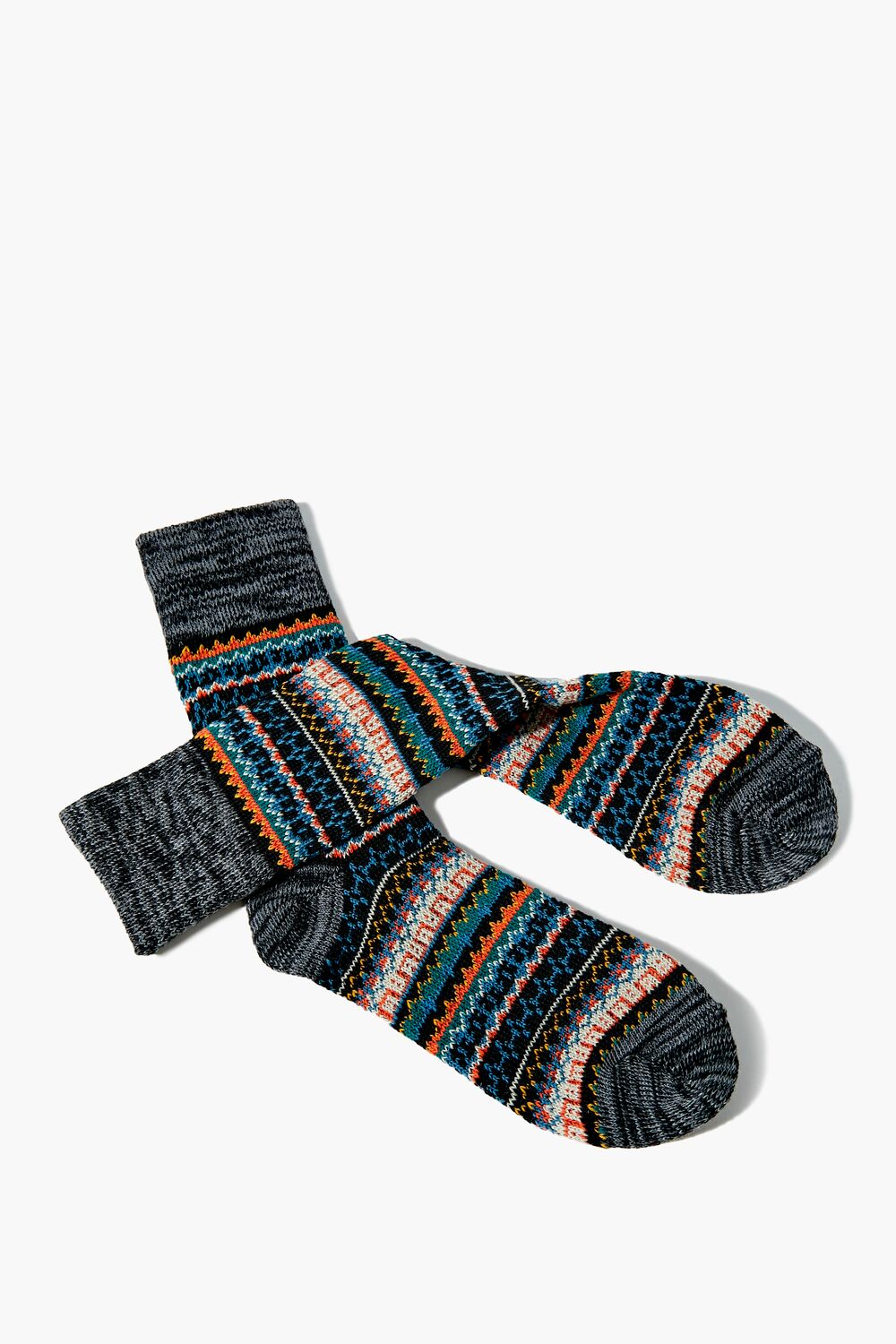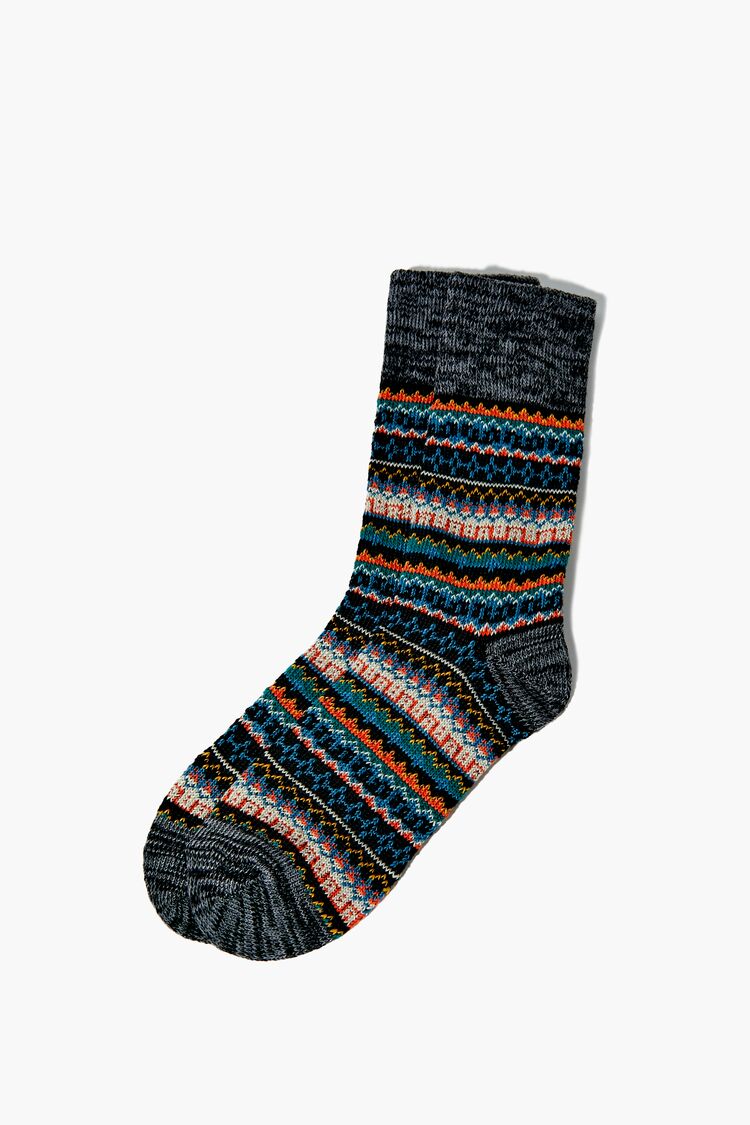 A pair of marled knit crew socks featuring an allover Fair Isle pattern.