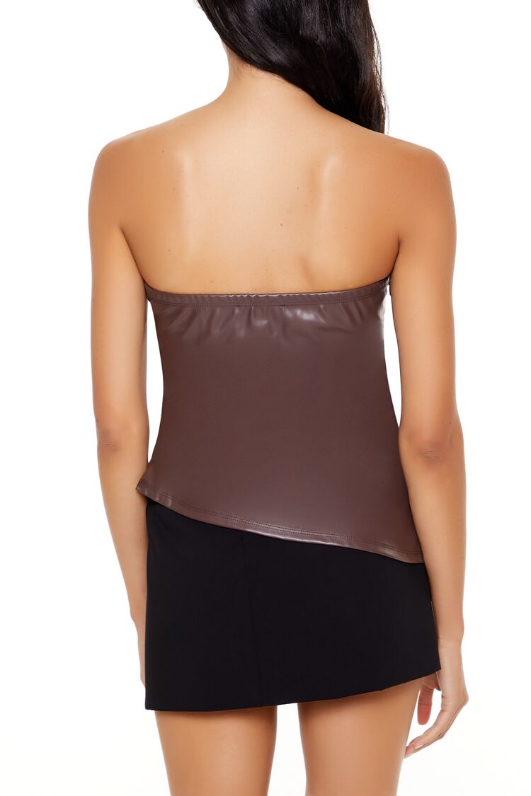 A faux leather tube top featuring a straight-cut neckline and back and asymmetrical hem.