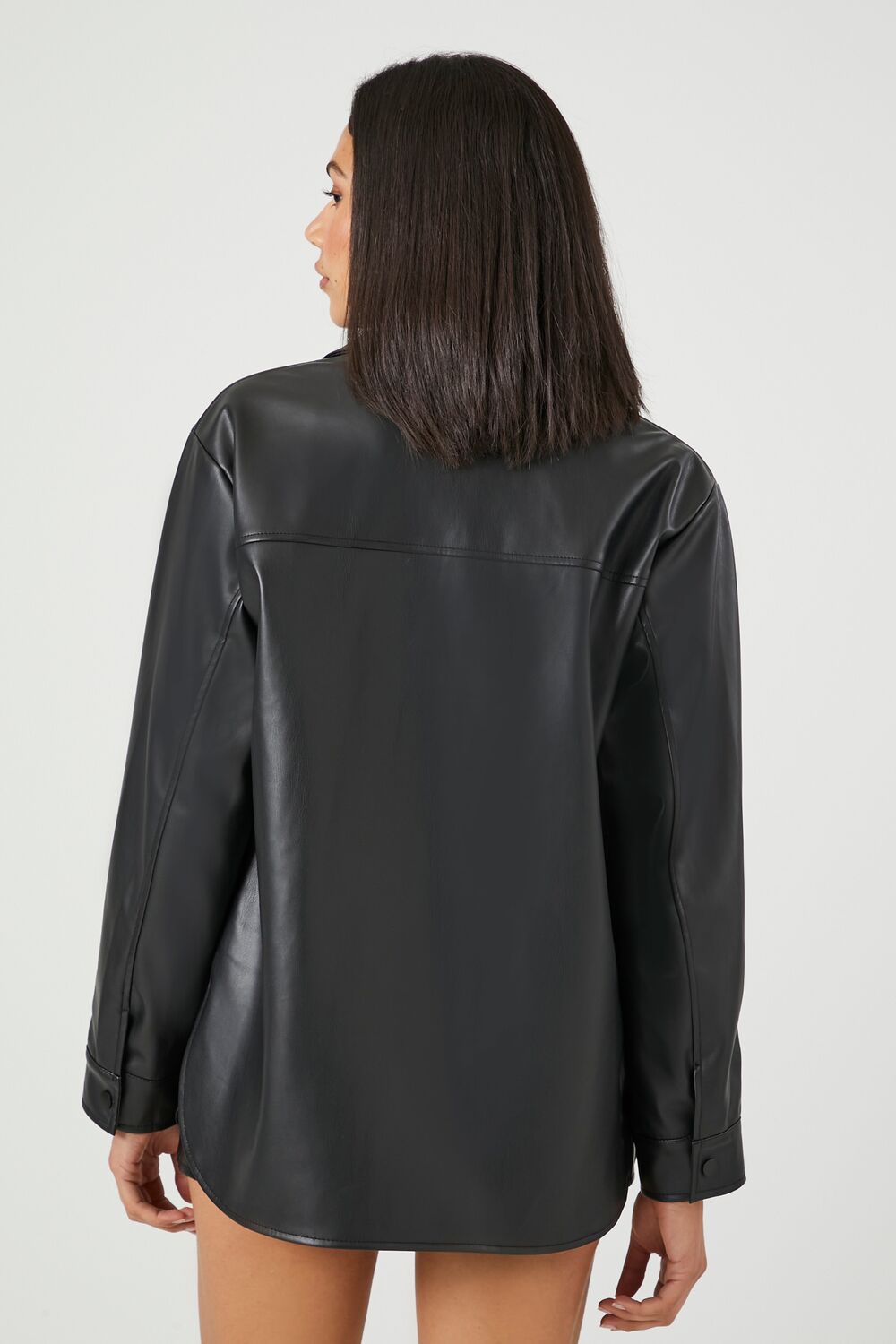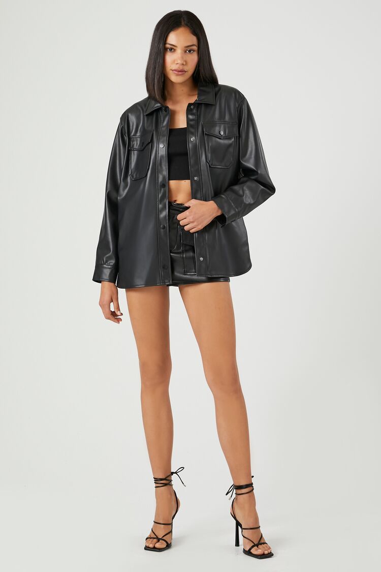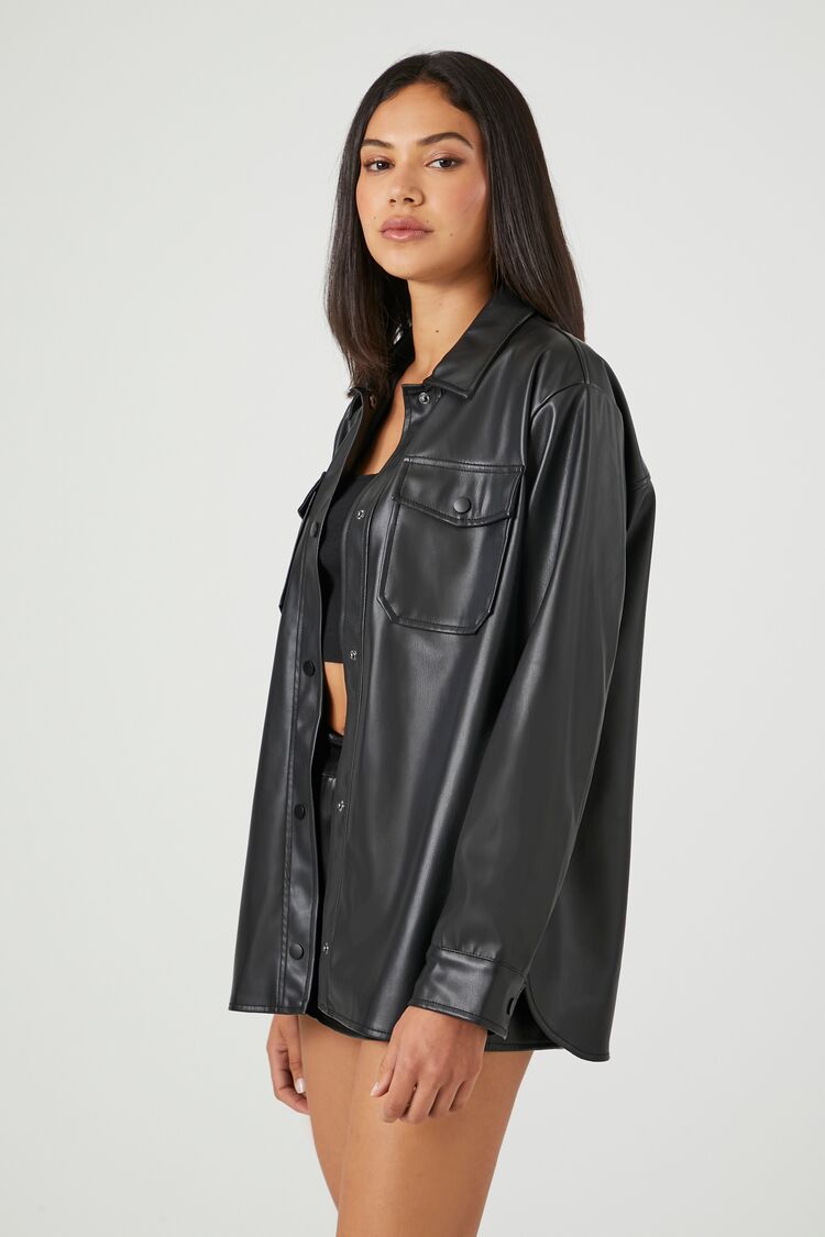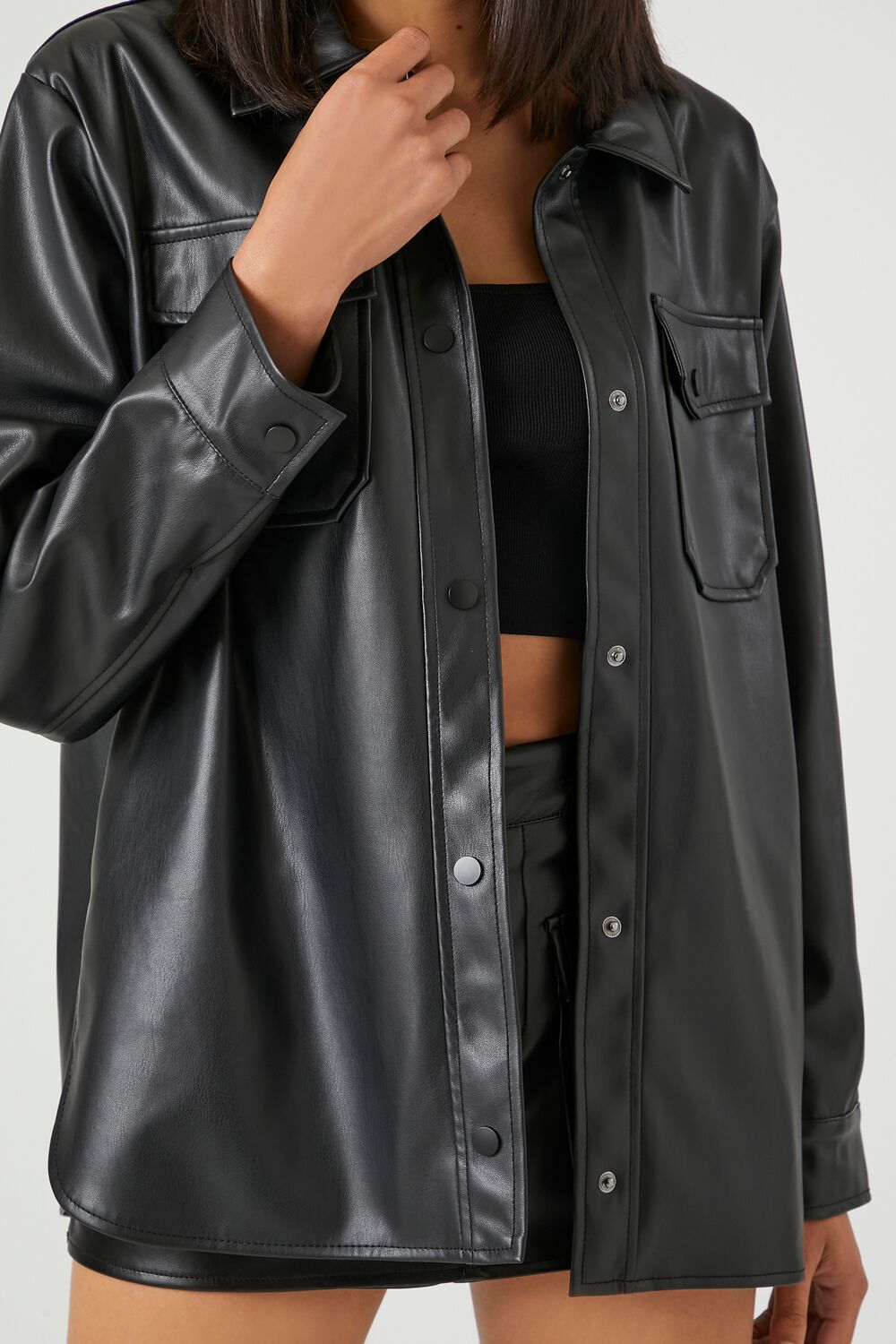 A faux leather shacket featuring snap-button front closures. long sleeves. chest flap pockets. a basic collar. and vented hem.