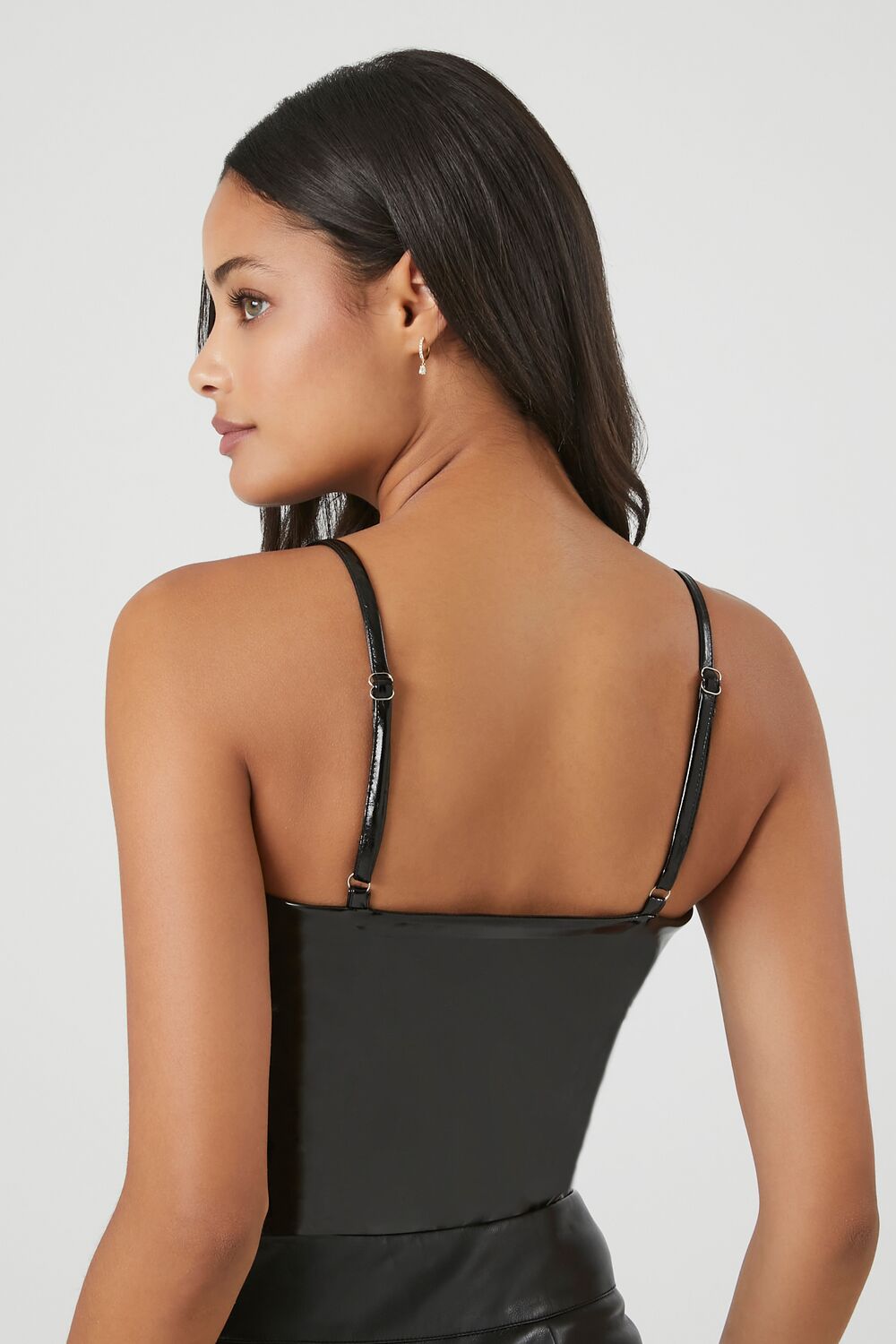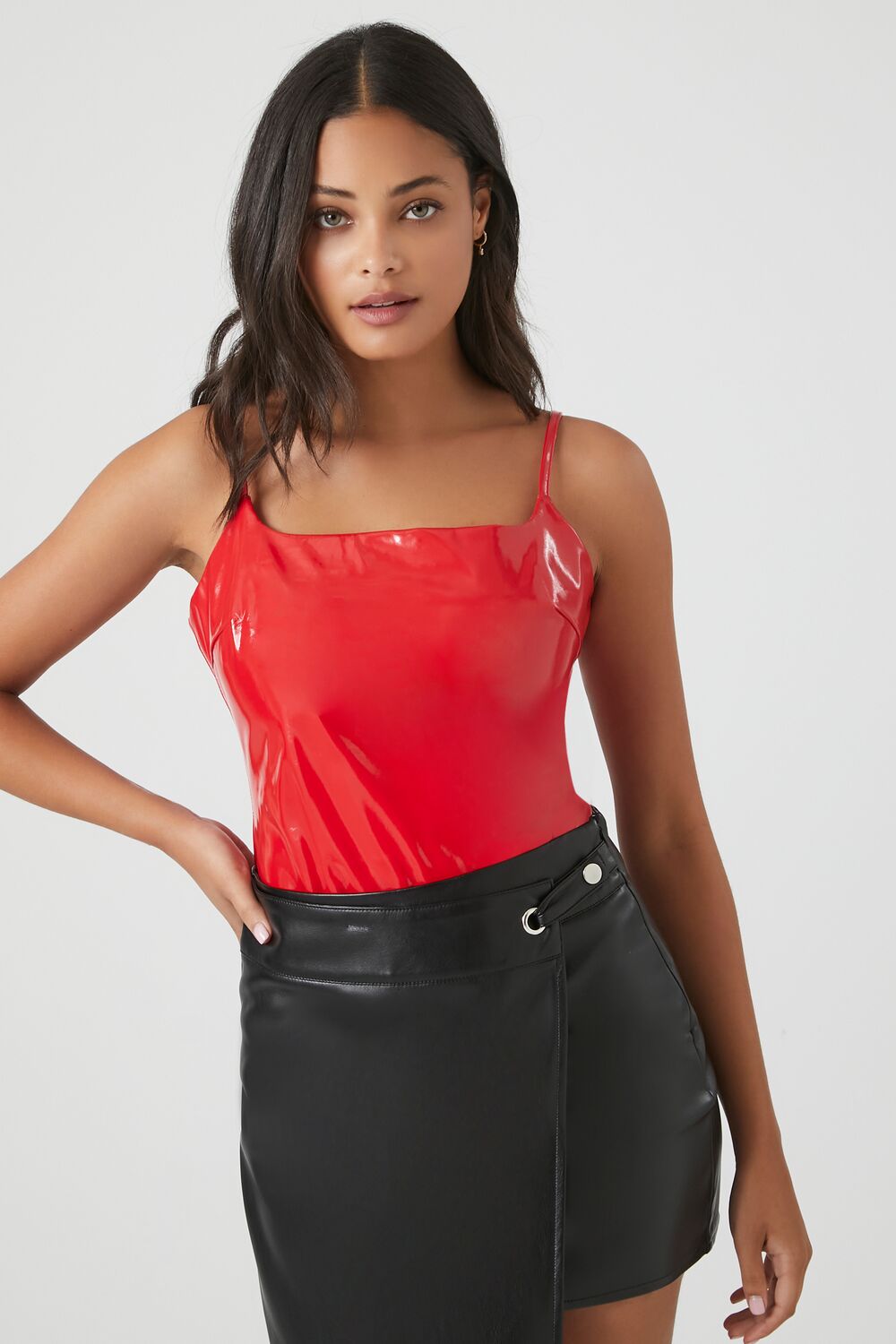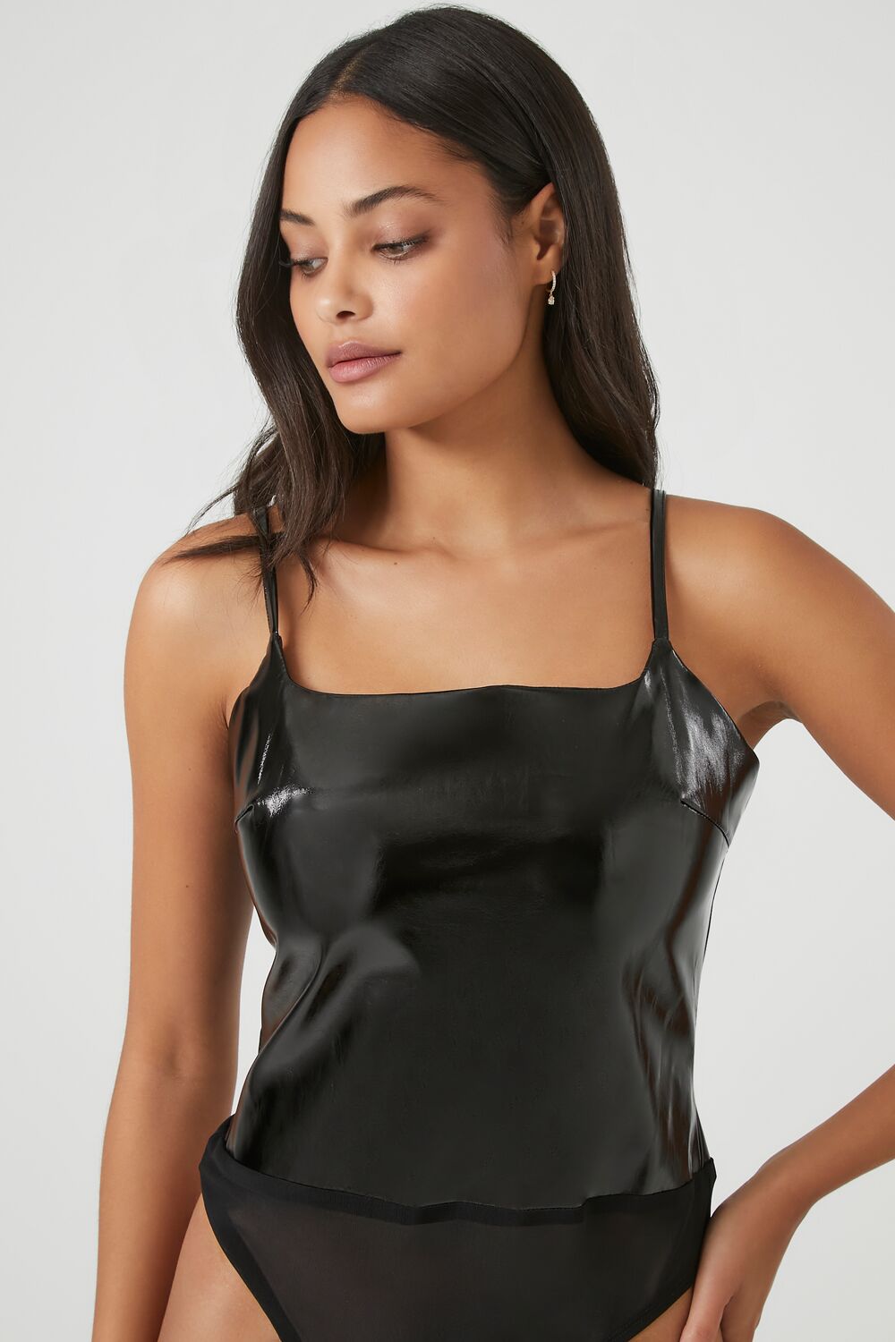 A faux patent leather bodysuit featuring a straight-cut neckline and back and adjustable cami straps.