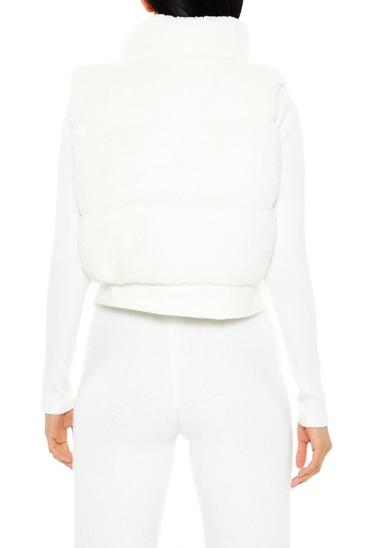 A faux shearling vest featuring a funnel neck. quilted puffer design. zip-up closure. and a semi-cropped hem.