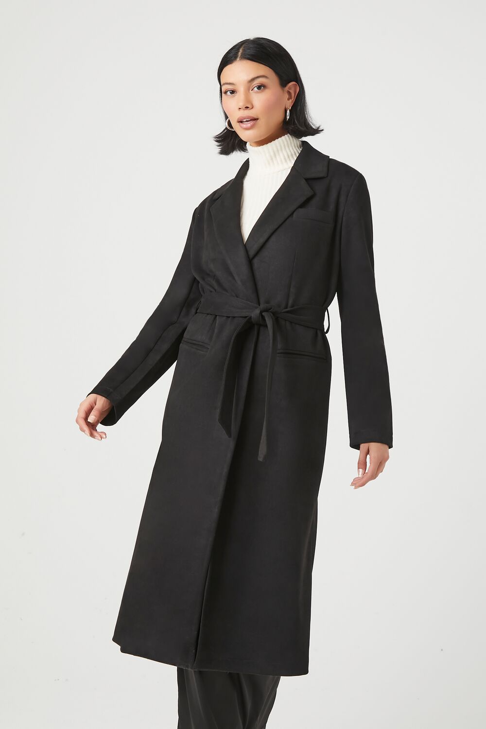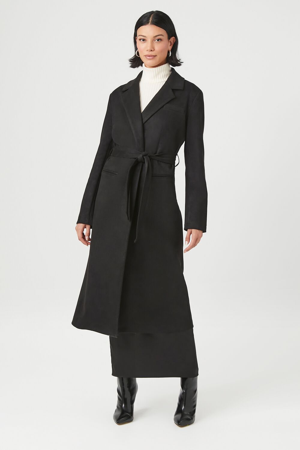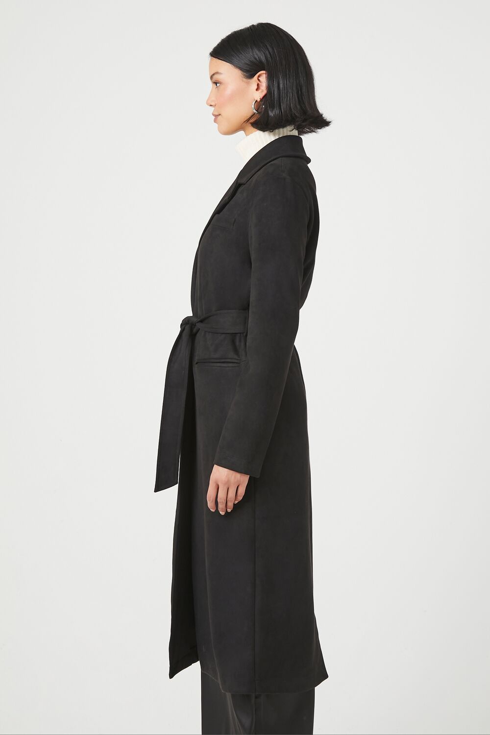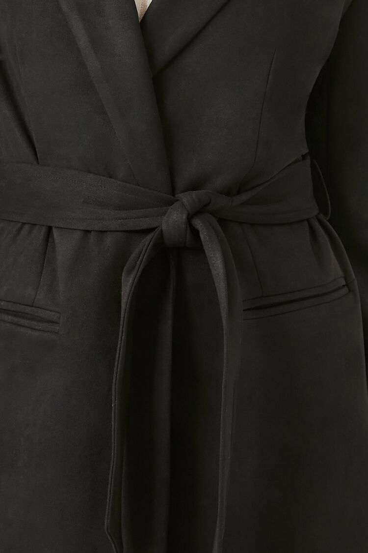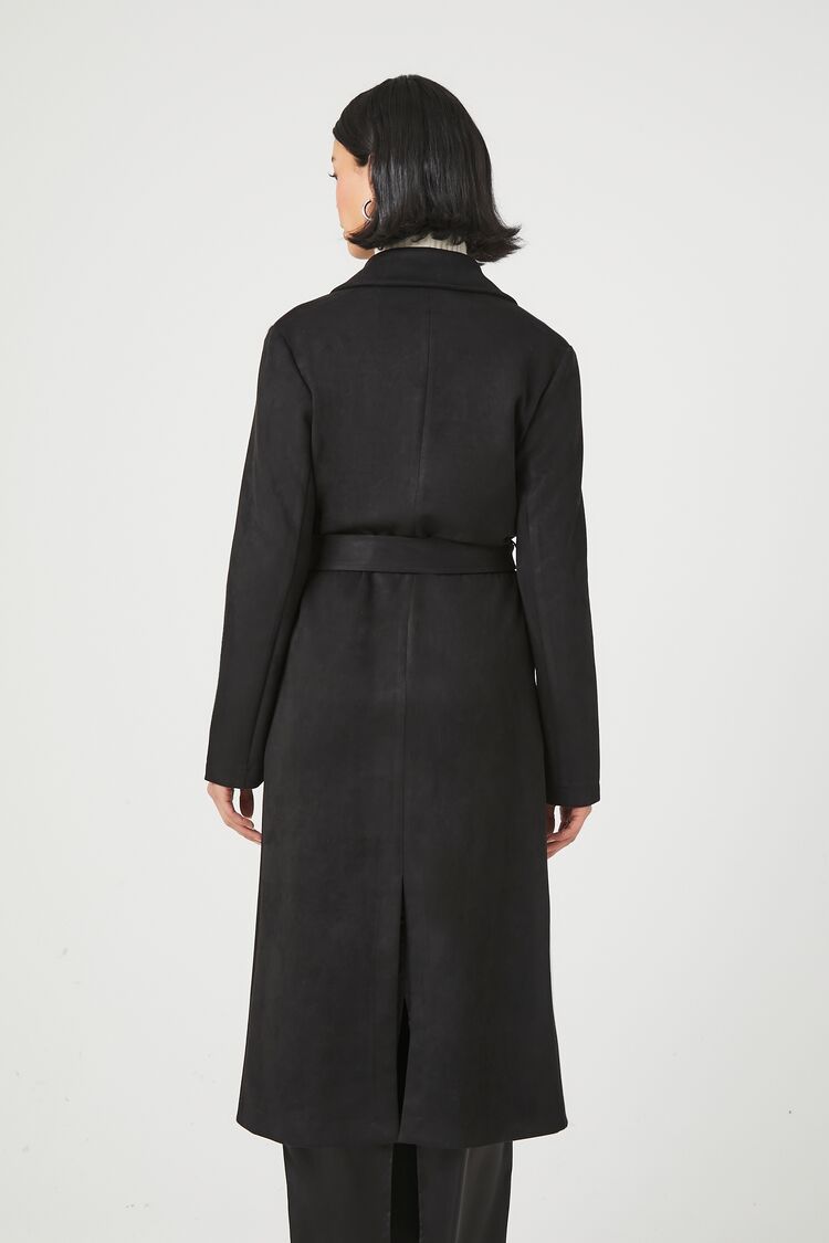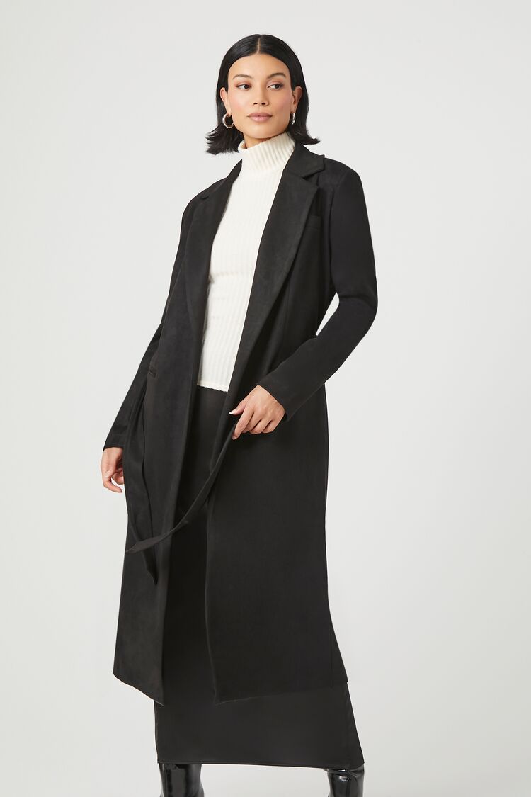 A faux suede coat featuring notched lapels. belt loops with removable self-tie sash. front welt pockets. long sleeves. back slit. and a longline hem.