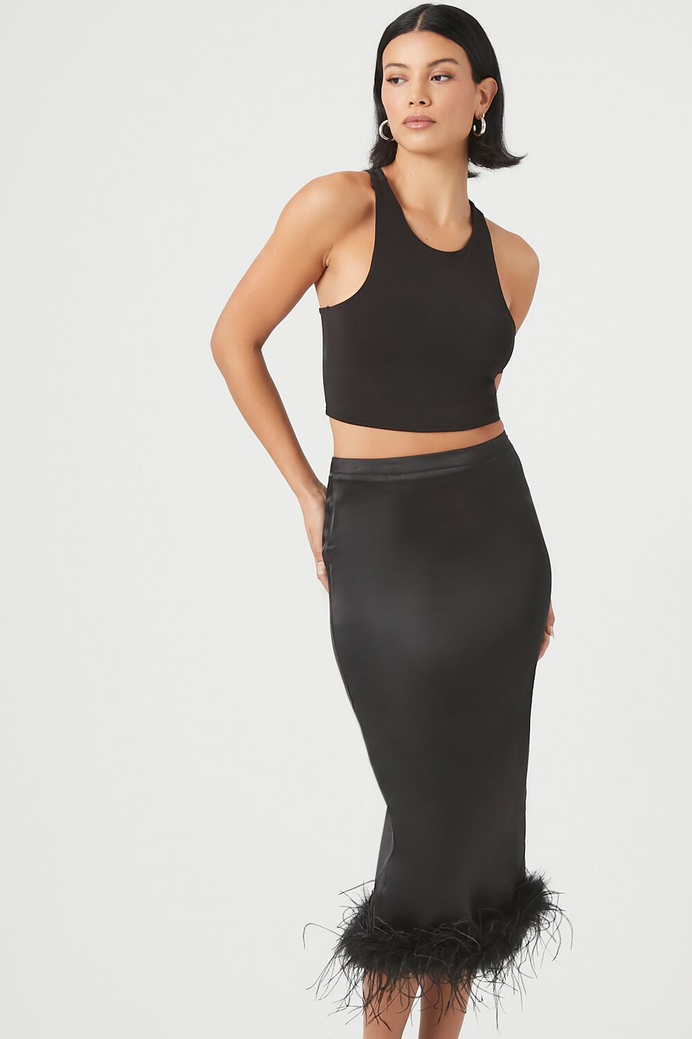A woven maxi skirt featuring a high-rise waist. feather trim. concealed side zipper. back slit. and straight silhouette.