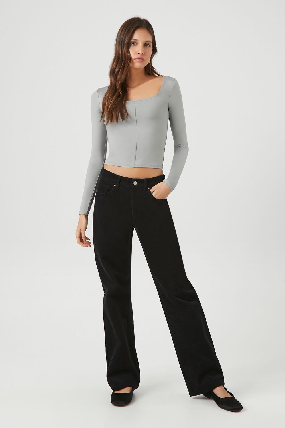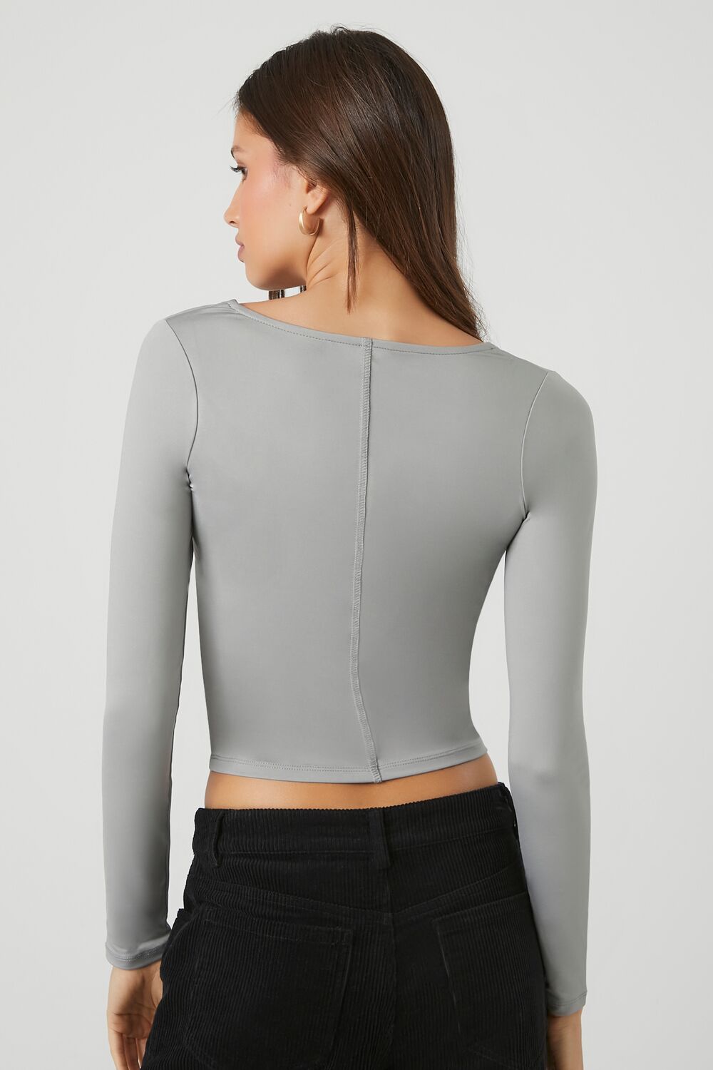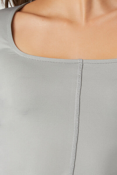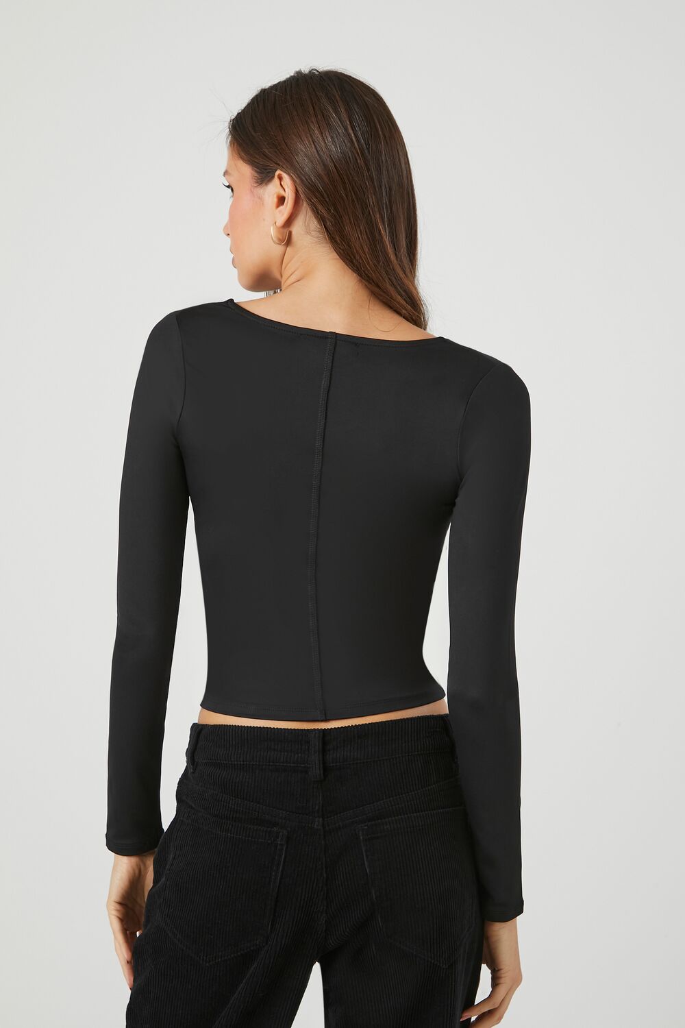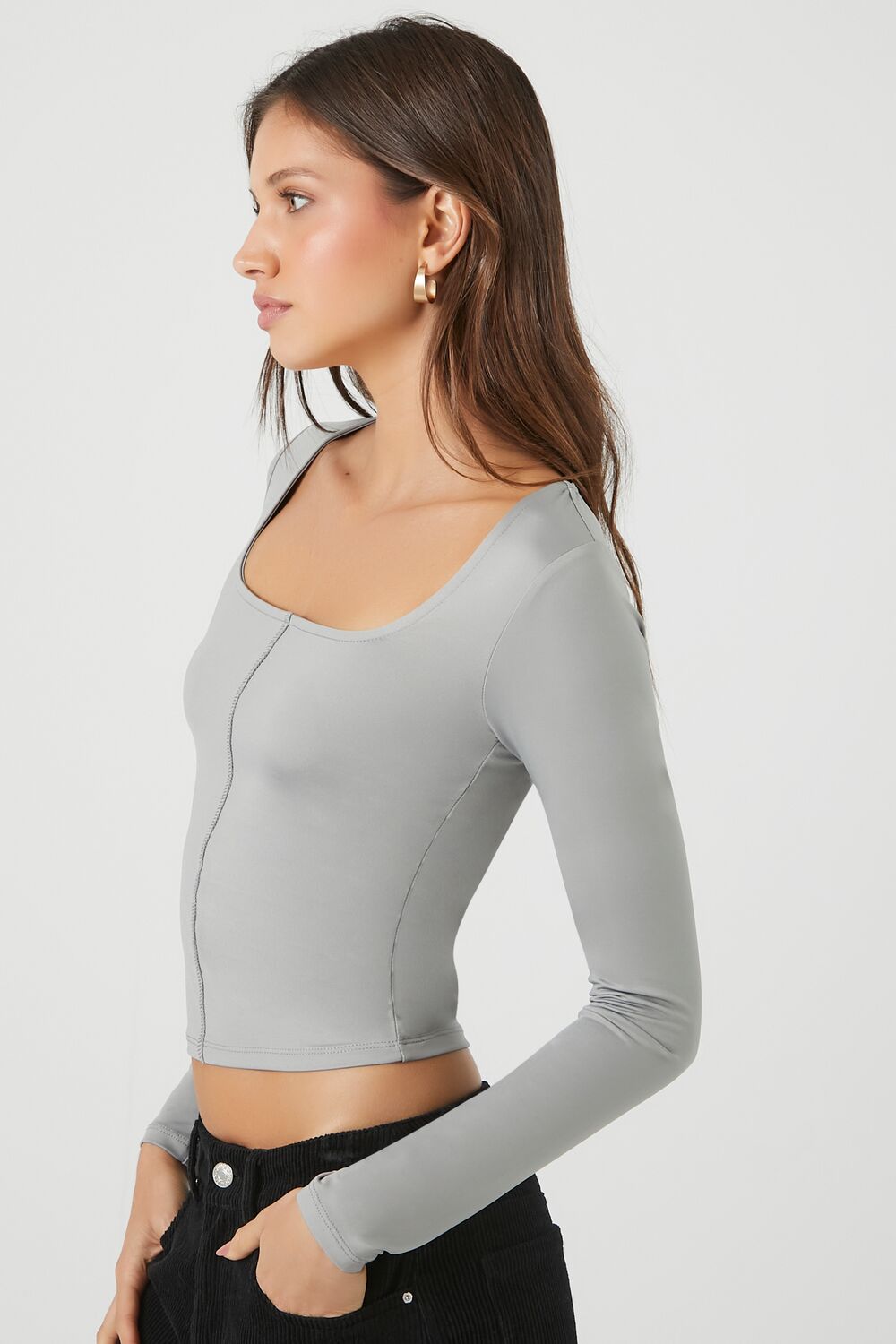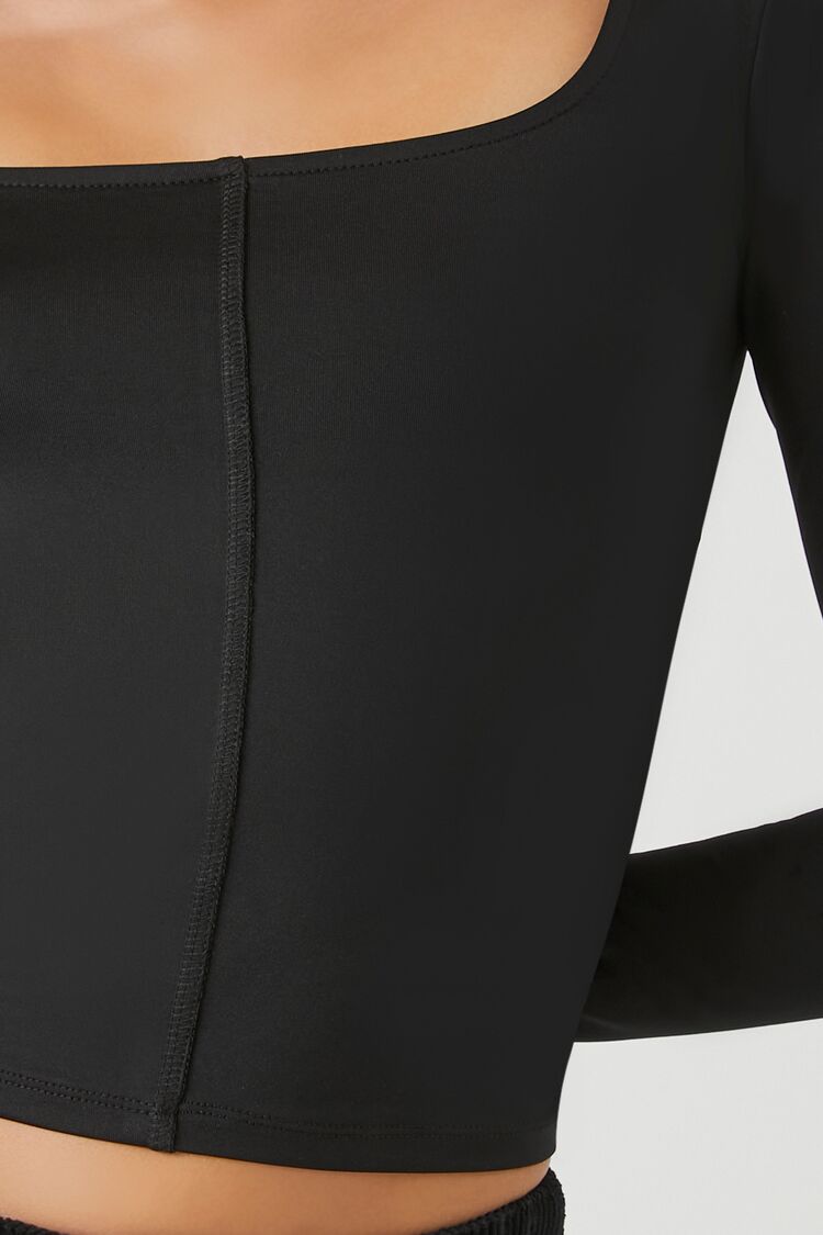 A knit crop top featuring a square-cut neckline. long sleeves. inverse seams. and a fitted silhouette.