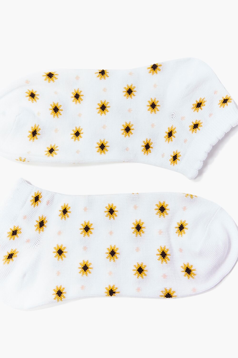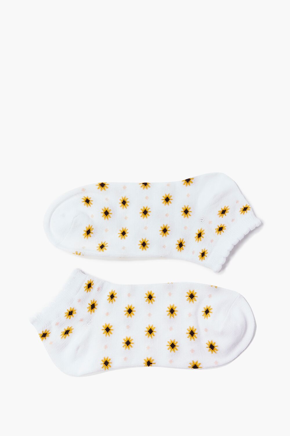 A pair of knit ankle socks featuring an allover floral and polka dot print with scalloped trim.