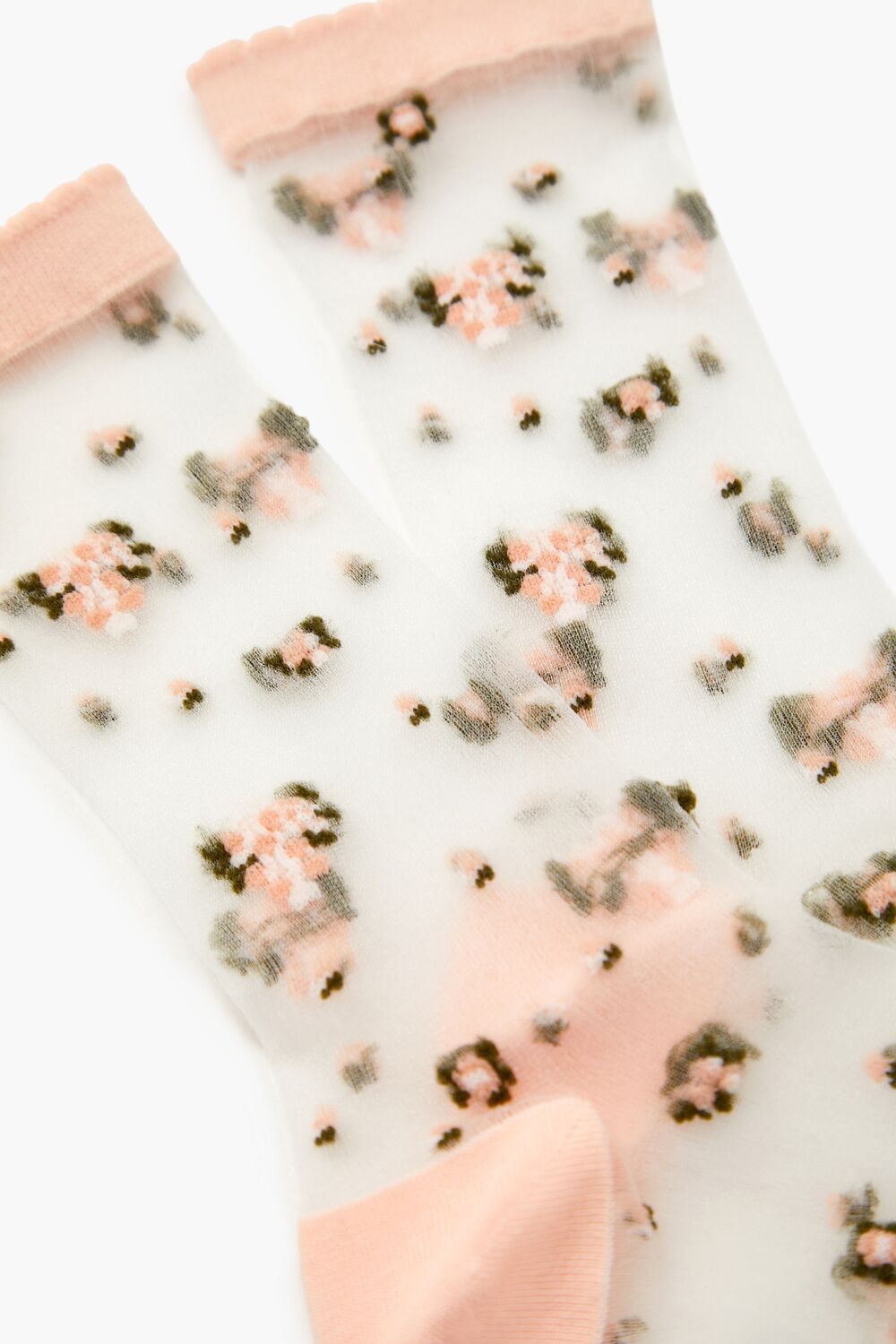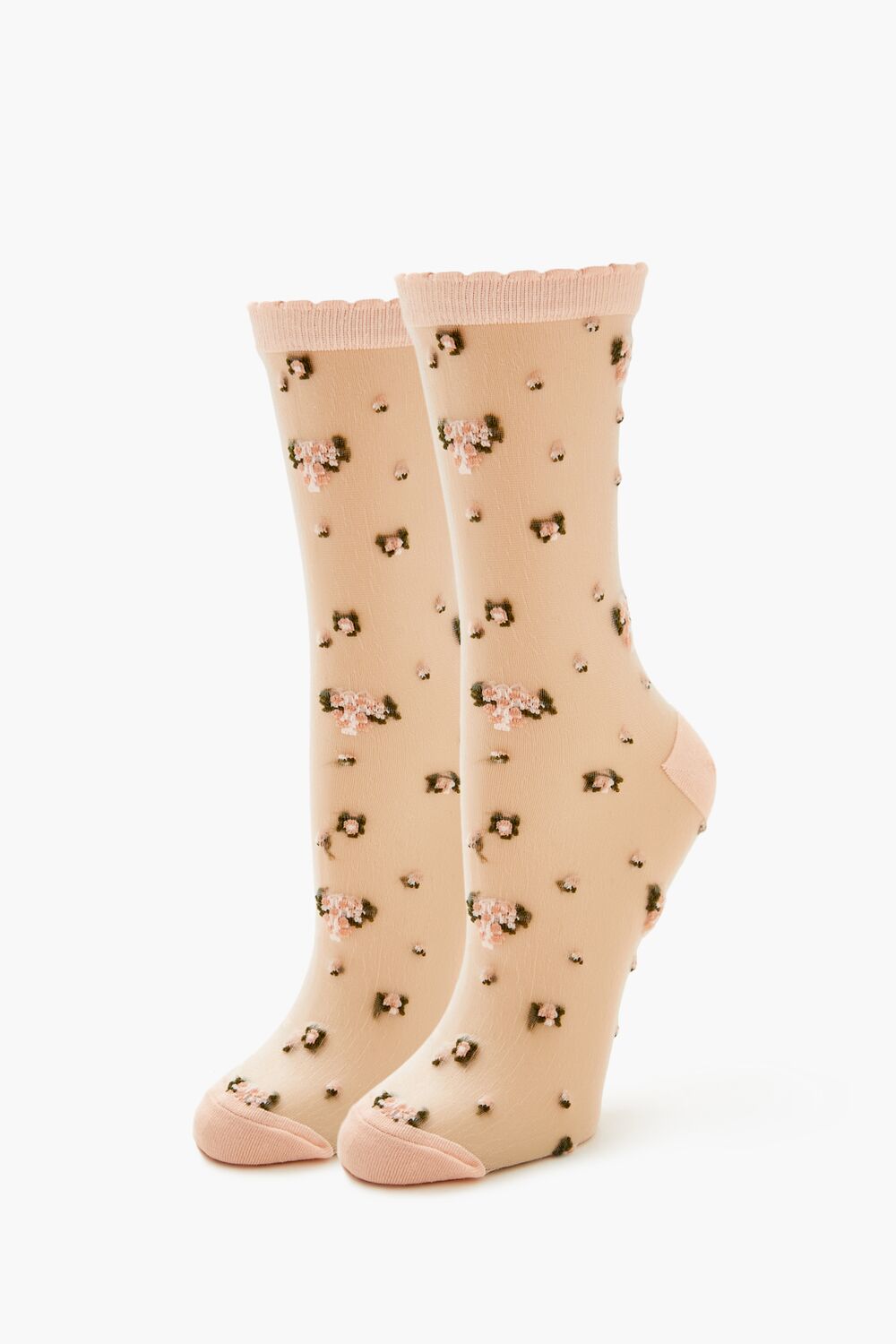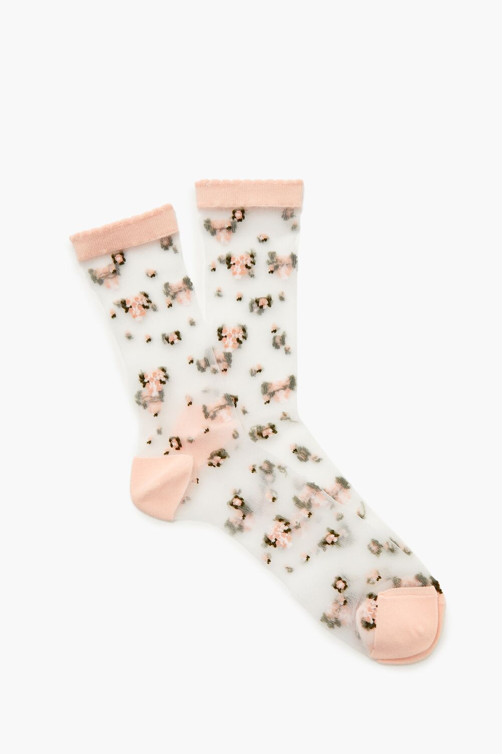 A sheer mesh crew socks featuring an allover flower pattern and contrasting and scalloped trim.