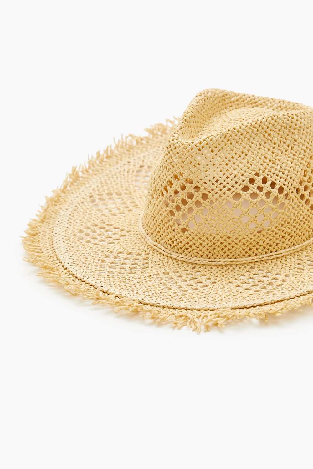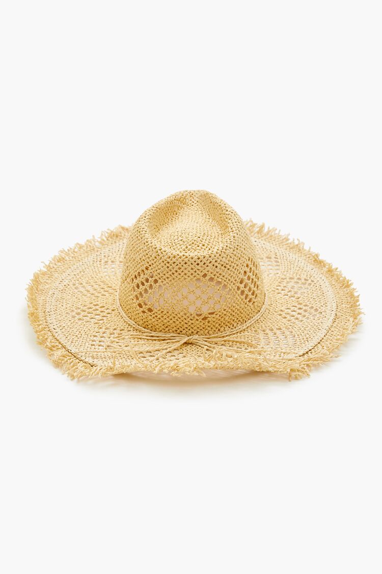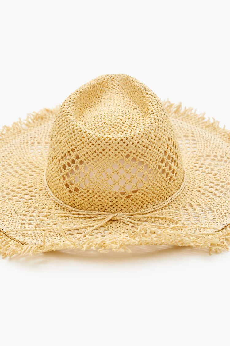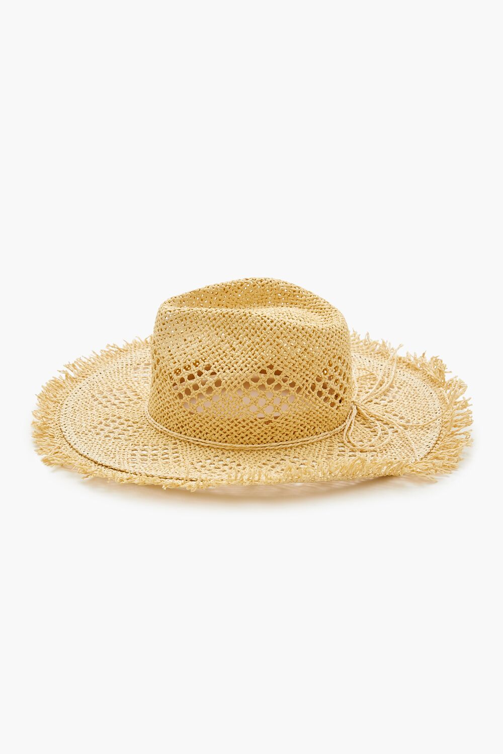 A straw fedora featuring a pinched crown. wide brim. cutouts. trim with bow embellishment. and frayed design.