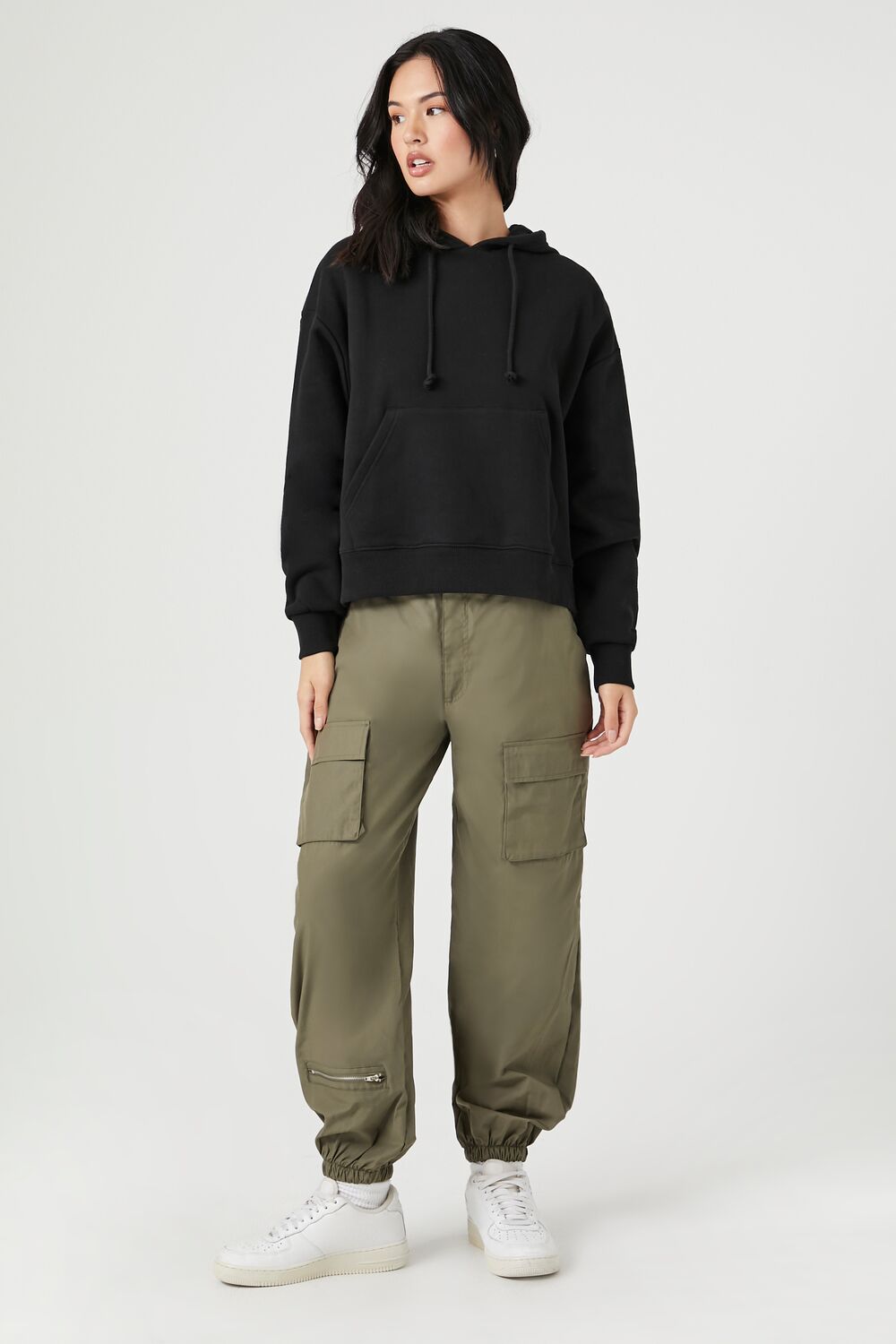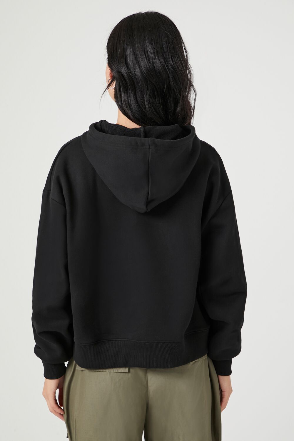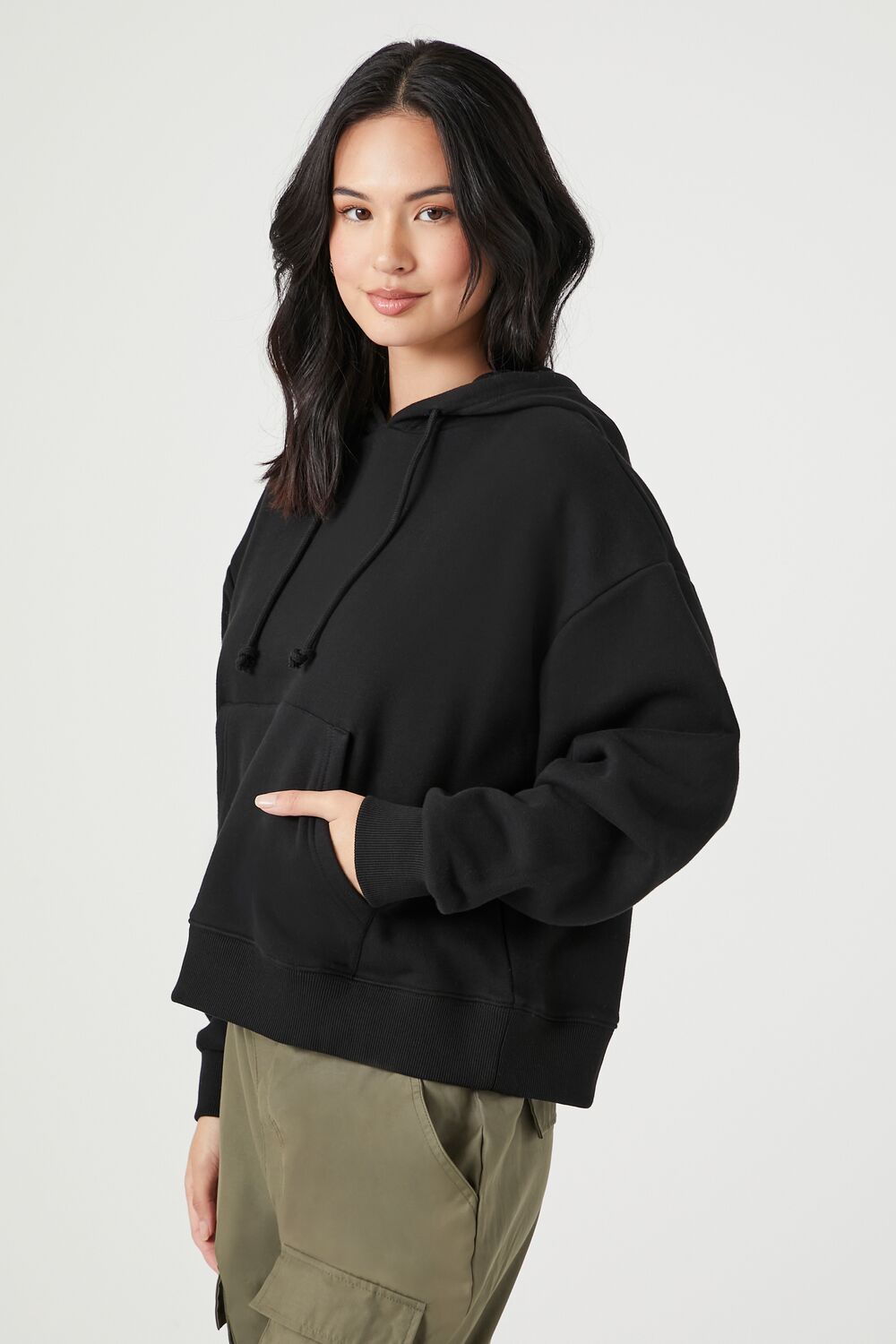 A French terry hoodie featuring a drawstring hood. front kangaroo pocket. dropped long sleeves. and ribbed trim.