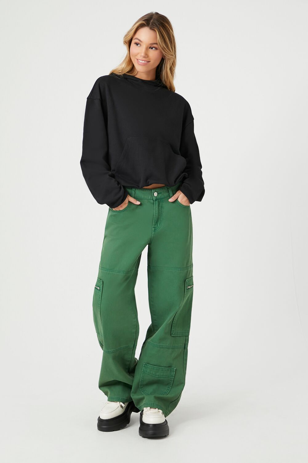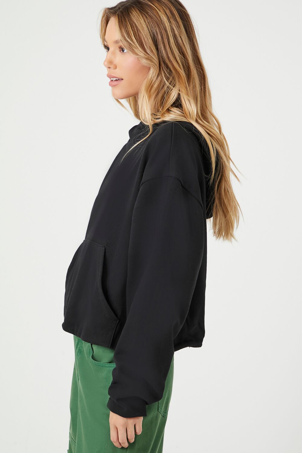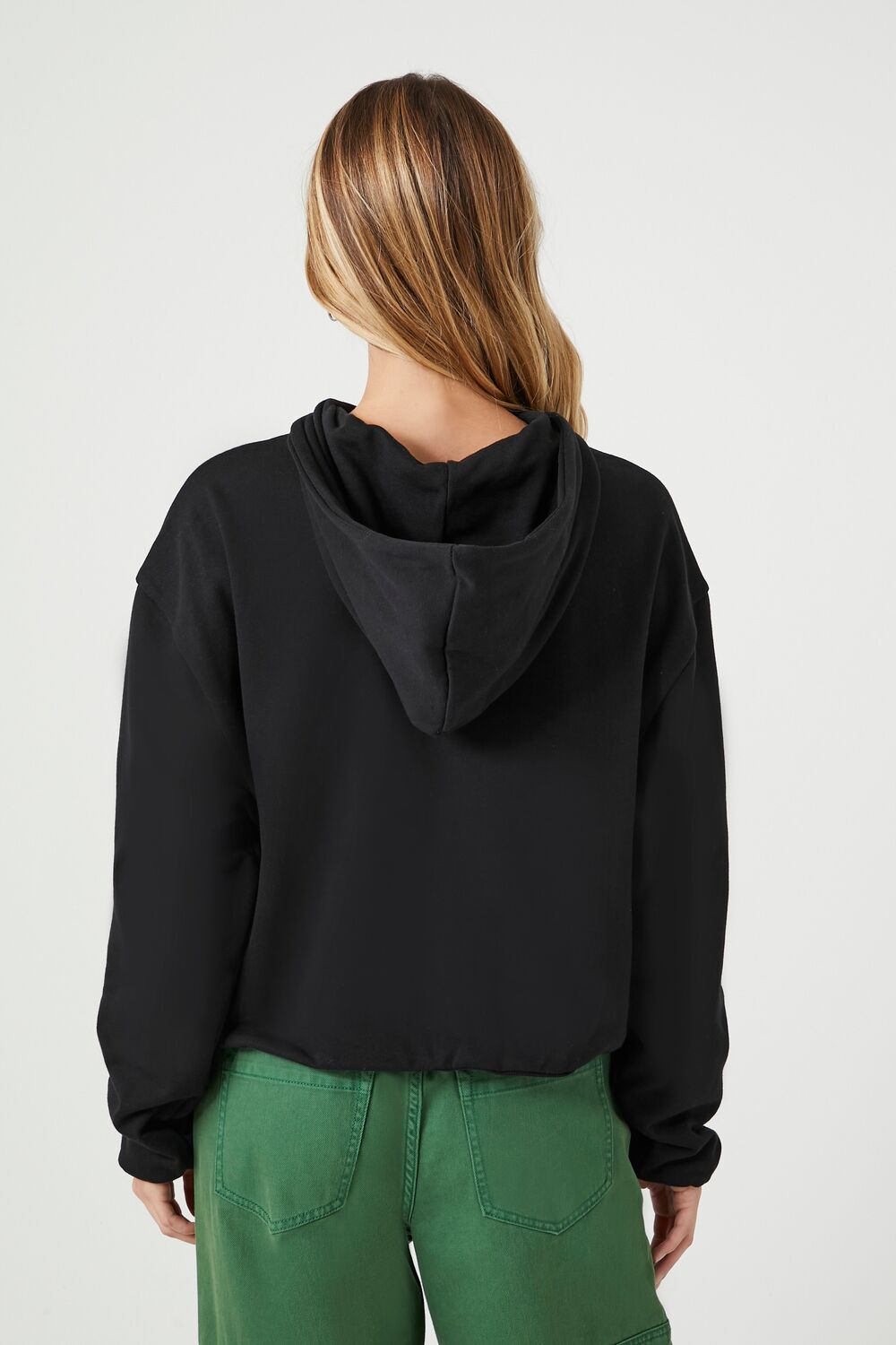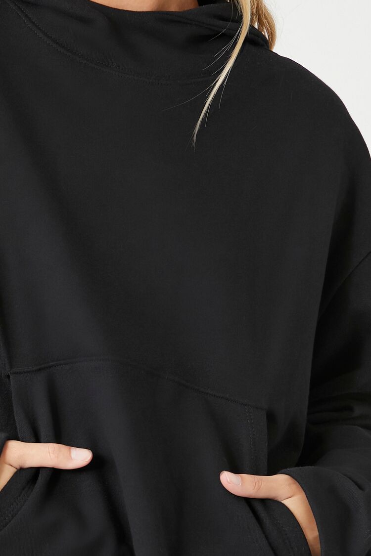 A French terry hoodie featuring dropped shoulders. long sleeves. a front kangaroo pocket. ribbed trim. and a boxy silhouette.