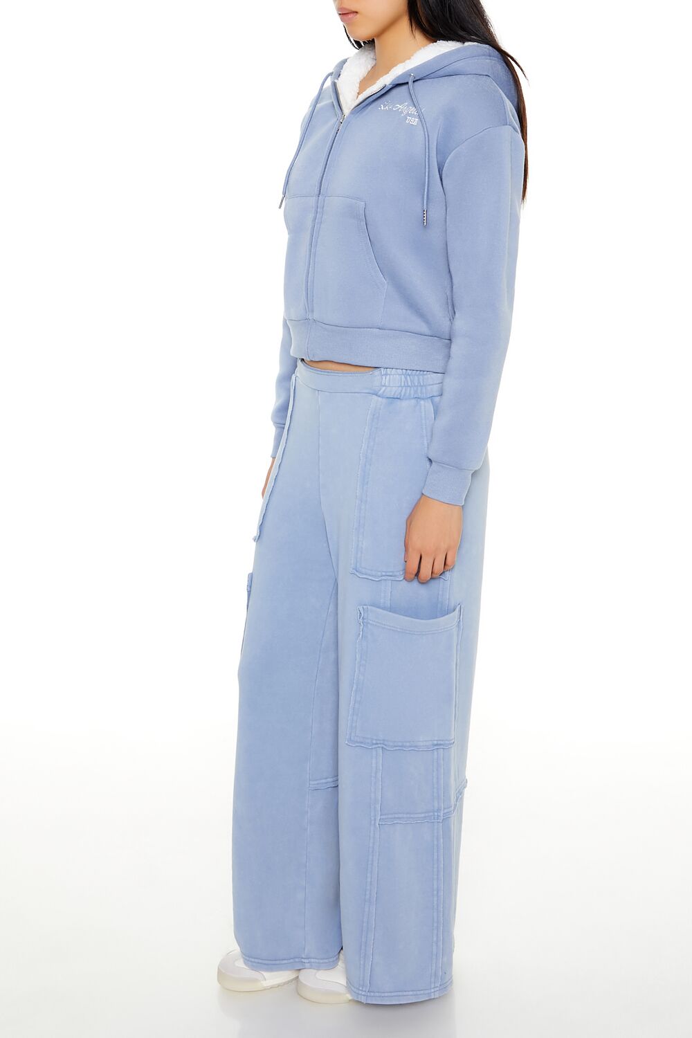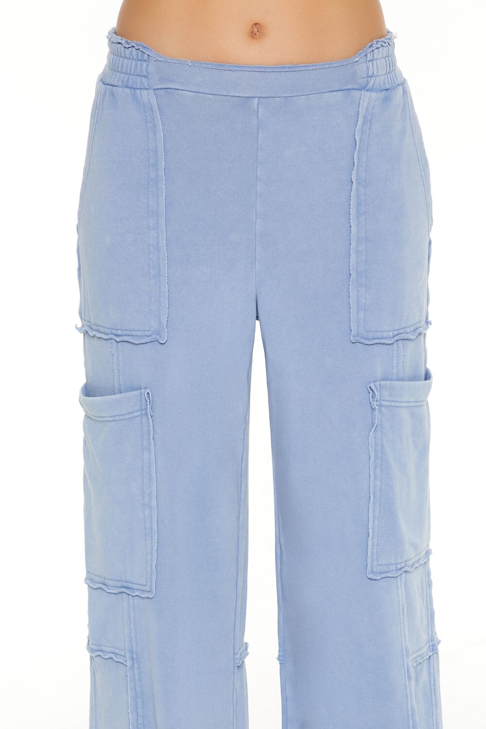 A pair of French terry pants featuring a low-rise waist. slant front pockets. patch leg pockets. and a wide leg.