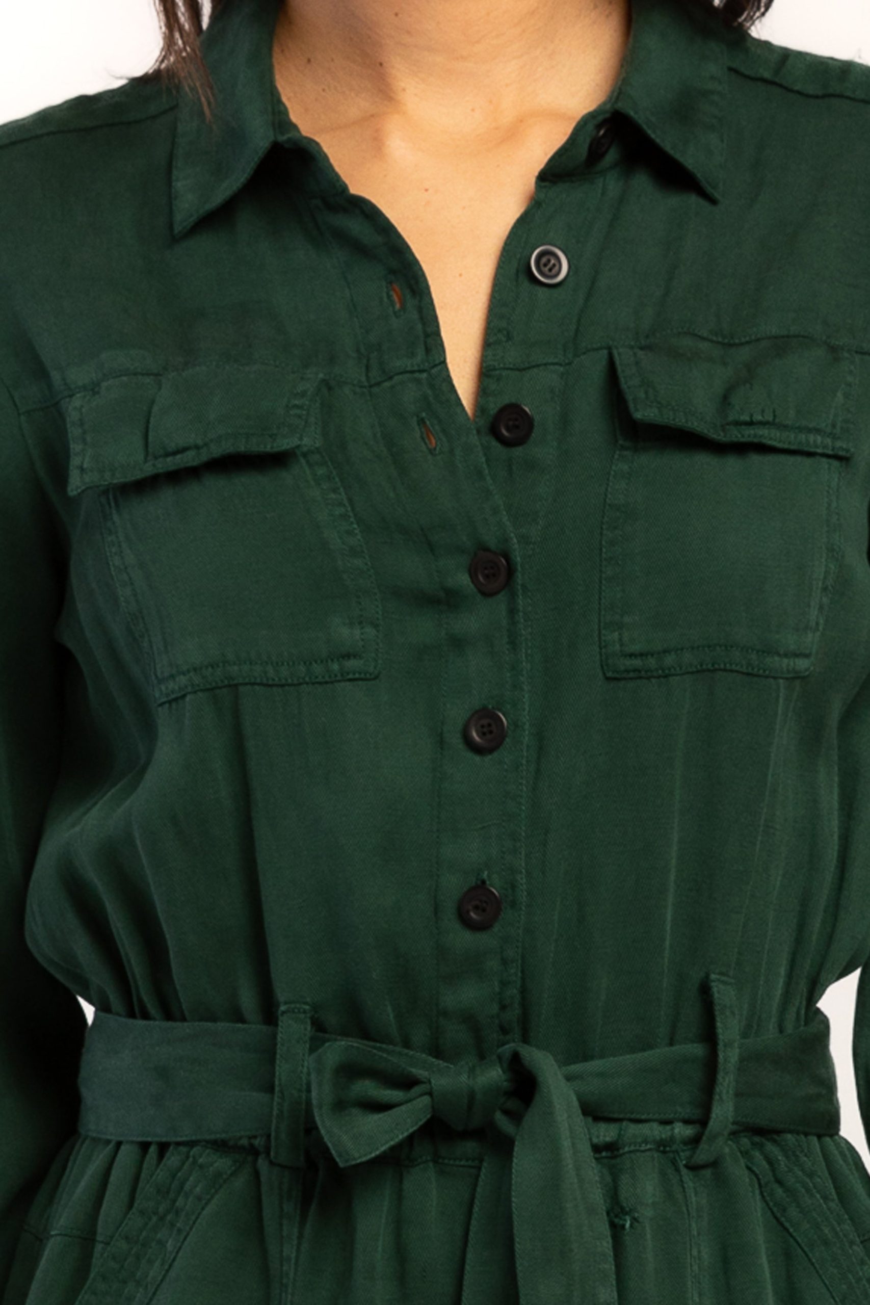 The Frenzia Long Sleeve Utility Style Jumpsuit is a fashionable and practical choice for any occasion. Its button-down front and tab cuff hem add a touch of sophistication to its utility-inspired design. The jumpsuit comes with a self belt. allowing you to cinch it at the waist for a flattering silhouette. With long sleeves. it provides coverage and versatility for different weather conditions. Whether you’re dressing it up or down. this jumpsuit offers a stylish and comfortable option for effortless style.