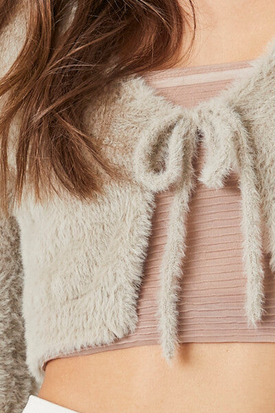 A fuzzy knit cardigan sweater featuring a self-tie front closure. cropped hem. a V-neckline. and long sleeves.