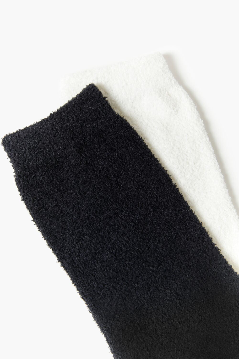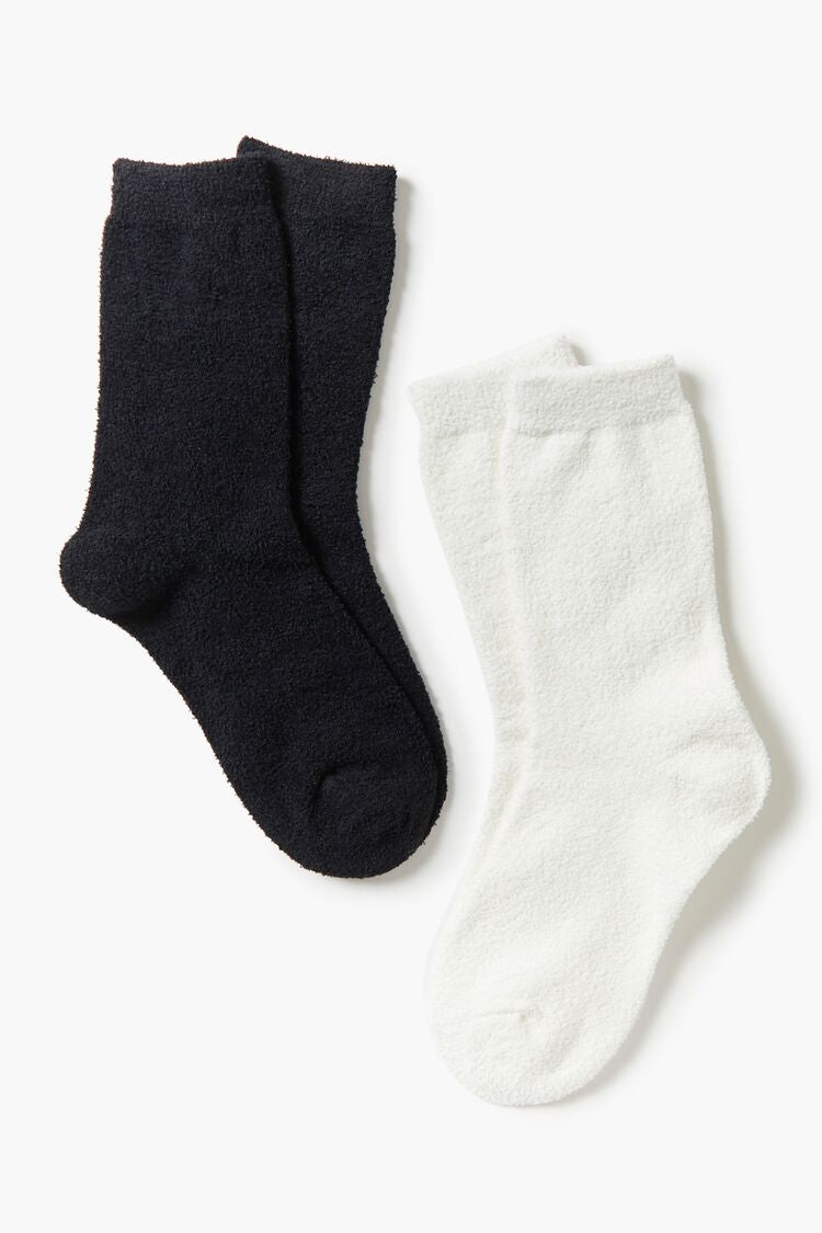 A set of fuzzy knit crew socks featuring elasticized trim.