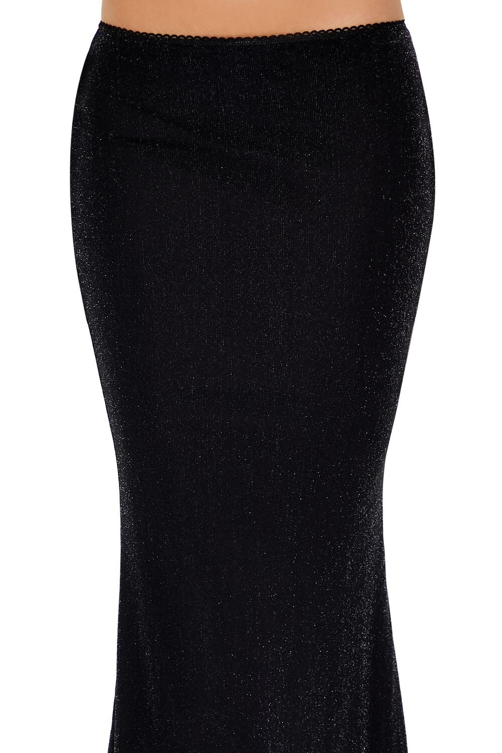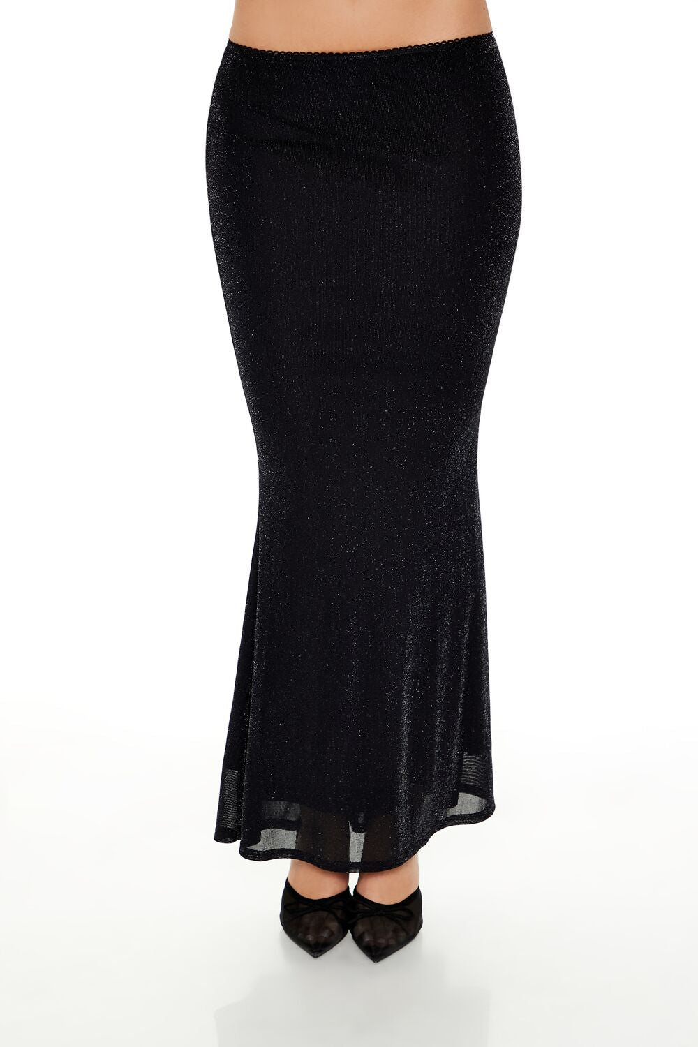 A glitter knit maxi skirt featuring picot trim. an elasticized waist. and mermaid silhouette.