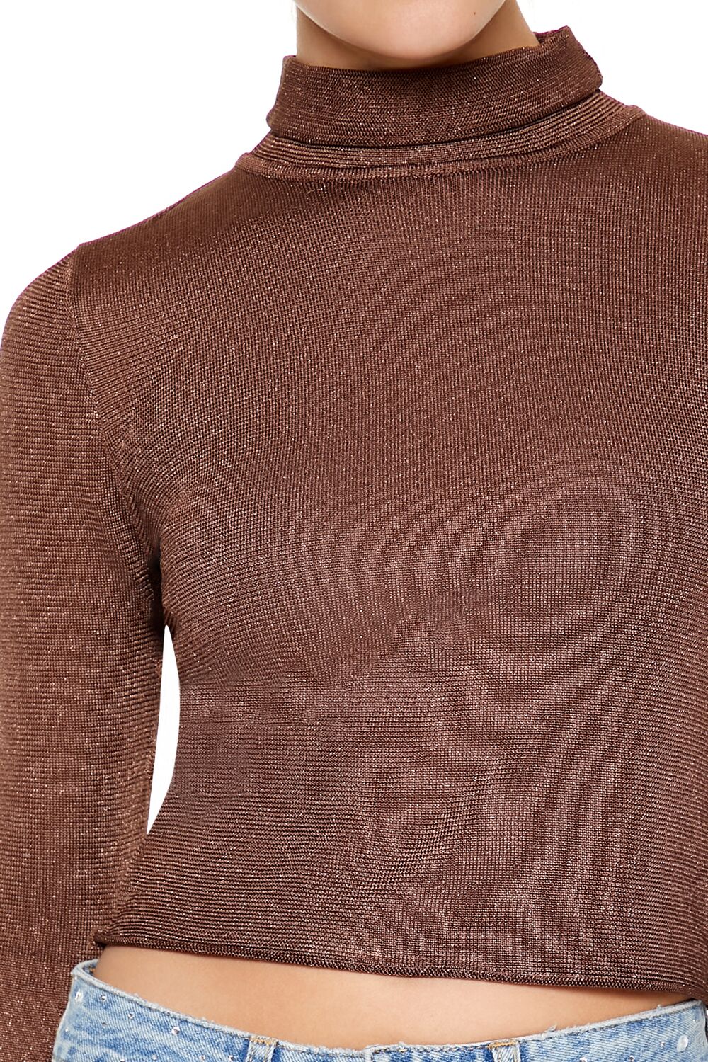 A glitter knit crop top featuring a turtleneck. long sleeves. and a rolled cropped hem.