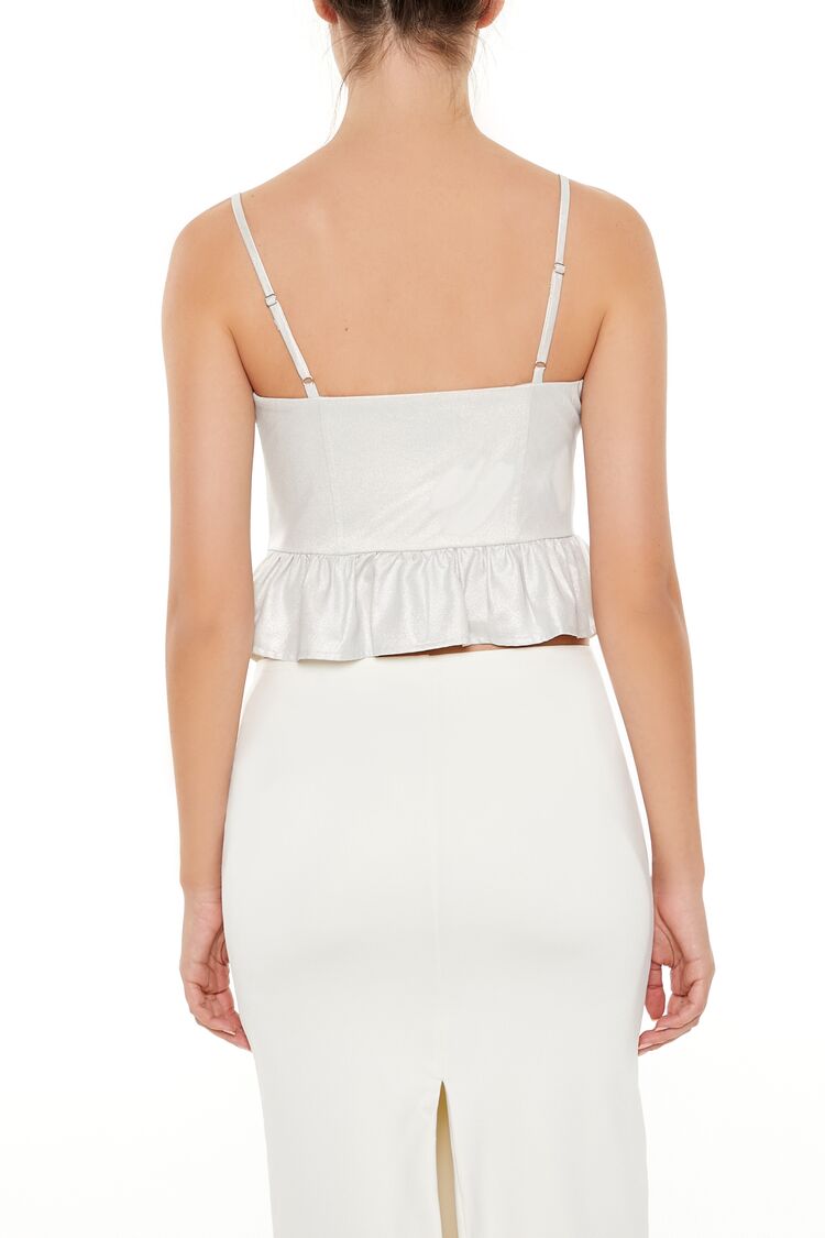 A satin cami featuring a bustier-inspired design. glitter finish. sweetheart neckline. ruched bust. adjustable cami straps. straight-cut back. concealed zipper side closure. and cropped flounce V-hem.