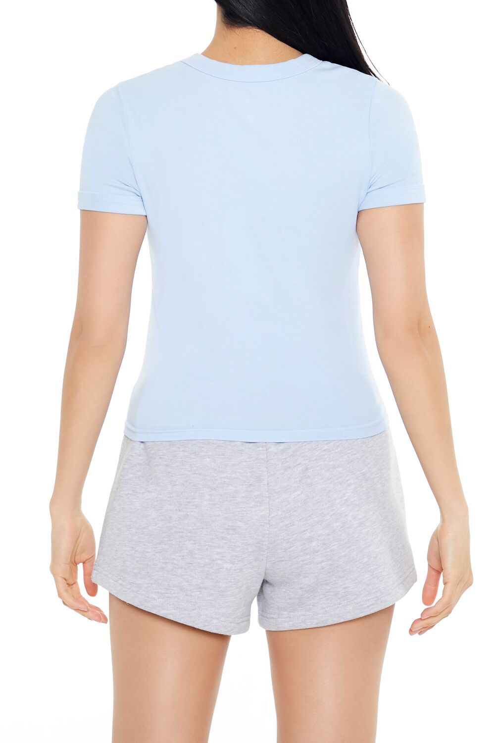 A knit baby tee featuring front ‘Gumby’ and ‘Surf’s Up!’ text. accompanying surfing character graphic. short sleeves. a round neckline. and semi-cropped hem.