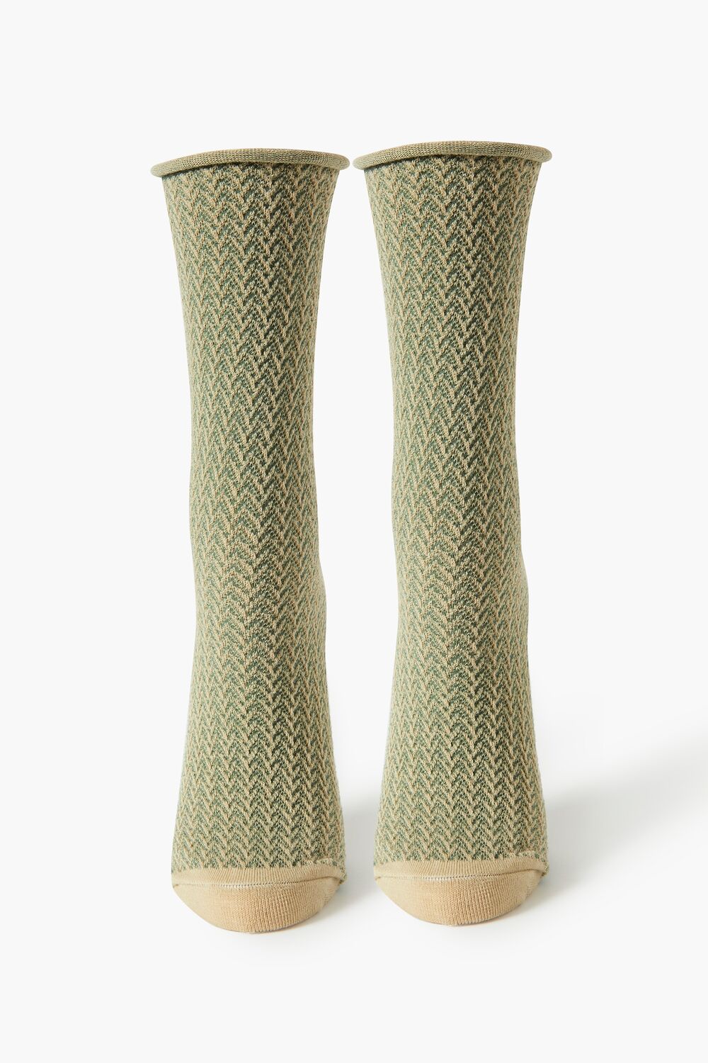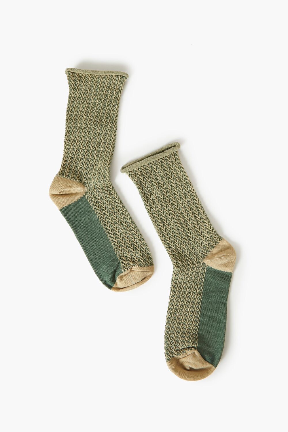 A pair of knit crew socks featuring an allover herringbone pattern. contrasting heel and toe. and rolled trim.