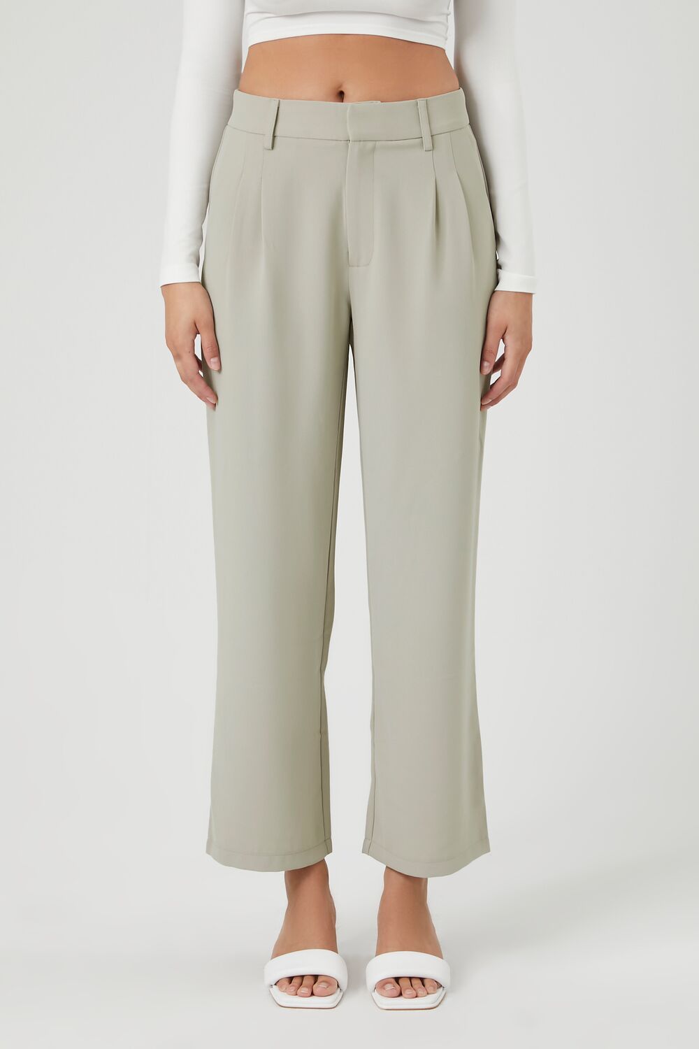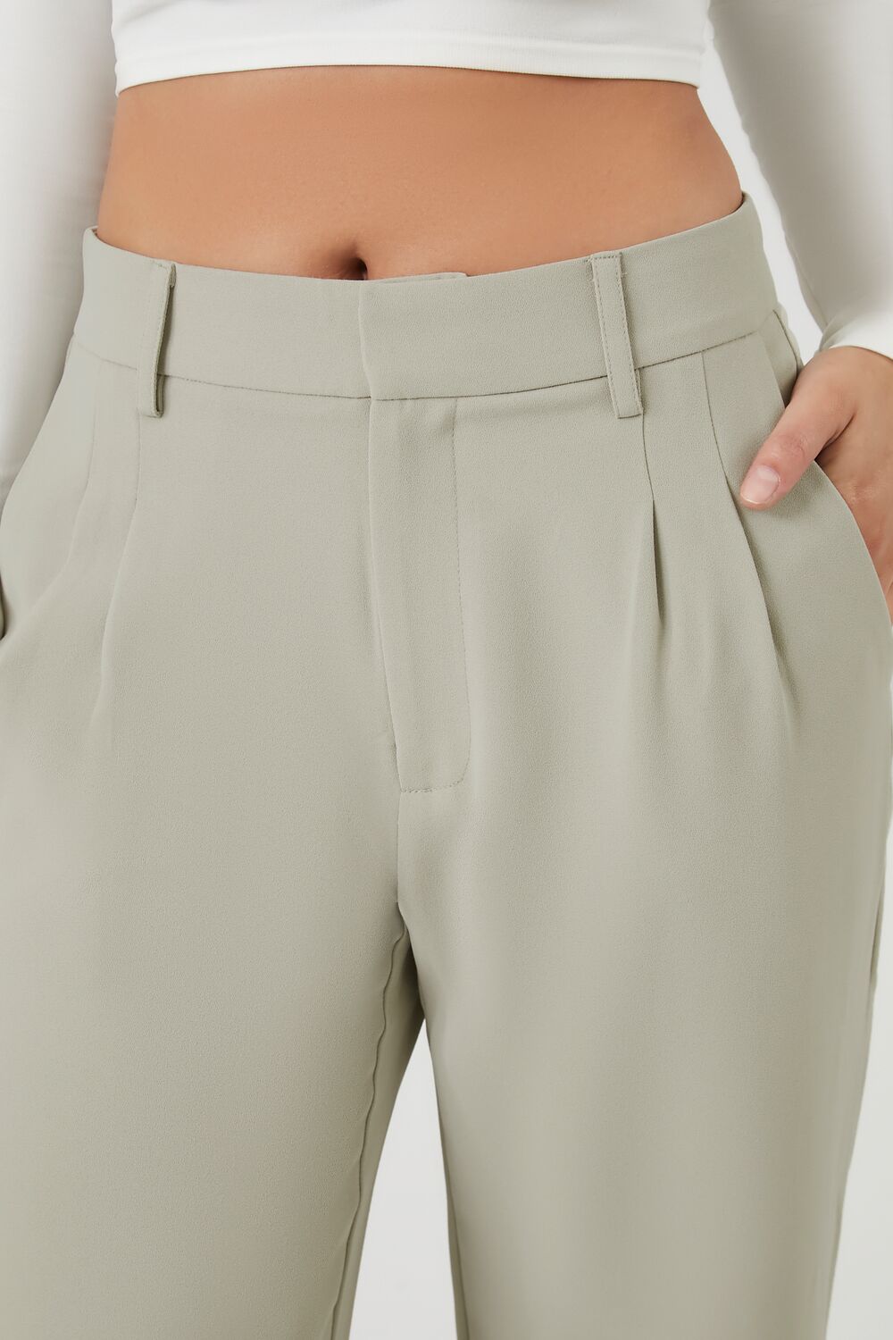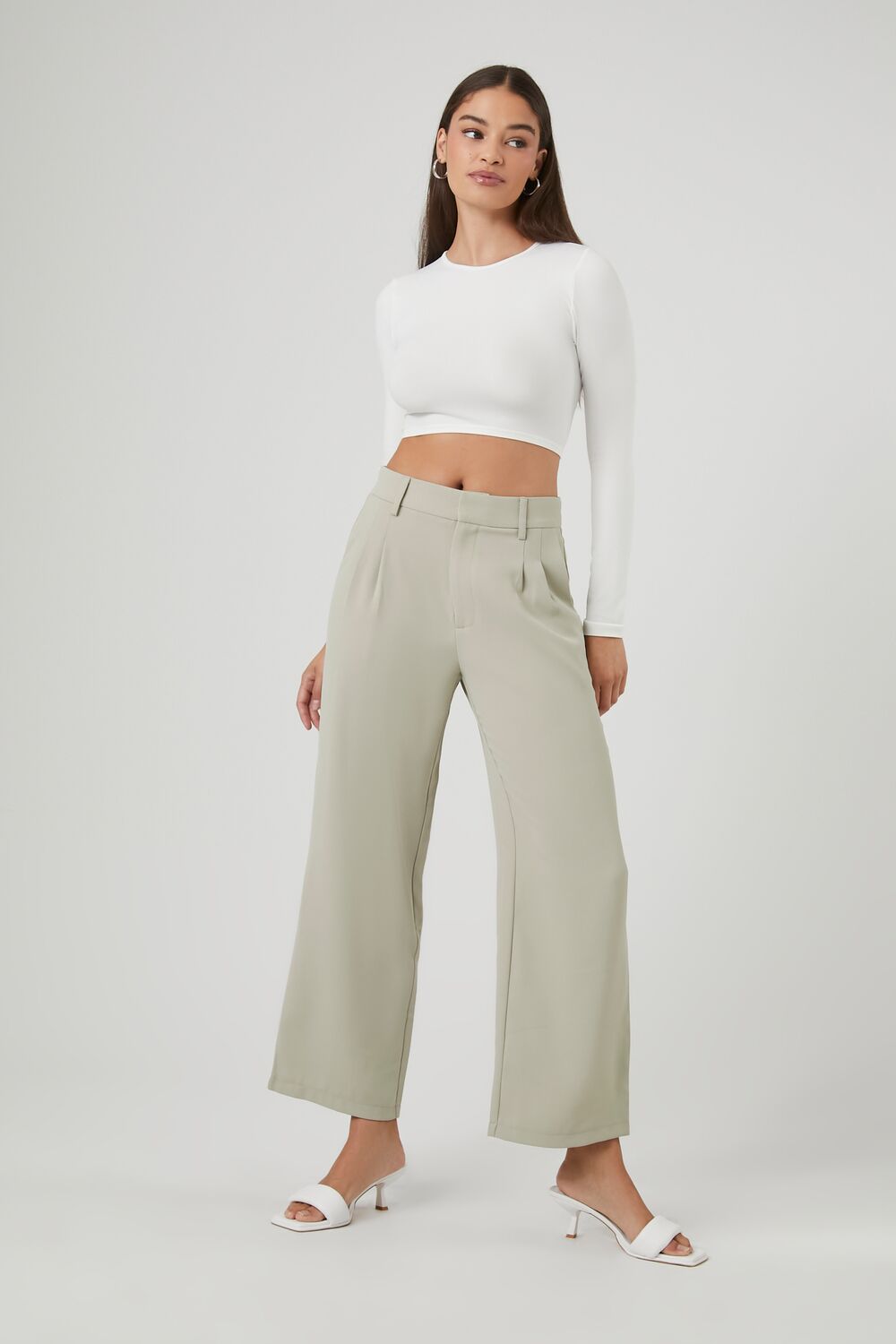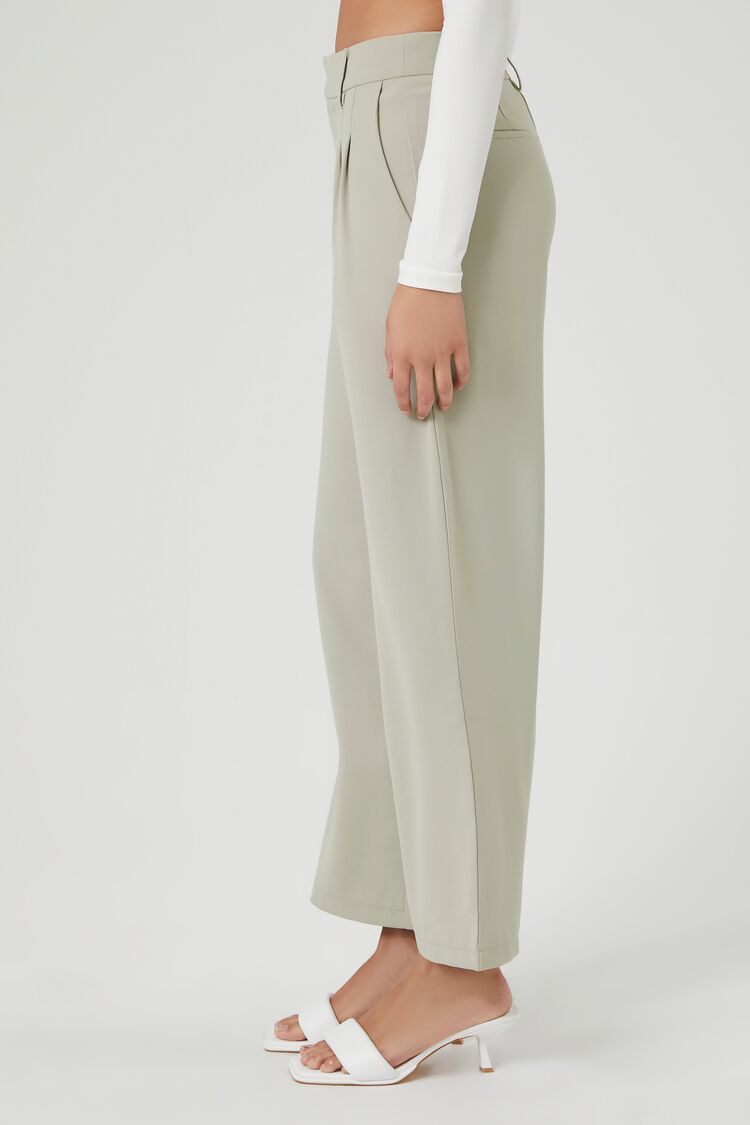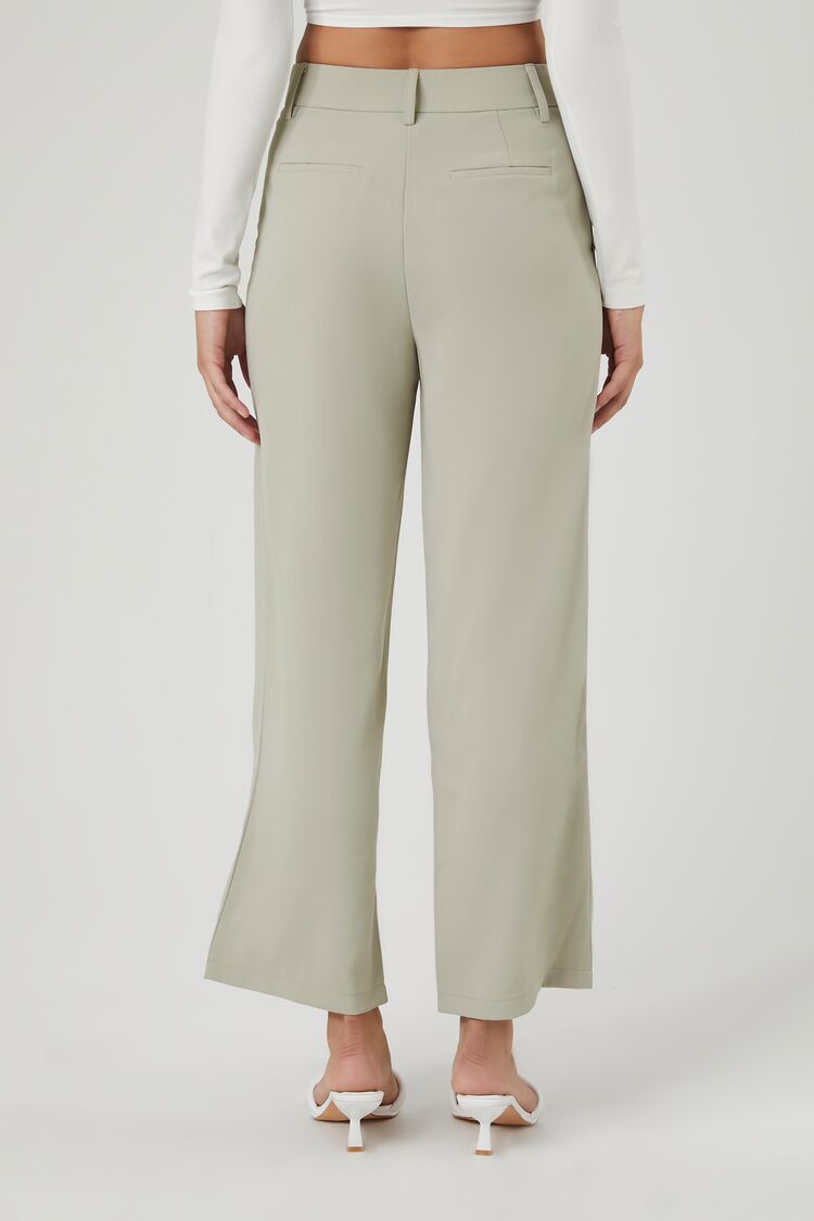 A woven pair of trousers featuring a high-rise waist. ankle length. belt loops. zip fly and hook-and-bar front closure. pleated detailing. back welt pockets. and wide leg.