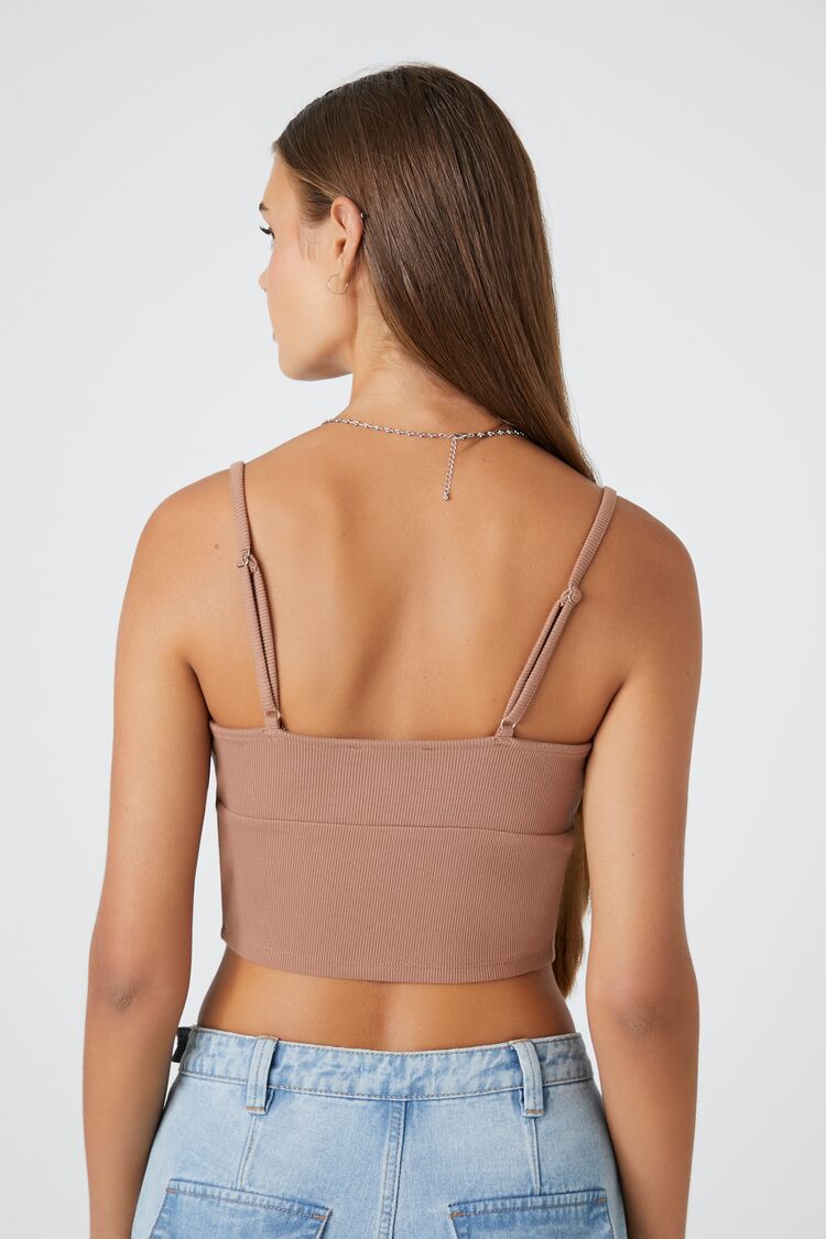A ribbed knit cami featuring a plunging surplice neckline. straight-cut back. adjustable straps with front bow appliques. scalloped lace trim. and cropped hem.