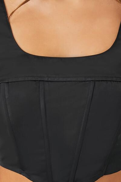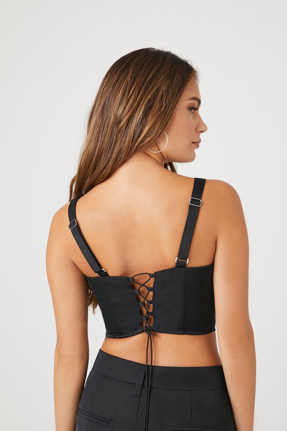 A woven crop top featuring a square neckline. adjustable shoulder straps. corset-inspired design. lace-up back closure. and a curved hem.