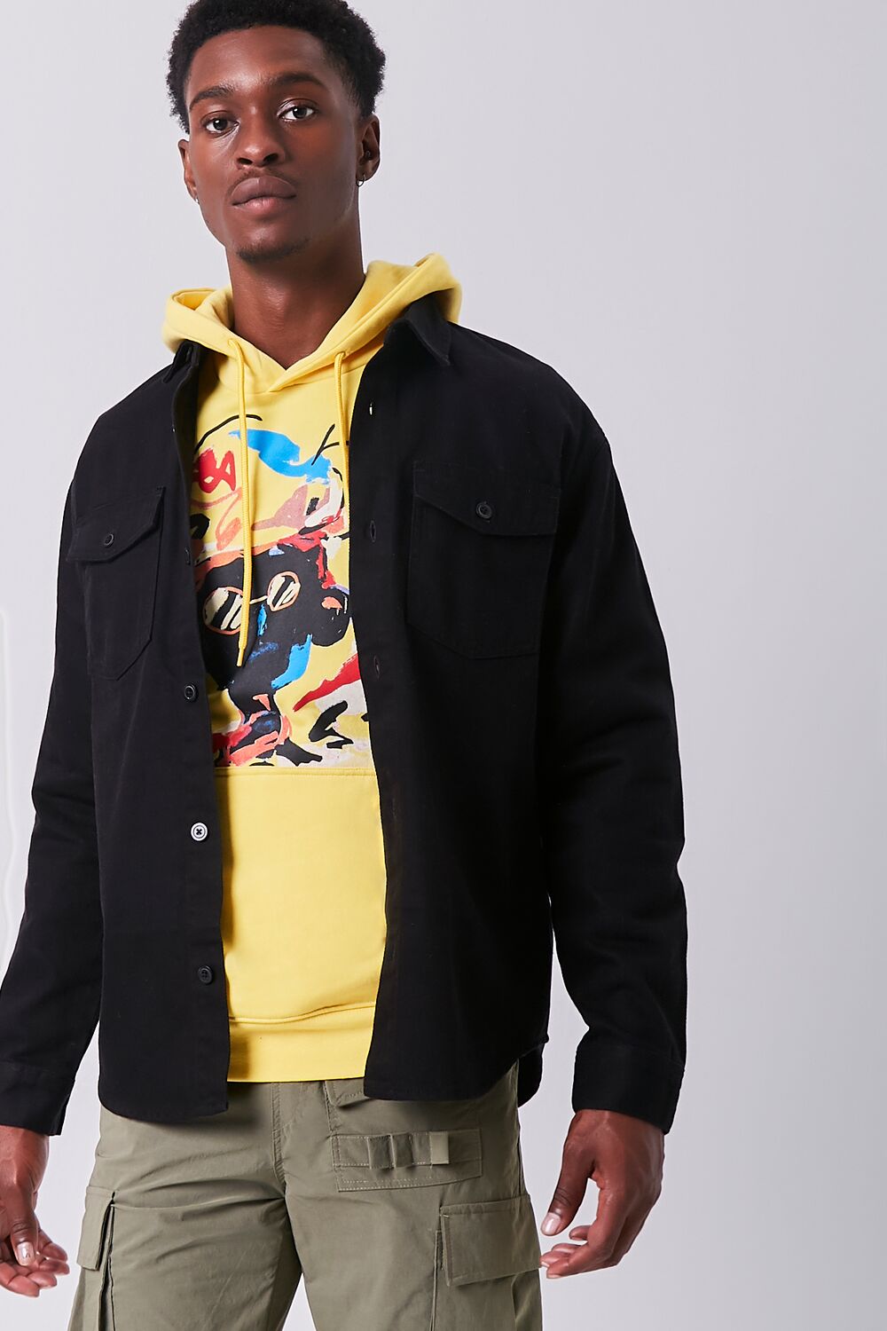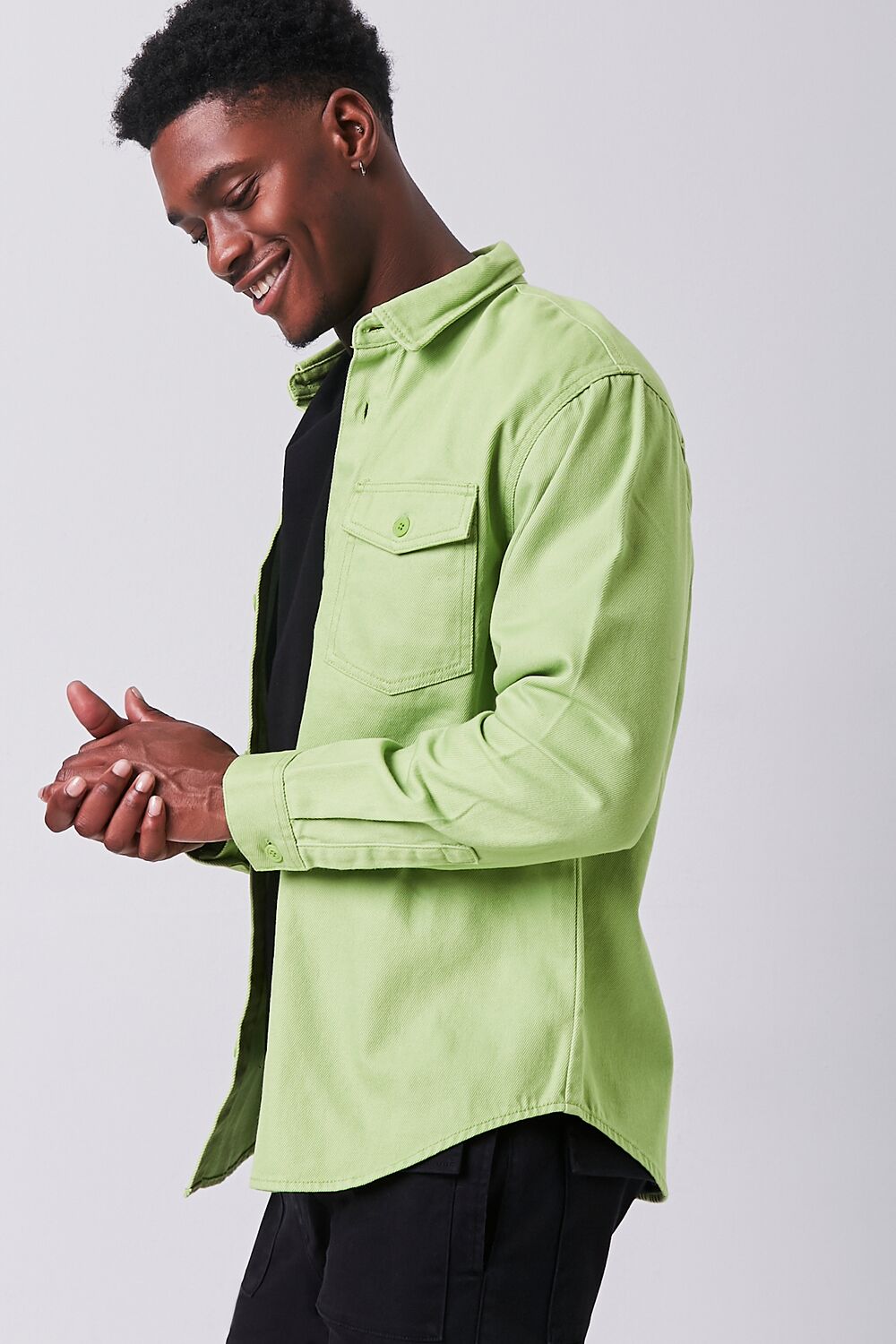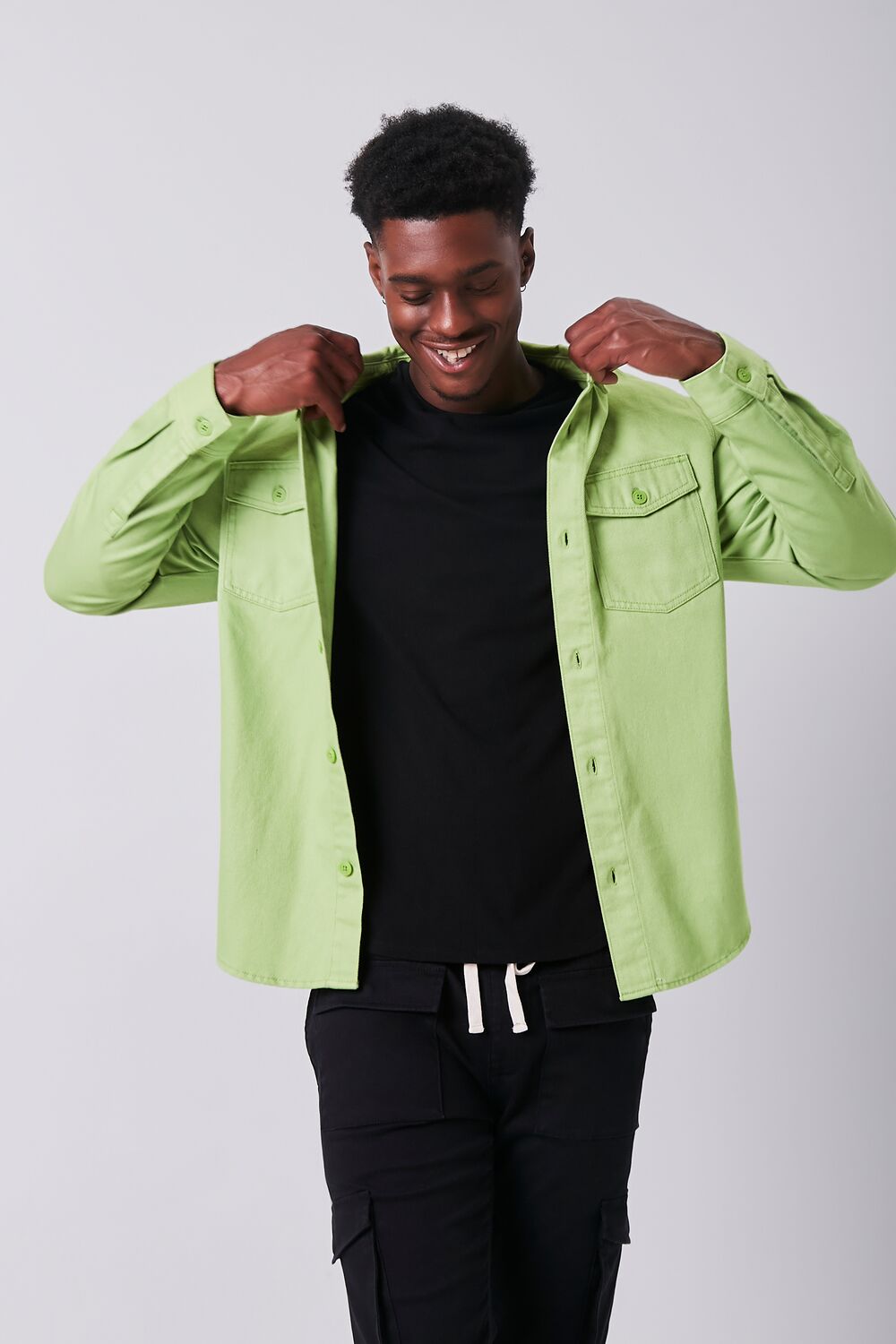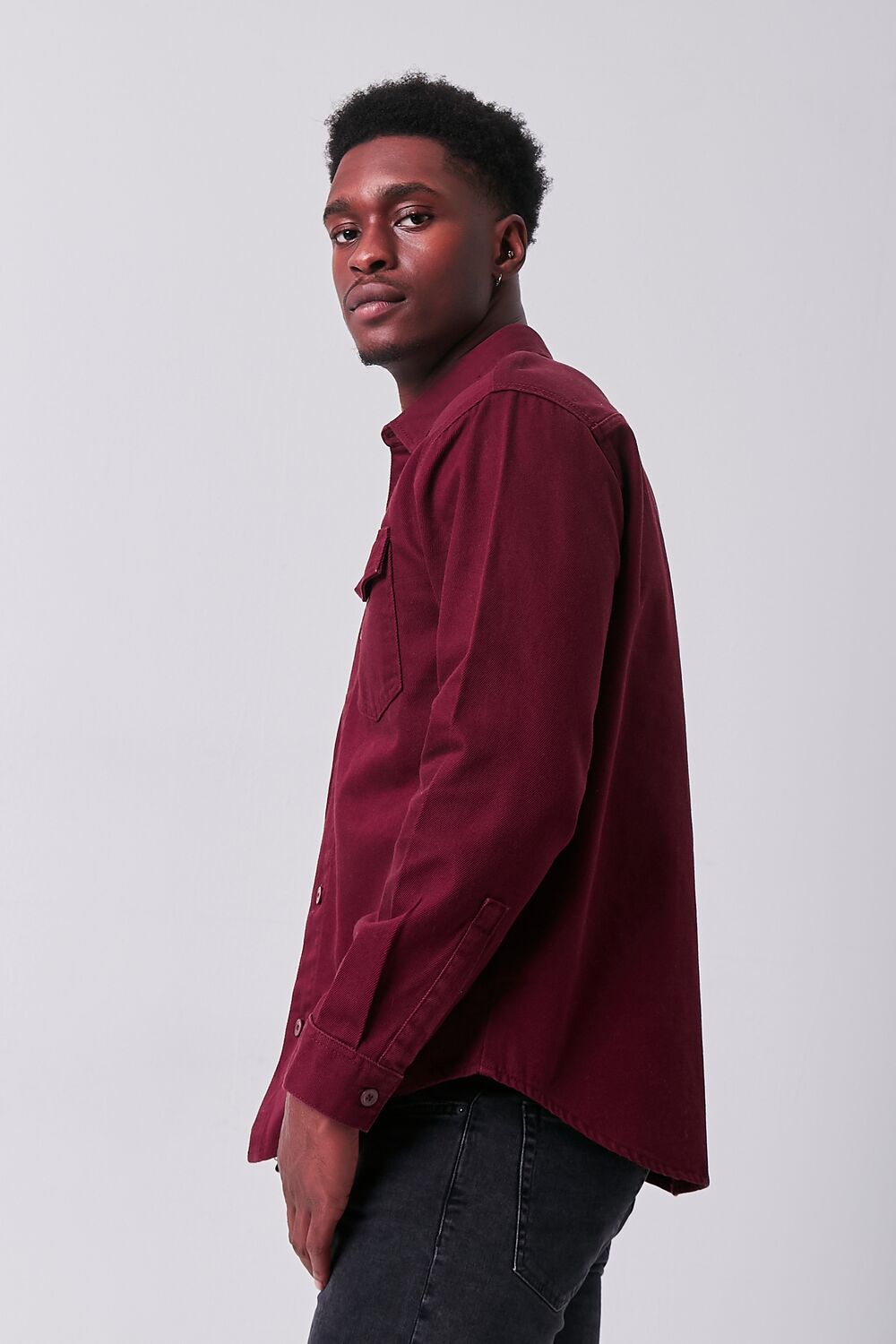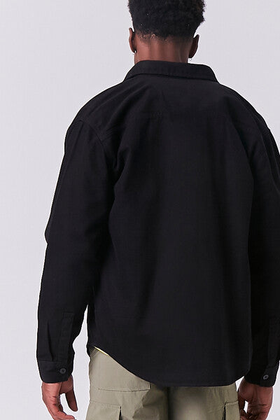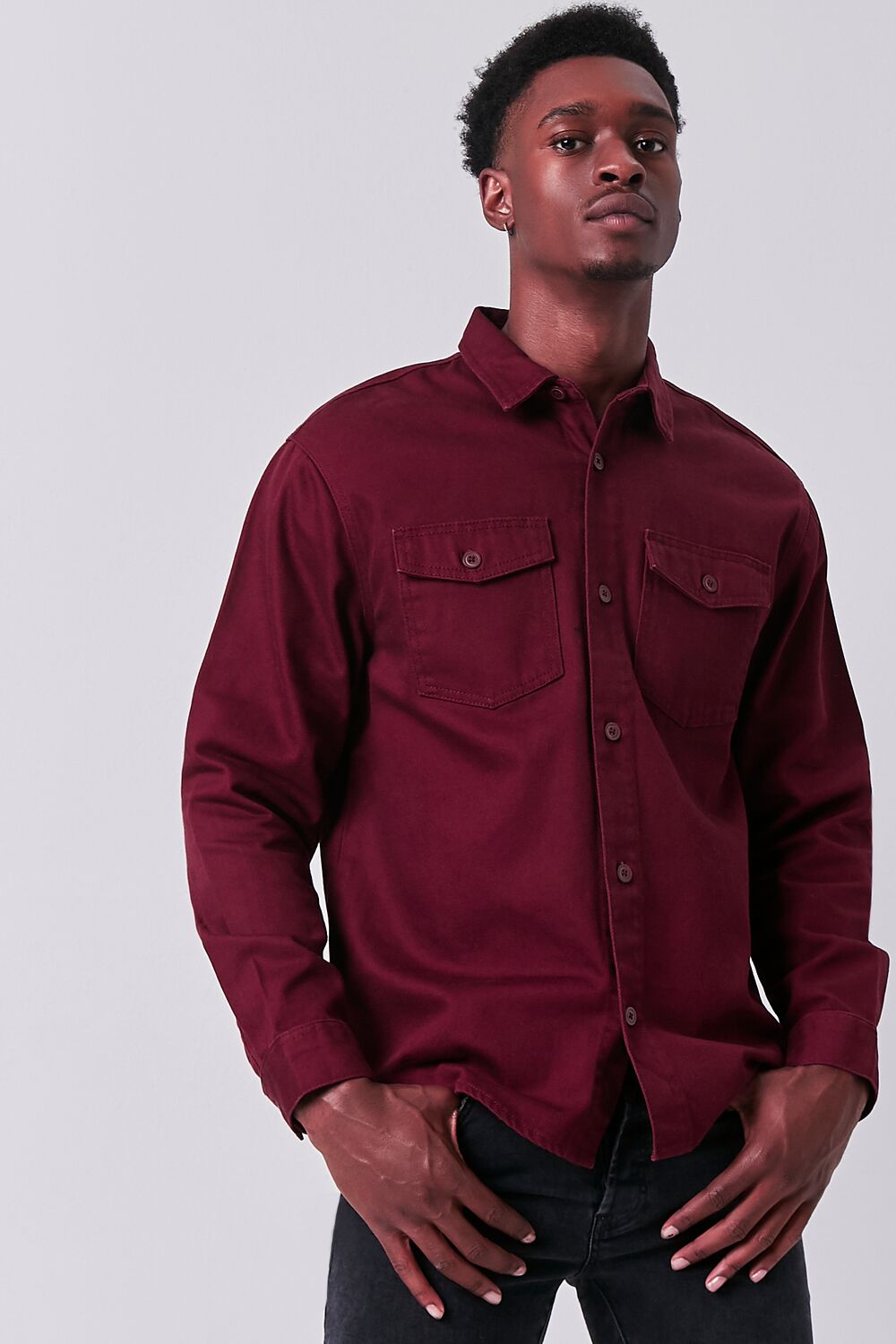 A woven shirt featuring a basic collar. dropped long sleeves. button closures on the chest flap pockets and front. and a scoop hem.