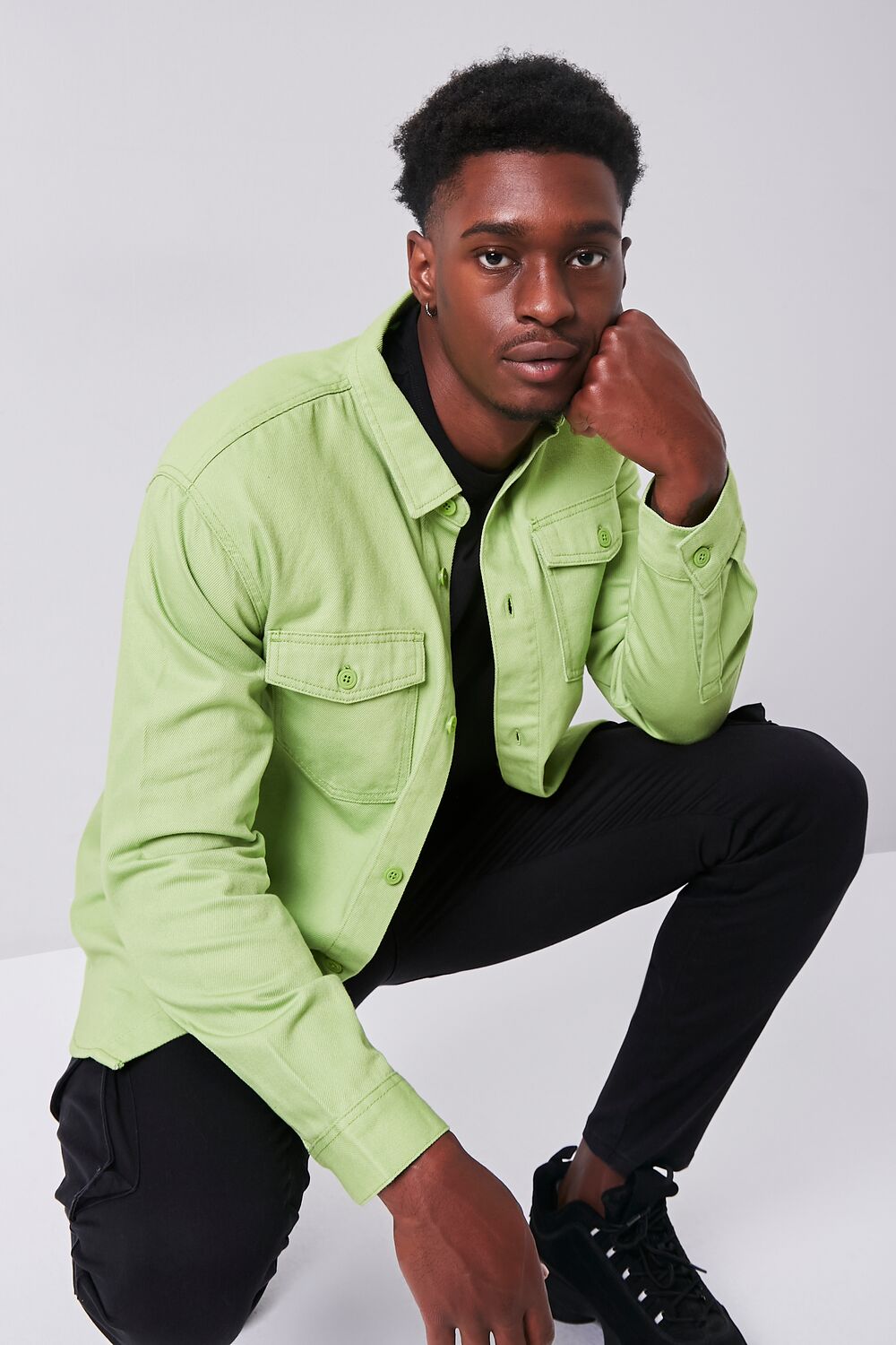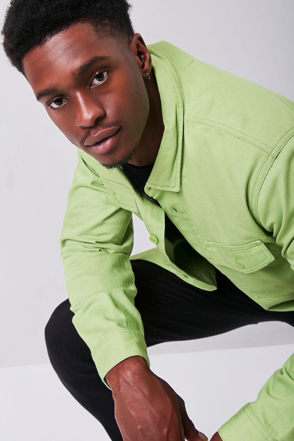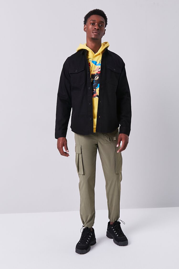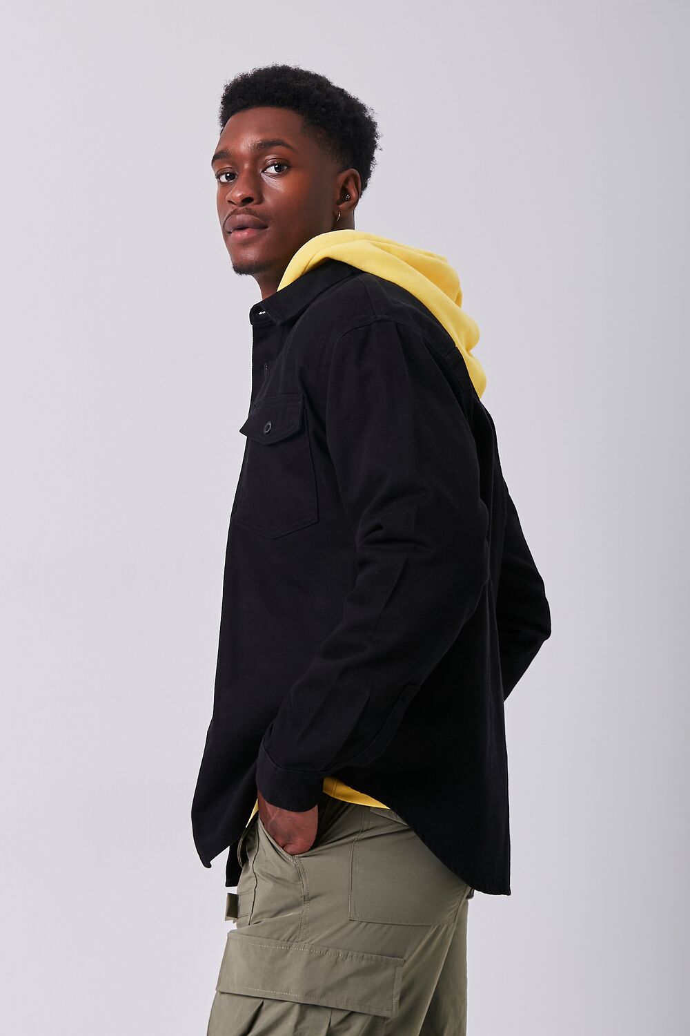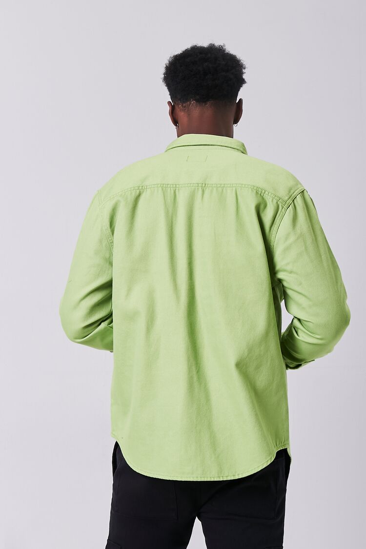 A woven shirt featuring a basic collar. dropped long sleeves. button closures on the chest flap pockets and front. and a scoop hem.
