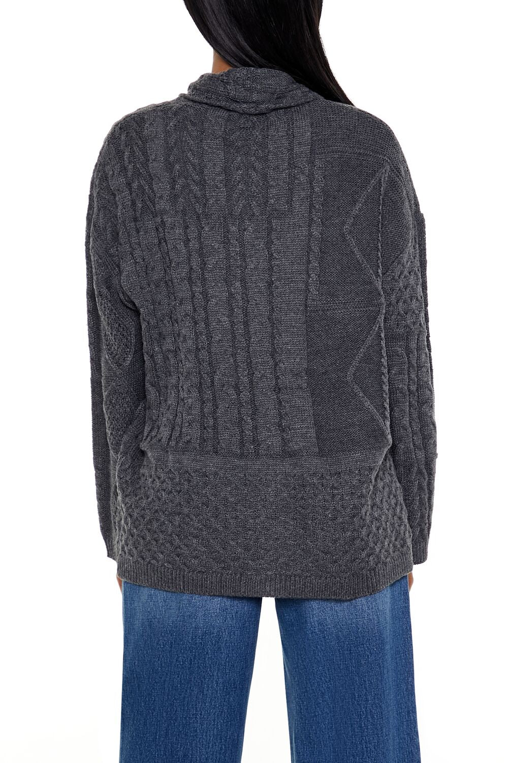 A knit cardigan sweater featuring an allover mixed texture. open front. shawl collar. and long sleeves.