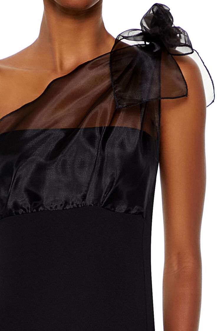 A crepe knit tube dress featuring a mini length. sheer partial overlay. one-shoulder neckline. bow shoulder accent. and a bodycon silhouette.