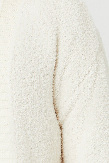 A fuzzy knit cardigan sweater featuring an open front. ribbed trim. and dropped long sleeves.