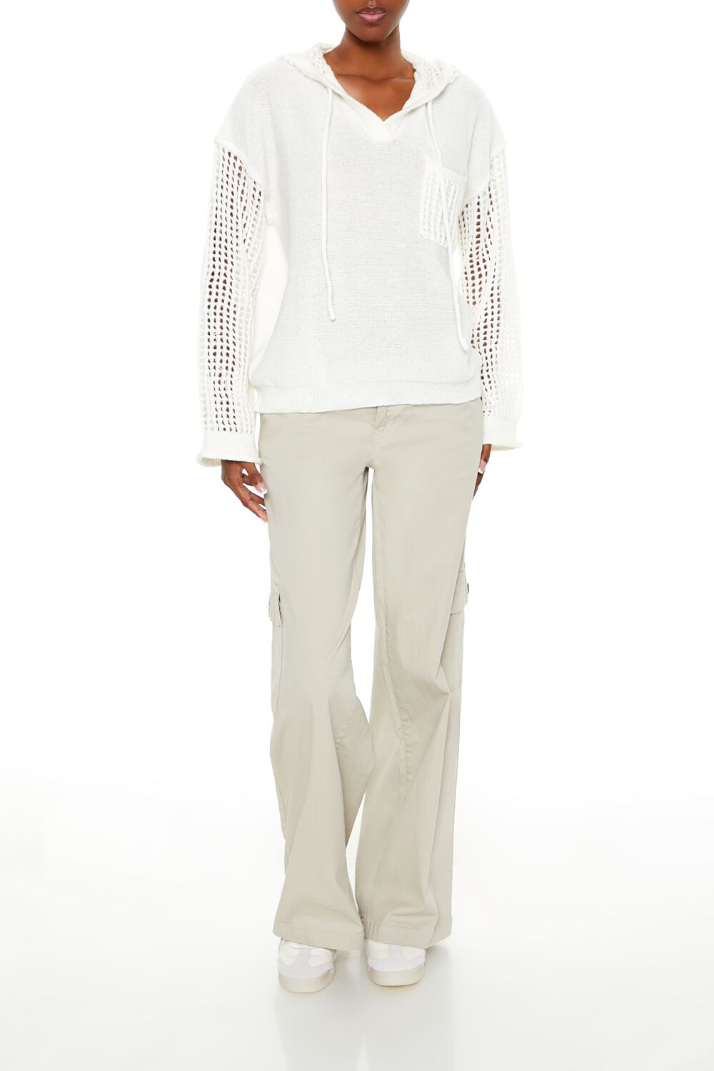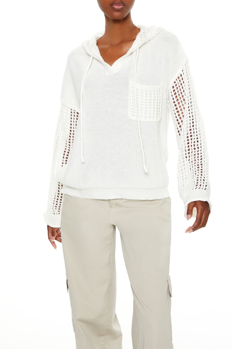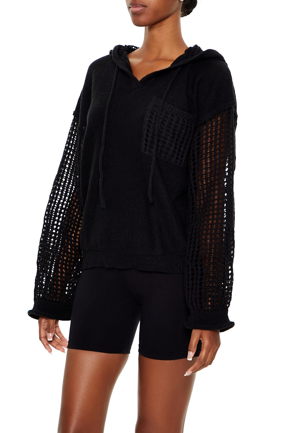A knit hoodie featuring a drawstring hood. front patch pocket. partial open-knit netted construction. and long sleeves.