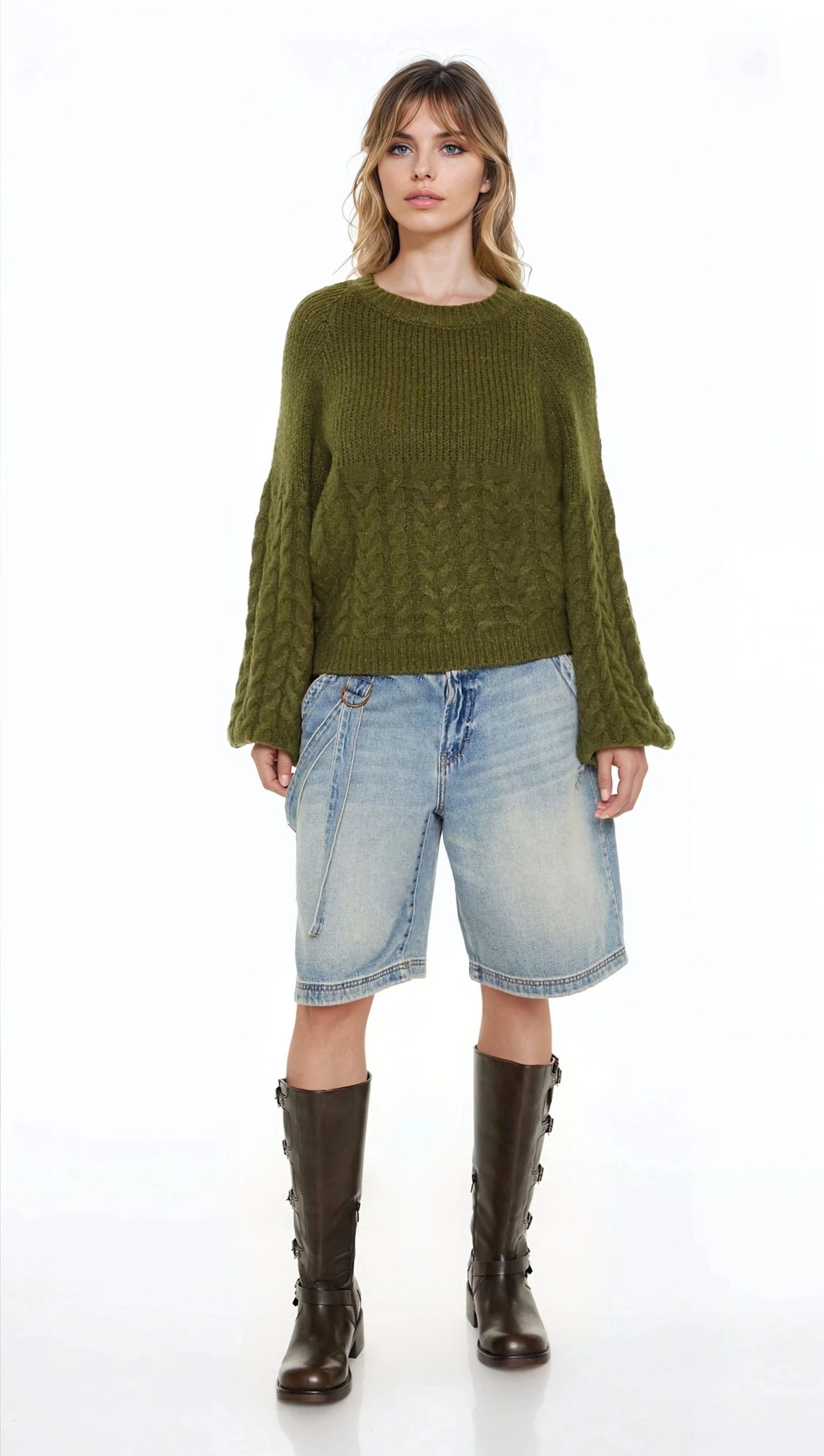 A cable knit sweater featuring a round neckline and long peasant sleeves.