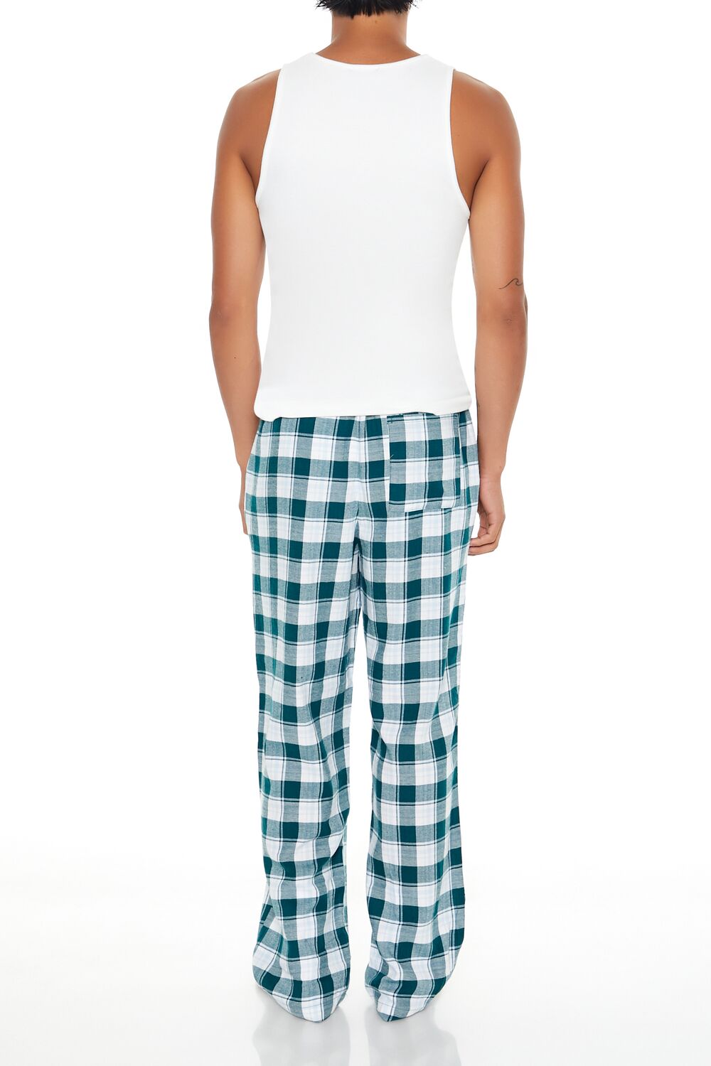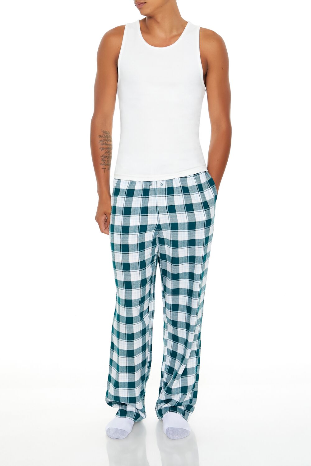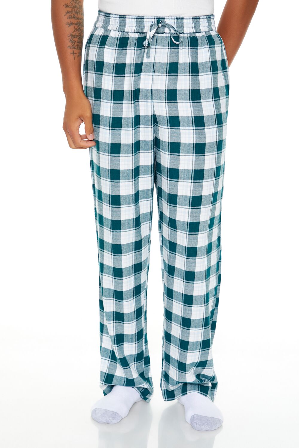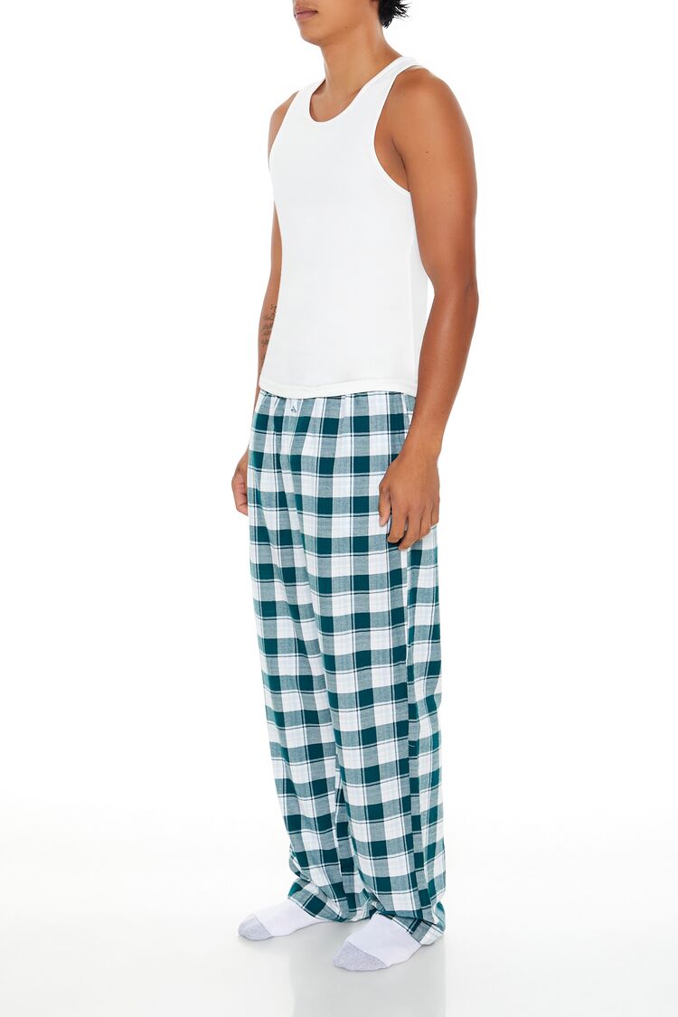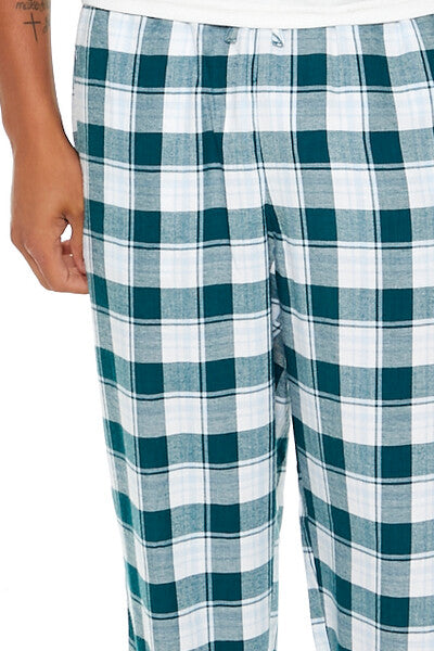 A pair of woven flannel pajama pants featuring an allover plaid pattern. slant front pockets. and a drawstring waistband.