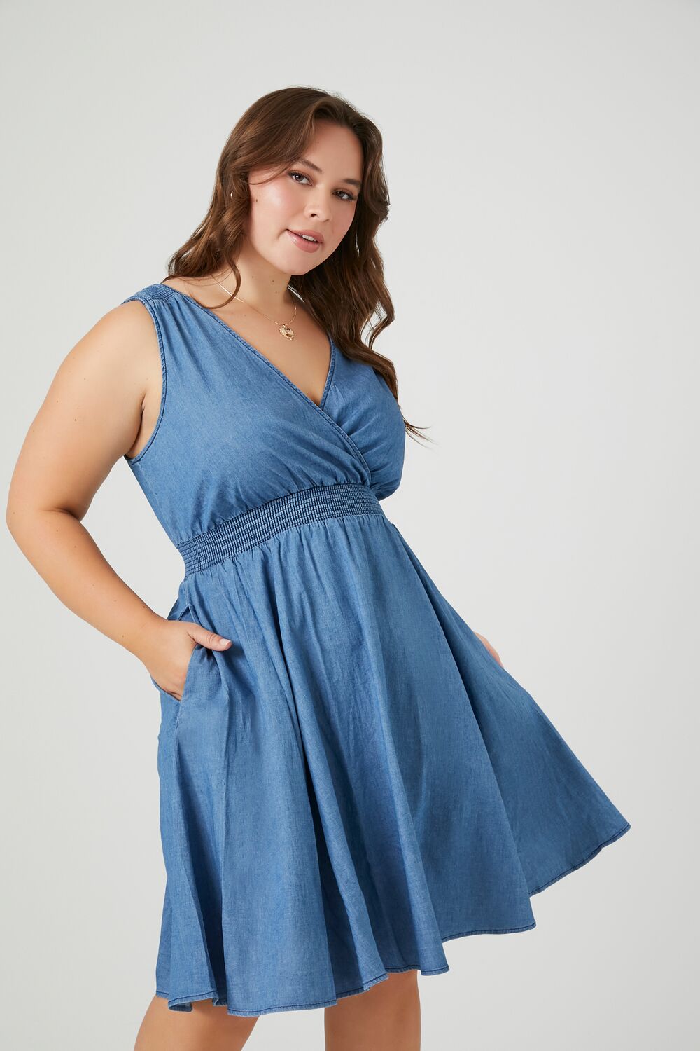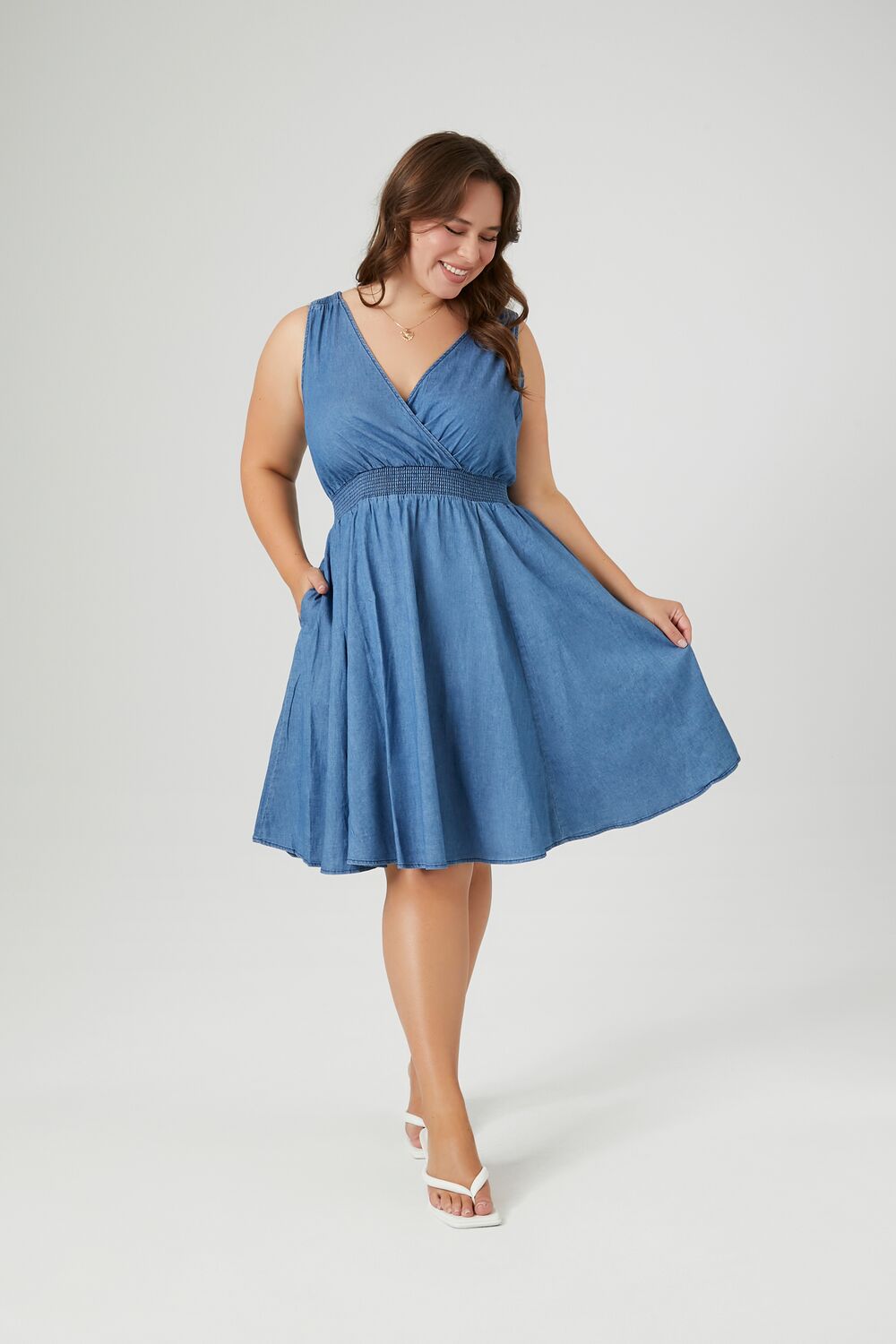 Forever 21+ – Crafted from non-stretch denim. this mini dress features a surplice neckline. sleeveless cut. smocked waist. front slanted pockets. and a fit and flare silhouette.