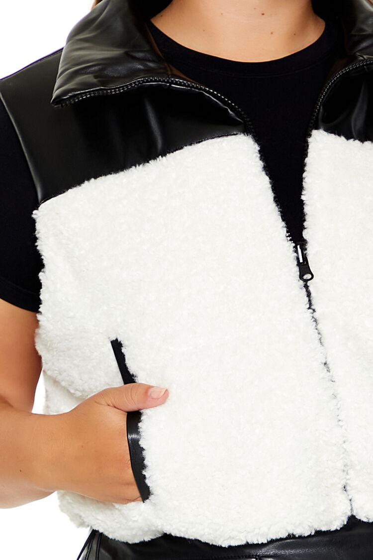 Forever 21+ – A faux leather vest featuring a partial faux shearling construction. funnel neck. zip-up front closure. slanted front pockets. and cropped hem.